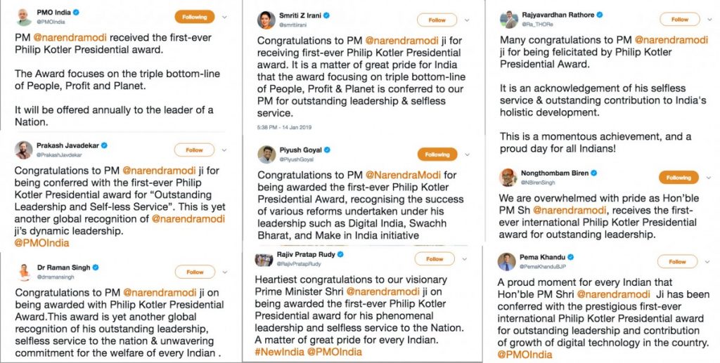 The Philip Kotler Presidential Award adds to a long list of prestigious accolades received by PM @NarendraModi from the International community, reflecting the effectiveness of his style of governance and the far-reaching impact he has made throughout the globe