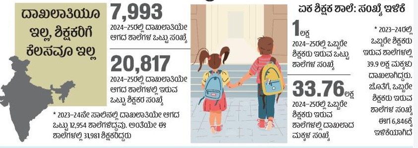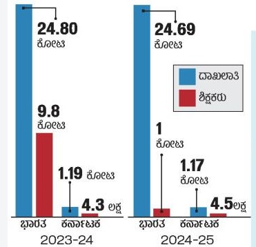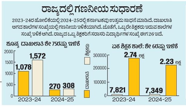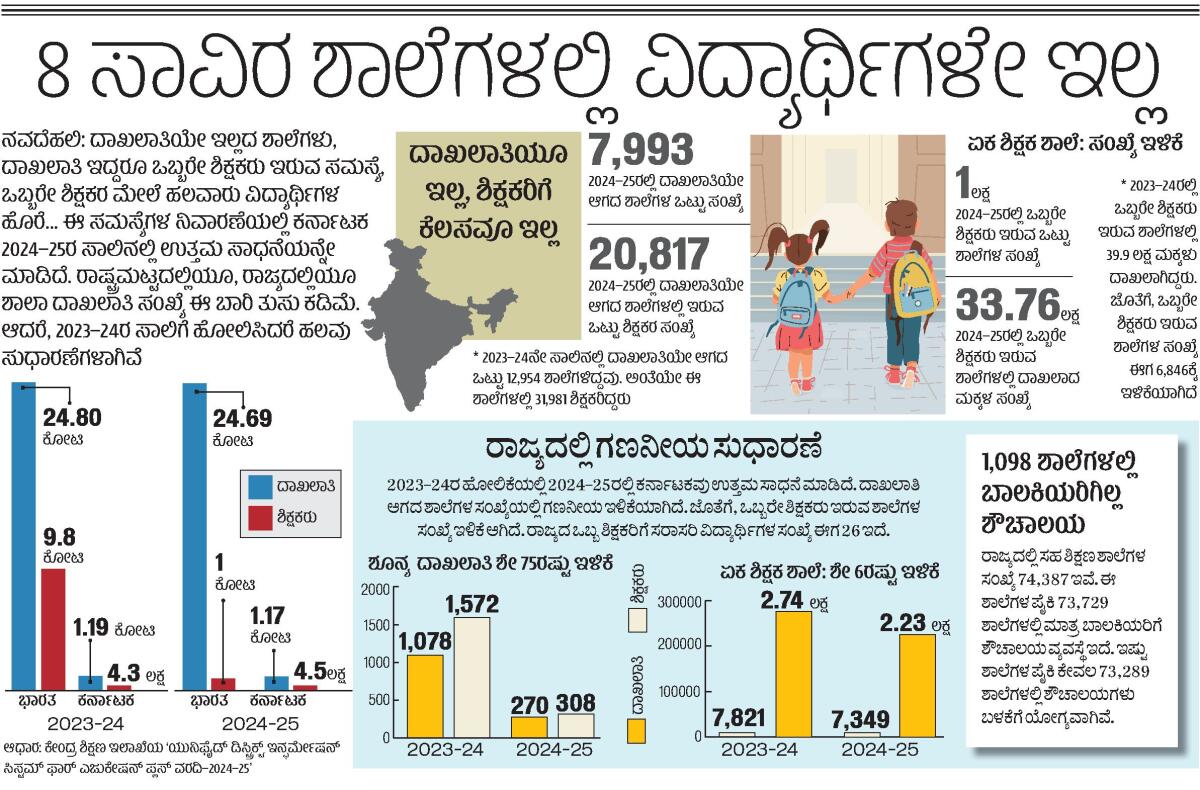 <p><strong>ನವದೆಹಲಿ:</strong> ದಾಖಲಾತಿಯೇ ಇಲ್ಲದ ಶಾಲೆಗಳು, ದಾಖಲಾತಿ ಇದ್ದರೂ ಒಬ್ಬರೇ ಶಿಕ್ಷಕರು ಇರುವ ಸಮಸ್ಯೆ, ಒಬ್ಬರೇ ಶಿಕ್ಷಕರ ಮೇಲೆ ಹಲವಾರು ವಿದ್ಯಾರ್ಥಿಗಳ ಹೊರೆ... ಈ ಸಮಸ್ಯೆಗಳ ನಿವಾರಣೆಯಲ್ಲಿ ಕರ್ನಾಟಕ 2024–25ರ ಸಾಲಿನಲ್ಲಿ ಉತ್ತಮ ಸಾಧನೆಯನ್ನೇ ಮಾಡಿದೆ. ರಾಷ್ಟ್ರಮಟ್ಟದಲ್ಲಿಯೂ, ರಾಜ್ಯದಲ್ಲಿಯೂ ಶಾಲಾ ದಾಖಲಾತಿ ಸಂಖ್ಯೆ ಈ ಬಾರಿ ತುಸು ಕಡಿಮೆ. ಆದರೆ, 2023–24ರ ಸಾಲಿಗೆ ಹೋಲಿಸಿದರೆ ಹಲವು ಸುಧಾರಣೆಗಳಾಗಿವೆ.</p><p><strong>ರಾಜ್ಯದ 1,098 ಶಾಲೆಗಳಲ್ಲಿ ಬಾಲಕಿಯರಿಗಿಲ್ಲ ಶೌಚಾಲಯ</strong></p><p>ರಾಜ್ಯದಲ್ಲಿ ಸಹ ಶಿಕ್ಷಣ ಶಾಲೆಗಳ ಸಂಖ್ಯೆ 74,387 ಇವೆ. ಈ ಶಾಲೆಗಳ ಪೈಕಿ 73,729 ಶಾಲೆಗಳಲ್ಲಿ ಮಾತ್ರವೇ ಬಾಲಕಿಯರಿಗೆ ಶೌಚಾಲಯ ವ್ಯವಸ್ಥೆ ಇದೆ. ಇಷ್ಟು ಶಾಲೆಗಳ ಪೈಕಿ 73,289 ಶಾಲೆಗಳಲ್ಲಿ ಮಾತ್ರವೇ ಈ ಶೌಚಾಲಯಗಳು ಬಳಕೆಗೆ ಯೋಗ್ಯವಾಗಿವೆ.</p>.<p><strong>ಆಧಾರ: </strong>ಕೇಂದ್ರ ಶಿಕ್ಷಣ ಇಲಾಖೆಯ ‘ಯುನಿಫೈಡ್ ಡಿಸ್ಟ್ರಿಕ್ಟ್ ಇನ್ಫೋಮೇಷನ್ ಸಿಸ್ಟಮ್ ಫಾರ್ ಎಜುಕೇಷನ್ ಪ್ಲಸ್ ವರದಿ–2024–25’</p>.ಉತ್ತರ ಕನ್ನಡ: 21 ಸರ್ಕಾರಿ ಶಾಲೆಯಲ್ಲಿ ‘ಶೂನ್ಯ’ ದಾಖಲಾತಿ.ಯಾದಗಿರಿ: 12 ಶಾಲೆಗಳಲ್ಲಿ ದಾಖಲಾತಿ ಶೂನ್ಯ!.ಶೂನ್ಯ ದಾಖಲಾತಿ: ಮಂಡ್ಯ ಜಿಲ್ಲೆಯಲ್ಲಿ 351 ಶಾಲೆಗಳಿಗೆ ಬೀಗ.ಮಂಗಳೂರು: 14 ಶಾಲೆಗಳಲ್ಲಿ ದಾಖಲಾತಿ ಶೂನ್ಯ .<div><p><strong>ಪ್ರಜಾವಾಣಿ ಆ್ಯಪ್ ಇಲ್ಲಿದೆ: <a href="https://play.google.com/store/apps/details?id=com.tpml.pv">ಆಂಡ್ರಾಯ್ಡ್ </a>| <a href="https://apps.apple.com/in/app/prajavani-kannada-news-app/id1535764933">ಐಒಎಸ್</a> | <a href="https://whatsapp.com/channel/0029Va94OfB1dAw2Z4q5mK40">ವಾಟ್ಸ್ಆ್ಯಪ್</a>, <a href="https://www.twitter.com/prajavani">ಎಕ್ಸ್</a>, <a href="https://www.fb.com/prajavani.net">ಫೇಸ್ಬುಕ್</a> ಮತ್ತು <a href="https://www.instagram.com/prajavani">ಇನ್ಸ್ಟಾಗ್ರಾಂ</a>ನಲ್ಲಿ ಪ್ರಜಾವಾಣಿ ಫಾಲೋ ಮಾಡಿ.</strong></p></div>