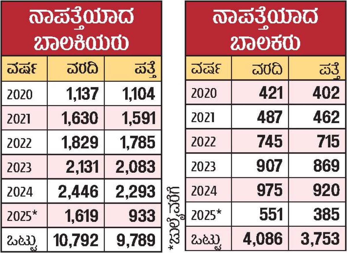 <p><strong>ಬೆಂಗಳೂರು:</strong> ರಾಜ್ಯದಲ್ಲಿ ಮಕ್ಕಳ ನಾಪತ್ತೆ, ಅಪಹರಣ ಪ್ರಕರಣಗಳು ವರ್ಷದಿಂದ ವರ್ಷಕ್ಕೆ ಹೆಚ್ಚಾಗುತ್ತಿದ್ದು, ಇದರಲ್ಲಿ ಬಾಲಕಿಯರ ಸಂಖ್ಯೆ ಅಧಿಕವಾಗಿದೆ.</p>.<p>2020ರಿಂದ 2025ರ (ಜುಲೈವರೆಗೆ) ನಡುವೆ ನಾಪತ್ತೆಯಾಗಿದ್ದ 14,878 ಮಕ್ಕಳ ಪೈಕಿ 13,542 ಮಕ್ಕಳು ಪೋಷಕರ ಮಡಿಲು ಸೇರಿದ್ದಾರೆ. ನಾಪತ್ತೆ, ಅಪಹರಣಕ್ಕೆ ಒಳಗಾದ ಪ್ರಕರಣಗಳಲ್ಲಿ ಬೆಂಗಳೂರು ನಗರ ಜಿಲ್ಲೆ ಅಗ್ರಸ್ಥಾನದಲ್ಲಿದೆ. ದಾವಣಗೆರೆ, ಉಡುಪಿ, ದಕ್ಷಿಣ ಕನ್ನಡ, ಹಾವೇರಿ, ಚಿತ್ರದುರ್ಗ, ತುಮಕೂರು, ಮೈಸೂರು ನಂತರದ ಸ್ಥಾನದಲ್ಲಿವೆ.</p>.<p>ಗೃಹ ಇಲಾಖೆಯ ಅಂಕಿ ಅಂಶದ ಪ್ರಕಾರ, 2025ರ ಜುಲೈ ಅಂತ್ಯದವರೆಗೆ ಒಟ್ಟು 2,170 ಮಕ್ಕಳು ಕಾಣೆಯಾಗಿದ್ದಾರೆ. ಇವರಲ್ಲಿ ಬಾಲಕರ ಸಂಖ್ಯೆ 551 ಮತ್ತು ಬಾಲಕಿಯರ ಸಂಖ್ಯೆ 1,619. ಐದೂವರೆ ವರ್ಷದಲ್ಲಿ ನಾಪತ್ತೆಯಾದ 10,792 ಬಾಲಕಿಯರ ಪೈಕಿ 1,003 ಹಾಗೂ 4,086 ಬಾಲಕರ ಪೈಕಿ 333 ಮಕ್ಕಳು ಪತ್ತೆಯಾಗಿಲ್ಲ. ಈ ಪ್ರಕರಣಗಳಲ್ಲಿ ಐದು ವರ್ಷದಲ್ಲಿ 634 ಆರೋಪಿಗಳನ್ನು ಪೊಲೀಸರು ಬಂಧಿಸಿ, ಜೈಲಿಗೆ ಕಳುಹಿಸಿದ್ದಾರೆ. ಈ ಎಲ್ಲಾ ಪ್ರಕರಣಗಳನ್ನು ‘ಮಕ್ಕಳ ಕಾಣೆ/ಅಪಹರಣ’ ಪ್ರಕರಣಗಳು ಎಂದು ಗುರುತಿಸಲಾಗಿದೆ.</p>.<p>ಕೌಟುಂಬಿಕ ಕಲಹ, ತಂದೆ–ತಾಯಿ ಜಗಳ, ಪೋಷಕರ ವಿಚ್ಛೇದನದಿಂದ ನೊಂದು ಮಕ್ಕಳು ಮನೆ ತೊರೆಯುತ್ತಿದ್ದಾರೆ. ಹದಿಹರೆಯದವರು ಪ್ರೀತಿ, ಪ್ರೇಮದ ಬಲೆಗೆ ಸಿಲುಕಿ ಮನೆ ಬಿಟ್ಟು ಹೋಗುತ್ತಿದ್ದಾರೆ. ಇದಲ್ಲದೆ, ಬಾಲ ಕಾರ್ಮಿಕರಾಗಿ ದುಡಿಸುವುದು, ಹಣದಾಸೆ ತೋರಿಸಿ ವೇಶ್ಯಾವಾಟಿಕೆ ಜಾಲಕ್ಕೆ ತಳ್ಳುವುದು, ಅಂಗಾಂಗ ಮಾರಾಟ ದಂಧೆ, ಭಿಕ್ಷಾಟನೆಯಲ್ಲಿ ತೊಡಗಿಸಲು ಮಕ್ಕಳ ಅಪಹರಣವಾಗುತ್ತಿದೆ.</p>.<p>‘ನಾಪತ್ತೆಯಾದ ಮಾಹಿತಿ ಲಭಿಸಿದ ಕೂಡಲೇ ದೂರು ನೀಡಿದರೆ ಮಕ್ಕಳನ್ನು ಪತ್ತೆ ಮಾಡಬಹುದು. ಕೆಲವರು ತಡವಾಗಿ ದೂರು ನೀಡುತ್ತಾರೆ. ನಾಪತ್ತೆಯಾದ ಮೊದಲ 24 ಗಂಟೆಗಳಲ್ಲಿ (ಗೋಲ್ಡನ್ ಅವರ್) ಪೊಲೀಸರಿಗೆ ದೂರು ಸಲ್ಲಿಸಬೇಕು. ಫೋಟೊ, ಇತರೆ ಮಾಹಿತಿ ನೀಡಬೇಕು. ಇಲಾಖೆಯ ಅಧಿಕೃತ ಗ್ರೂಪ್ನಲ್ಲಿ ಮಾಹಿತಿ ಹಂಚಿಕೊಳ್ಳಲಾಗುವುದು. ಪತ್ತೆಯಾದ ಬಳಿಕ ಅವರನ್ನು ಪಾಲಕರಿಗೆ ಒಪ್ಪಿಸಲಾಗುವುದು ’ ಎಂದು ಪೊಲೀಸ್ ಅಧಿಕಾರಿಗಳು ಹೇಳುತ್ತಾರೆ. </p>.<p>‘ಸಾಮಾಜಿಕ ಜಾಲತಾಣದ ಬಳಕೆ ಹೆಚ್ಚಾದ ಬಳಿಕೆ ನಾಪತ್ತೆಯಾಗುವ ಮಕ್ಕಳ ಸಂಖ್ಯೆ ಏರುಗತಿಯಲ್ಲಿದೆ. ನಾಪತ್ತೆಯಾದವರನ್ನು ಸಿಸಿ ಟಿವಿ ಕ್ಯಾಮೆರಾ, ಮೊಬೈಲ್ ನೆಟ್ವರ್ಕ್ ಸುಳಿವು ಆಧರಿಸಿ ಪತ್ತೆ ಮಾಡಲಾಗುತ್ತದೆ’ ಎಂದು ಹೇಳಿದರು.</p>.<p><strong>ಮಕ್ಕಳ ನಾಪತ್ತೆಗೆ ಮುಖ್ಯ ಕಾರಣ?:</strong> ‘ಪೋಷಕರ ನಿರ್ಲಕ್ಷ್ಯ, ಬಡತನದ ನೋವು ಹಾಗೂ ನಗರದ ವ್ಯಾಮೋಹಕ್ಕೆ ಮನೆ ಬಿಟ್ಟು ಹೋಗುವುದು ಮಕ್ಕಳ ನಾಪತ್ತೆಗೆ ಪ್ರಮುಖ ಕಾರಣ. ಸ್ನೇಹಿತರ ಸಹವಾಸ, ದುಶ್ಚಟಗಳ ಕಾರಣದಿಂದ ಮನೆ ಬಿಡುವ ಮಕ್ಕಳೂ ಇದ್ದಾರೆ. ಪರೀಕ್ಷಾ ಭಯ ಹಾಗೂ ಅನುತ್ತೀರ್ಣಗೊಂಡಿದ್ದರಿಂದ ಪೋಷಕರಿಂದ ಏಟು ತಿನ್ನಬೇಕಾಗುತ್ತದೆ ಎಂಬ ಆತಂಕದಿಂದ ಮನೆ ಬಿಟ್ಟು ಓಡಿ ಹೋಗುತ್ತಾರೆ. ಚಿಣ್ಣರನ್ನು ಭಿಕ್ಷಾಟನೆಗೆ ಬಳಸಿಕೊಳ್ಳುವ, ಅಪಹರಣ ಮಾಡುವ ಸಿಂಡಿಕೇಟ್ಗಳು ಸಕ್ರಿಯವಾಗಿವೆ’ ಎಂಬುದು ಮಕ್ಕಳ ಹಕ್ಕುಗಳ ಹೋರಾಟಗಾರರ ಆರೋಪ.</p>.<h2>‘ಪತ್ತೆ ಹಚ್ಚಿ ಪೋಷಕರಿಗೆ ಒಪ್ಪಿಸಿ’</h2><p>‘ನಾಪತ್ತೆಯಾಗಿರುವ ಸಾವಿರಕ್ಕೂ ಹೆಚ್ಚು ಮಕ್ಕಳನ್ನು ಪೊಲೀಸರು ಪತ್ತೆ ಹಚ್ಚಿ ಪೋಷಕರಿಗೆ ಒಪ್ಪಿಸಬೇಕು. ಪ್ರತಿಯೊಂದು ಮಗು 18 ವರ್ಷ ಪೂರ್ಣಗೊಳ್ಳು ವವರೆಗೆ ಕುಟುಂಬ ಮತ್ತು ಸಮಾಜದಲ್ಲಿ ಗೌರವದಿಂದ ಬದುಕಬೇಕು. ಪತ್ತೆಯಾಗದೇ ಇರುವ ಮಕ್