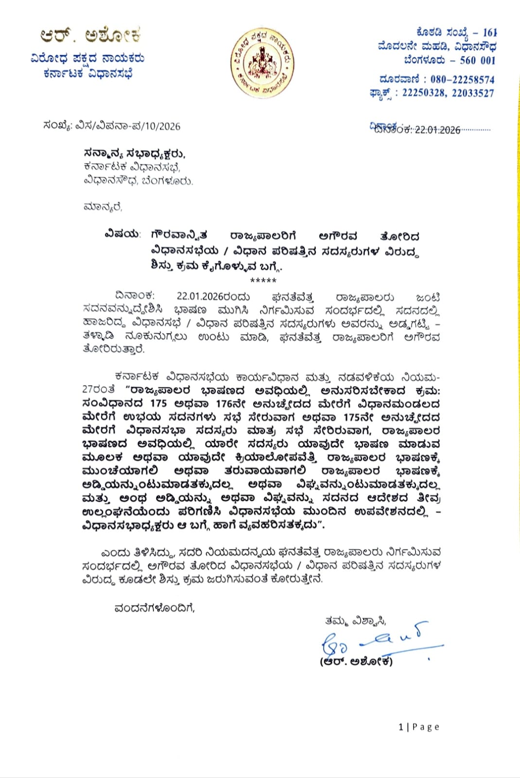 <p><strong>ಬೆಂಗಳೂರು</strong>: ರಾಜ್ಯಪಾಲ ಥಾವರಚಂದ್ ಗೆಹಲೋತ್ ಅವರಿಗೆ ಅಗೌರವ ತೋರಿದ ವಿಧಾನಸಭೆ ಮತ್ತು ವಿಧಾನ ಪರಿಷತ್ತಿನ ಸದಸ್ಯರುಗಳ ವಿರುದ್ಧ ಕೂಡಲೇ ಶಿಸ್ತು ಕ್ರಮ ಜರುಗಿಸುವಂತೆ ವಿಧಾನಸಭೆ ವಿರೋಧ ಪಕ್ಷದ ನಾಯಕ ಆರ್. ಅಶೋಕ ಸಭಾಧ್ಯಕ್ಷರಿಗೆ ಮನವಿ ಮಾಡಿದ್ದಾರೆ.</p><p>‘ರಾಜ್ಯಪಾಲರು ಭಾಷಣ ಮುಗಿಸಿ ನಿರ್ಗಮಿಸುವ ಸಂದರ್ಭದಲ್ಲಿ ಸದನದಲ್ಲಿ ಹಾಜರಿದ್ದ ವಿಧಾನಸಭೆ ಮತ್ತು ವಿಧಾನ ಪರಿಷತ್ತಿನ ಸದಸ್ಯರುಗಳು ಅವರನ್ನು ಅಡ್ಡಗಟ್ಟಿ, ತಳ್ಳಾಡಿ ನೂಕುನುಗ್ಗಲು ಉಂಟು ಮಾಡಿ, ರಾಜ್ಯಪಾಲರಿಗೆ ಆಗೌರವ ತೋರಿದ್ದಾರೆ’ ಎಂದು ಅವರು ಹೇಳಿದ್ದಾರೆ.</p>.<p>‘ಸಂವಿಧಾನದ 175ನೇ ಅನುಚ್ಛೇದದ ಪ್ರಕಾರ ಸದನದ ಆದೇಶದ ಉಲ್ಲಂಘಿಸಿದ ಸದಸ್ಯರ ವಿರುದ್ಧ ಶಿಸ್ತು ಕ್ರಮ ತೆಗೆದುಕೊಳ್ಳಬೇಕು’ ಎಂದು ಹೇಳಿದ್ದಾರೆ.</p><p>ರಾಜ್ಯಪಾಲ ಥಾವರಚಂದ್ ಗೆಹಲೋತ್ ಅವರು ವಿಧಾನ ಮಂಡಲದ ಜಂಟಿ ಅಧಿವೇಶನಕ್ಕೆ ಆಗಮಿಸಿ ಕೇವಲ ಒಂದು ಸಾಲು ಭಾಷಣ ಓದಿ ನಿರ್ಗಮಿಸುತ್ತಿದ್ದಂತೆಯೇ ವಿಧಾನಪರಿಷತ್ ಕಾಂಗ್ರೆಸ್ ಸದಸ್ಯರಾದ ಎಸ್. ರವಿ, ಬಿ.ಕೆ. ಹರಿಪ್ರಸಾದ್ ಸೇರಿದಂತೆ ಕೆಲವು ಶಾಸಕರು ತಡೆಯಲು ಮುಂದಾಗಿದ್ದರು.</p>.<div><p><strong>ಪ್ರಜಾವಾಣಿ ಆ್ಯಪ್ ಇಲ್ಲಿದೆ: <a href="https://play.google.com/store/apps/details?id=com.tpml.pv">ಆಂಡ್ರಾಯ್ಡ್ </a>| <a href="https://apps.apple.com/in/app/prajavani-kannada-news-app/id1535764933">ಐಒಎಸ್</a> | <a href="https://whatsapp.com/channel/0029Va94OfB1dAw2Z4q5mK40">ವಾಟ್ಸ್ಆ್ಯಪ್</a>, <a href="https://www.twitter.com/prajavani">ಎಕ್ಸ್</a>, <a href="https://www.fb.com/prajavani.net">ಫೇಸ್ಬುಕ್</a> ಮತ್ತು <a href="https://www.instagram.com/prajavani">ಇನ್ಸ್ಟಾಗ್ರಾಂ</a>ನಲ್ಲಿ ಪ್ರಜಾವಾಣಿ ಫಾಲೋ ಮಾಡಿ.</strong></p></div>