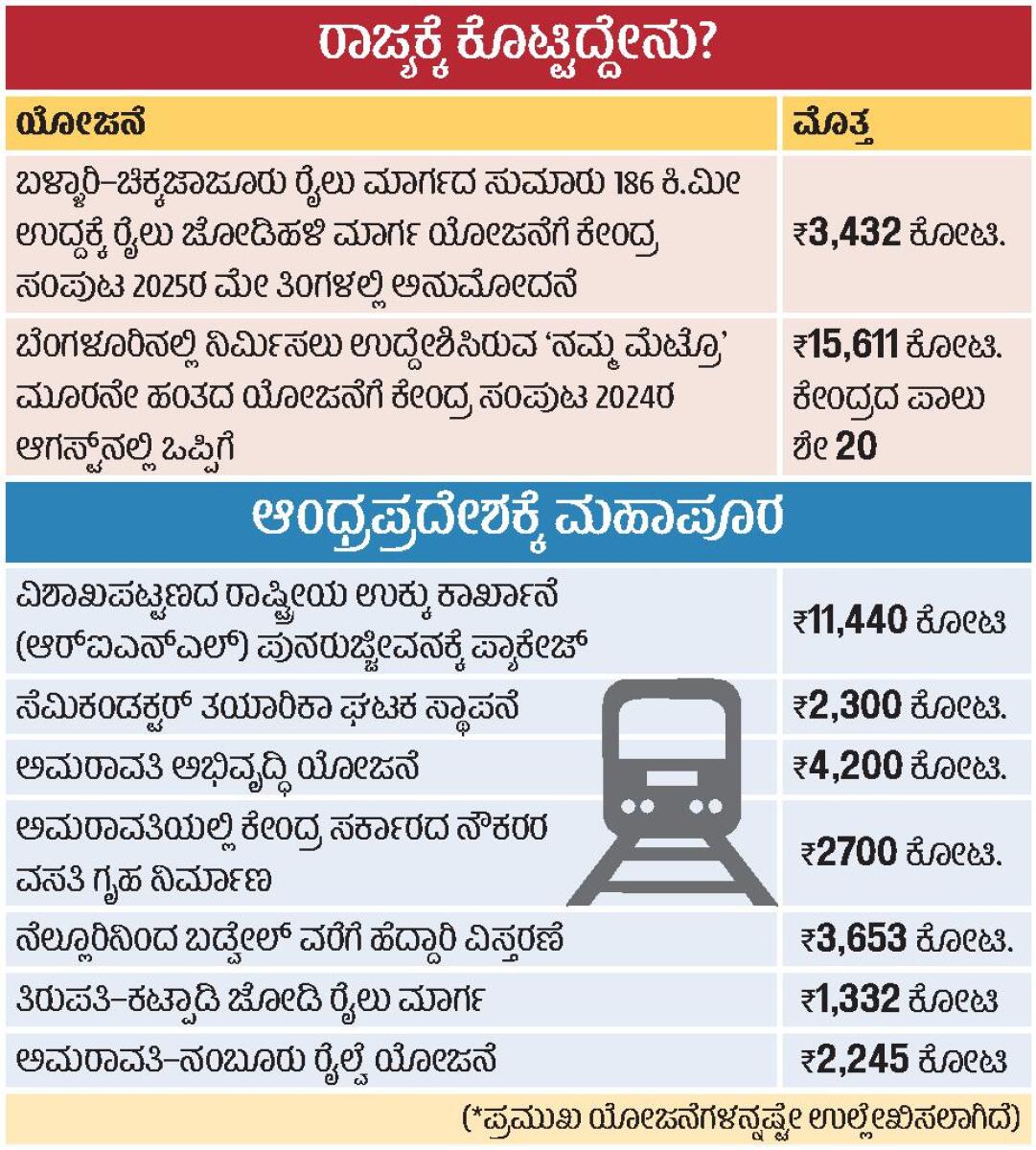 <p><strong>ನವದೆಹಲಿ:</strong> ಕೇಂದ್ರದಲ್ಲಿ ಎನ್ಡಿಎ ಮೈತ್ರಿಕೂಟವು ಮೂರನೇ ಅವಧಿಗೆ ಅಧಿಕಾರಕ್ಕೆ ಬಂದ ಬಳಿಕ ಕರ್ನಾಟಕದ ಅಭಿವೃದ್ಧಿ ಯೋಜನೆಗಳಿಗೆ ಸಿಕ್ಕಿದ್ದು ಚಿಕ್ಕಾಸು. ಸರ್ಕಾರಕ್ಕೆ ಊರುಗೋಲು ಆಗಿರುವ ಮಿತ್ರರ ಸರ್ಕಾರ ಇರುವ ಆಂಧ್ರ ಪ್ರದೇಶ ಹಾಗೂ ಬಿಹಾರಕ್ಕೆ ಕೇಂದ್ರ ಸರ್ಕಾರ ಭರಪೂರ ಅನುದಾನ ನೀಡಿದೆ. ಕೇಂದ್ರ ಸರ್ಕಾರವು ಸಚಿವ ಸಂಪುಟದ ನಿರ್ಧಾರಗಳ ಮೂಲಕ ಈ ರಾಜ್ಯಗಳ ಅಭಿವೃದ್ಧಿ ಯೋಜನೆಗಳಿಗೆ ತಲಾ ₹1 ಲಕ್ಷ ಕೋಟಿಗೂ ಅಧಿಕ ಹಣ ಕೊಟ್ಟಿದೆ.</p>.<p>ಕಳೆದ 17 ತಿಂಗಳುಗಳಲ್ಲಿ ಕೇಂದ್ರ ಸಚಿವ ಸಂಪುಟವು ರಾಜ್ಯದ ಎರಡು ಯೋಜನೆಗಳಿಗಷ್ಟೇ ಅನುಮೋದನೆ ಕೊಟ್ಟಿದೆ. ₹3,432 ಕೋಟಿ ಮೊತ್ತದ ಬಳ್ಳಾರಿ–ಚಿಕ್ಕಜಾಜೂರು ರೈಲು ಮಾರ್ಗ ಹಾಗೂ ಬೆಂಗಳೂರಿನ ನಮ್ಮ ಮೆಟ್ರೊ ಮೂರನೇ ಹಂತದ ಯೋಜನೆಗೆ ಕೇಂದ್ರದಿಂದ ಹಸಿರು ನಿಶಾನೆ ಸಿಕ್ಕಿದೆ. ರಾಜ್ಯ ಸರ್ಕಾರ ಪ್ರಸ್ತಾವ ಸಲ್ಲಿಸಿದ 19 ತಿಂಗಳುಗಳು ಕಳೆದ ಬಳಿಕವಷ್ಟೇ ಮೆಟ್ರೊ ಯೋಜನೆಗೆ ಅನುಮತಿ ನೀಡಿತ್ತು. ಇದರಲ್ಲಿ ಕೇಂದ್ರದ ಪಾಲು ಶೇ 20ರಷ್ಟು. </p>.<p>ಮಿತ್ರ ಪಕ್ಷವನ್ನು ಸಂತೃಪ್ತಿಪಡಿಸಲು ಕೇಂದ್ರವು ಆಂಧ್ರ ಪ್ರದೇಶಕ್ಕೆ ಮೊಗೆ ಮೊಗೆದು ಯೋಜನೆಗಳನ್ನು ನೀಡಿದೆ. ಆಂಧ್ರ ಪ್ರದೇಶದಲ್ಲಿ 2025ರ ಜನವರಿಯಲ್ಲಿ ನಡೆದ ಕಾರ್ಯಕ್ರಮವೊಂದರಲ್ಲಿ ಪಾಲ್ಗೊಂಡಿದ್ದ ಕೇಂದ್ರ ಗೃಹ ಸಚಿವ ಅಮಿತ್ ಶಾ, ‘2024ರ ಜೂನ್ನಿಂದ ಇಲ್ಲಿಯವರೆಗೆ ಆಂಧ್ರ ಪ್ರದೇಶಕ್ಕೆ ಕೇಂದ್ರ ಸರ್ಕಾರವು ₹3 ಲಕ್ಷ ಕೋಟಿ ಆರ್ಥಿಕ ಸಹಾಯ ನೀಡಿದೆ’ ಎಂದು ಹೇಳಿಕೊಂಡಿದ್ದರು. ಸಚಿವರ ಈ ಮಾತೇ ನೆರೆ ರಾಜ್ಯದ ಮೇಲಿನ ಪ್ರೀತಿಗೆ ಸಾಕ್ಷಿ. ಇದರಲ್ಲಿ ತೆರಿಗೆ ಪಾಲು, ಸಹಾಯಾನುದಾನ ಹಾಗೂ ಕೇಂದ್ರದ ಪ್ರಾಯೋಜಿತ ಯೋಜನೆಗಳು ಸೇರಿಲ್ಲ. ಮತ್ತೊಂದೆಡೆ, ಕೇಂದ್ರ ಸರ್ಕಾರದ ಮಧ್ಯಸ್ಥಿಕೆ ಹಾಗೂ ಚಂದ್ರಬಾಬು ನಾಯ್ಡು ಅವರ ಚತುರ ನಡೆಯಿಂದಾಗಿ ಗೂಗಲ್ನ ಎಐ ಡೇಟಾ ಸೆಂಟರ್ ವಿಶಾಖಪಟ್ಟಣದಲ್ಲಿ ಸ್ಥಾಪನೆಯಾಗಲಿದೆ. ₹87,250 ಕೋಟಿ ಮೊತ್ತದ ಈ ಕೇಂದ್ರ ಸ್ಥಾಪನೆಗಾಗಿ ಇತ್ತೀಚೆಗೆ ಒಪ್ಪಂದ ಮಾಡಿಕೊಳ್ಳಲಾಗಿದೆ. </p>.<p>ಕರ್ನಾಟಕದ 24 ಇಲಾಖೆಗಳ ಪ್ರಸ್ತಾವಗಳು ಅನುದಾನಕ್ಕಾಗಿ ಹಾಗೂ ಅನುಮೋದನೆಗಾಗಿ ವರ್ಷಗಳಿಂದ ಕೇಂದ್ರದ ವಿವಿಧ ಸಚಿವಾಲಯಗಳ ಮುಂದೆ ಇವೆ. ಈ ಪ್ರಸ್ತಾವಗಳಿಗೆ ಸಚಿವಾಲಯಗಳು ನೂರಾರು ಬಾರಿ ತಕರಾರುಗಳನ್ನು ಎತ್ತಿವೆ. ರಾಜ್ಯದ ಇಲಾಖೆಗಳು ಉತ್ತರವನ್ನೂ ಕೊಟ್ಟಿವೆ. ಇವುಗಳಲ್ಲಿ ಒಂದೇ ಒಂದು ಪ್ರಸ್ತಾವಕ್ಕೂ ಇತ್ತೀಚೆಗೆ ಅನುಮೋದನೆ ಸಿಕ್ಕಿಲ್ಲ. ವಿಶೇಷವೆಂದರೆ, ಎನ್ಡಿಎ ಮೈತ್ರಿಕೂಟದಲ್ಲಿ ಆಂಧ್ರದ ಟಿಡಿಪಿ, ಬಿಹಾರದ ಜೆಡಿಯು ಹಾಗೂ ಕರ್ನಾಟಕದ ಜೆಡಿಎಸ್ ಪಾಲುದಾರರು. </p>.<p><strong>ರಾಜ್ಯದಿಂದಲೂ ಲೋಪ:</strong> ರಾಜ್ಯದ ಬೇಡಿಕೆಗಳಿಗೆ ಕೇಂದ್ರ ಮನ್ನಣೆ ನೀಡದಿರಲು ರಾಜ್ಯದ ಜನಪ್ರತಿನಿಧಿಗಳ ಹಾಗೂ ಅಧಿಕಾರಿಗಳ ಲೋಪದ ಪಾಲು ಇದೆ. ಮುಖ್ಯಮಂತ್ರಿ, ಉಪಮುಖ್ಯಮಂತ್ರಿ ಹಾಗೂ ಇಲಾಖಾ ಸಚಿವರು ಮನವಿ ಸಲ್ಲಿಸಿ ಹೋಗುತ್ತಾರೆ. ಆ ಪ್ರಸ್ತಾವಗಳನ್ನು ಬೆನ್ನು ಹತ್ತಬೇಕಾದವರು ದೆಹಲಿ ಕರ್ನಾಟಕ ಭವನದ ಅಧಿಕಾರಿಗಳು. ಅವರು ಕೇಂದ್ರದೊಂದಿಗೆ ಸಮನ್ವಯ ಸಾಧಿಸುತ್ತಿಲ್ಲ. ರಾಜ್ಯವನ್ನು ಪ್ರತಿನಿಧಿಸುವ ಕೇಂದ್ರ ಸಚಿವರನ್ನು ನಿವಾಸಿ ಆಯುಕ್ತರು ಹಾಗೂ ಸಹಾಯಕ ನಿವಾಸಿ ಆಯುಕ್ತರು ಭೇಟಿ ಮಾಡಿದ್ದು ಅಪರೂಪ. ಜತೆಗೆ, ಸಂಸದರ ಸಭೆ ಹೊರತುಪಡಿಸಿ ರಾಜ್ಯವನ್ನು ಪ್ರತಿನಿಧಿಸುವ ಕೇಂದ್ರ ಸಚಿವರು, ಮುಖ್ಯಮಂತ್ರಿ ಹಾಗೂ ಉಪಮುಖ್ಯಮಂತ್ರಿ ಭೇಟಿಯೇ ಆಗಿಲ್ಲ.</p>.<h2>‘ವಿಐಎಸ್ಎಲ್