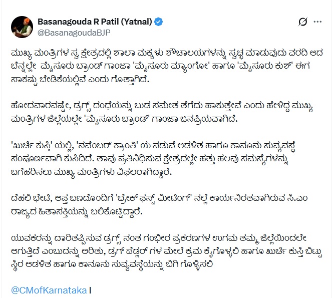 <p><strong>ಬೆಂಗಳೂರು</strong>: ಮುಖ್ಯಮಂತ್ರಿ ಸಿದ್ದರಾಮಯ್ಯ ಅವರ ಸ್ವಕ್ಷೇತ್ರ ವರುಣಾದಲ್ಲಿ ಶಾಲಾ ಮಕ್ಕಳು ಶೌಚಾಲಯಗಳನ್ನು ಸ್ವಚ್ಛ ಮಾಡುವುದು ವರದಿ ಆದ ಬೆನ್ನಲ್ಲೇ ‘ಮೈಸೂರು ಬ್ರಾಂಡ್ ಗಾಂಜಾ’, ‘ಮೈಸೂರು ಮ್ಯಾಂಗೋ’ ಹಾಗೂ ‘ಮೈಸೂರು ಕುಶ್’ ಈಗ ಸಾಕಷ್ಟು ಬೇಡಿಕೆಯಲ್ಲಿವೆ ಎಂದು ಬಿಜೆಪಿ ಶಾಸಕ ಬಸನಗೌಡ ಪಾಟೀಲ ಯತ್ನಾಳ ವಾಗ್ದಾಳಿ ನಡೆಸಿದ್ದಾರೆ.</p><p>ಹೋದವಾರವಷ್ಟೇ, ಡ್ರಗ್ಸ್ ದಂಧೆಯನ್ನು ಬುಡ ಸಮೇತ ತೆಗೆದು ಹಾಕುತ್ತೇವೆ ಎಂದು ಹೇಳಿದ್ದ ಸಿಎಂ ಸಿದ್ದರಾಮಯ್ಯ ಅವರ ಜಿಲ್ಲೆಯಲ್ಲೇ ‘ಮೈಸೂರು ಬ್ರಾಂಡ್’ ಗಾಂಜಾ ಜನಪ್ರಿಯವಾಗಿದೆ ಎಂದು ಯತ್ನಾಳ ‘ಎಕ್ಸ್’ನಲ್ಲಿ ಪೋಸ್ಟ್ ಮಾಡಿದ್ದಾರೆ.</p><p>‘ಕುರ್ಚಿ ಕುಸ್ತಿ’ಯಲ್ಲಿ, ‘ನವೆಂಬರ್ ಕ್ರಾಂತಿ’ಯ ನಡುವೆ ಆಡಳಿತ ಹಾಗೂ ಕಾನೂನು ಸುವ್ಯವಸ್ಥೆ ಸಂಪೂರ್ಣವಾಗಿ ಕುಸಿದಿದೆ. ತಾವು ಪ್ರತಿನಿಧಿಸುವ ಕ್ಷೇತ್ರದಲ್ಲೇ ಹತ್ತು ಹಲವು ಸಮಸ್ಯೆಗಳನ್ನು ಬಗೆಹರಿಸಲು ಸಿದ್ದರಾಮಯ್ಯ ವಿಫಲರಾಗಿದ್ದಾರೆ ಎಂದು ಯತ್ನಾಳ ಕಿಡಿಕಾರಿದ್ದಾರೆ.</p><p>‘ದೆಹಲಿ ಭೇಟಿ, ಆಪ್ತ ಬಣದೊಂದಿಗೆ ‘ಬ್ರೇಕ್ ಫಸ್ಟ್ ಮೀಟಿಂಗ್’ನಲ್ಲೇ ಕಾರ್ಯನಿರತವಾಗಿರುವ ಸಿ.ಎಂ ರಾಜ್ಯದ ಹಿತಾಸಕ್ತಿಯನ್ನು ಬಲಿಕೊಟ್ಟಿದ್ದಾರೆ. ಯುವಕರನ್ನು ದಾರಿತಪ್ಪಿಸುವ ಡ್ರಗ್ಸ್ ನಂತಹ ಗಂಭೀರ ಪ್ರಕರಣಗಳ ಉಗಮ ತಮ್ಮ ಜಿಲ್ಲೆಯಿಂದಲೇ ಆಗುತ್ತಿದೆ ಎಂಬುದನ್ನು ಅರಿತು ಡ್ರಗ್ ಪೆಡ್ಲರ್ಗಳ ವಿರುದ್ಧ ಕ್ರಮಕೈಗೊಳ್ಳಲಿ ಹಾಗೂ ಕುರ್ಚಿ ಕುಸ್ತಿ ಬಿಟ್ಟು ಸ್ಥಿರ ಆಡಳಿತ ಹಾಗೂ ಕಾನೂನು ಸುವ್ಯವಸ್ಥೆಯನ್ನು ಬಿಗಿಗೊಳಿಸಿ’ ಎಂದೂ ಅವರು ಕುಟುಕಿದ್ದಾರೆ.</p>.<div><p><strong>ಪ್ರಜಾವಾಣಿ ಆ್ಯಪ್ ಇಲ್ಲಿದೆ: <a href="https://play.google.com/store/apps/details?id=com.tpml.pv">ಆಂಡ್ರಾಯ್ಡ್ </a>| <a href="https://apps.apple.com/in/app/prajavani-kannada-news-app/id1535764933">ಐಒಎಸ್</a> | <a href="https://whatsapp.com/channel/0029Va94OfB1dAw2Z4q5mK40">ವಾಟ್ಸ್ಆ್ಯಪ್</a>, <a href="https://www.twitter.com/prajavani">ಎಕ್ಸ್</a>, <a href="https://www.fb.com/prajavani.net">ಫೇಸ್ಬುಕ್</a> ಮತ್ತು <a href="https://www.instagram.com/prajavani">ಇನ್ಸ್ಟಾಗ್ರಾಂ</a>ನಲ್ಲಿ ಪ್ರಜಾವಾಣಿ ಫಾಲೋ ಮಾಡಿ.</strong></p></div>