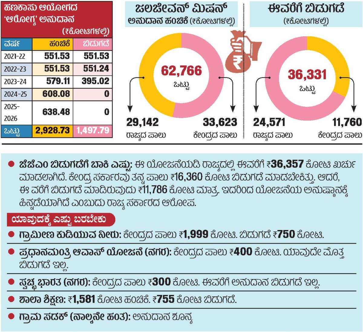 <p><strong>ನವದೆಹಲಿ</strong>: ಕೇಂದ್ರ ಸರ್ಕಾರವು ಕರ್ನಾಟಕಕ್ಕೆ ಈ ವರ್ಷ ₹51,700 ಕೋಟಿ ತೆರಿಗೆ ಪಾಲು ಹಂಚಿಕೆ ಮಾಡಿದೆ. ಕಂತು ಕಂತುಗಳಲ್ಲಿ ರಾಜ್ಯದ ಪಾಲಿನ ಅನುದಾನ ಬಂದಿದೆ. ಕೇಂದ್ರ ಪುರಸ್ಕೃತ ಯೋಜನೆಗಳಿಗೆ ಈ ಸಾಲಿನಲ್ಲಿ ₹16,000 ಕೋಟಿ ನೀಡುವುದಾಗಿ ವಾಗ್ದಾನ ಮಾಡಿದೆ. ಆದರೆ, ಈ ವರೆಗೆ ₹7 ಸಾವಿರ ಕೋಟಿಯಷ್ಟೇ ನೀಡಿದೆ. ಇನ್ನೂ ₹9 ಸಾವಿರ ಕೋಟಿ ನೀಡಬೇಕಿದೆ. ಈ ಅನುದಾನ ಶೀಘ್ರ ಬಿಡುಗಡೆಗೆ ಆಗ್ರಹಿಸಿ ಕೇಂದ್ರ ಸರ್ಕಾರಕ್ಕೆ ರಾಜ್ಯ ಸರ್ಕಾರ ಪತ್ರ ಬರೆದಿದೆ. ಜಲಜೀವನ್ ಮಿಷನ್ ಯೋಜನೆಯಲ್ಲೂ ಕೇಂದ್ರದ ಪಾಲು ₹4,574 ಕೋಟಿ ಬರಬೇಕಿದೆ</p>.<p><strong>ಎರಡು ವರ್ಷದಿಂದ ಆರೋಗ್ಯ ಅನುದಾನ ಇಲ್ಲ</strong> </p><p> ಕರ್ನಾಟಕ ರಾಜ್ಯಕ್ಕೆ 15ನೇ ಹಣಕಾಸು ಆಯೋಗ ಶಿಫಾರಸು ಮಾಡಿರುವ ಆರೋಗ್ಯ ಅನುದಾನವನ್ನು ಕೇಂದ್ರ ಆರೋಗ್ಯ ಮತ್ತು ಕುಟುಂಬ ಕಲ್ಯಾಣ ಇಲಾಖೆ ಎರಡು ವರ್ಷಗಳಿಂದ ಬಿಡುಗಡೆಯೇ ಮಾಡಿಲ್ಲ. ಆಯೋಗವು 2021–22ರಿಂದ 2025–26ರ ಅವಧಿಗೆ ರಾಜ್ಯಕ್ಕೆ ₹2928 ಕೋಟಿ ಹಂಚಿಕೆ ಮಾಡಿತ್ತು. ಇಲ್ಲಿಯವರೆಗೆ ₹1497 ಕೋಟಿ ಬಿಡುಗಡೆ ಆಗಿದೆ. 2024–25 2025–26ರಲ್ಲಿ ಅನುದಾನ ಬಂದಿಲ್ಲ. ಕಳೆದ ಐದು ವರ್ಷಗಳಲ್ಲಿ ರಾಜ್ಯಕ್ಕೆ ಬಿಡುಗಡೆಯಾದ ಅನುದಾನವೆಷ್ಟು ರಾಜ್ಯ ಖರ್ಚು ಮಾಡಿರುವುದೆಷ್ಟು ಎಂದು ದಕ್ಷಿಣ ಕನ್ನಡ ಸಂಸದ ಬ್ರಿಜೇಶ್ ಚೌಟ ಅವರು ಲೋಕಸಭೆಯಲ್ಲಿ ಶುಕ್ರವಾರ ಪ್ರಶ್ನೋತ್ತರ ಅವಧಿಯಲ್ಲಿ ಕೇಳಿದ್ದರು. ಇದಕ್ಕೆ ಆರೋಗ್ಯ ಮತ್ತು ಕುಟುಂಬ ಕಲ್ಯಾಣ ಇಲಾಖೆಯ ರಾಜ್ಯ ಸಚಿವ ಪ್ರತಾಪ್ ರಾವ್ ಜಾಧವ್ ನೀಡಿರುವ ಉತ್ತರದಲ್ಲಿ ಈ ಮಾಹಿತಿ ಇದೆ. </p><p><strong>ಬಳಕೆ ಪ್ರಮಾಣಪತ್ರ ಸಲ್ಲಿಸಿದರಷ್ಟೇ ಅನುದಾನ: ಪಾಟೀಲ</strong> </p><p> ಅನುದಾನ ಬಳಕೆಯ ಪ್ರಮಾಣಪತ್ರ ಸಲ್ಲಿಸಿದರಷ್ಟೇ ಜಲ ಜೀವನ್ ಮಿಷನ್ನ ಉಳಿದ ಅನುದಾನವನ್ನು ಕರ್ನಾಟಕ ರಾಜ್ಯಕ್ಕೆ ಬಿಡುಗಡೆ ಮಾಡಲಾಗುವುದು ಎಂದು ಕೇಂದ್ರ ಜಲಶಕ್ತಿ ಸಚಿವ ಸಿ.ಆರ್.ಪಾಟೀಲ ಸ್ಪಷ್ಟಪಡಿಸಿದರು. ಲೋಕಸಭೆಯಲ್ಲಿ ಪ್ರಶ್ನೋತ್ತರ ಅವಧಿಯಲ್ಲಿ ಬಳ್ಳಾರಿ ಸಂಸದ ಇ.ತುಕಾರಾಂ ಕೇಳಿದ ಪ್ರಶ್ನೆಗೆ ಉತ್ತರ ನೀಡಿದ ಸಚಿವರು ‘ಈಗಾಗಲೇ ಬಿಡುಗಡೆ ಆಗಿರುವ ಅನುದಾನದ ಬಳಕೆ ಪ್ರಮಾಣಪತ್ರವನ್ನು ಕರ್ನಾಟಕ ಸೇರಿದಂತೆ ಹಲವು ರಾಜ್ಯಗಳು ಸಲ್ಲಿಸಿಲ್ಲ. ಬಳಕೆ ಪ್ರಮಾಣಪತ್ರ ಸಲ್ಲಿಸದೇ ಉಳಿದ ಅನುದಾನ ಬಿಡುಗಡೆ ಮಾಡುವುದಿಲ್ಲ ಎಂದು ಕರ್ನಾಟಕದ ಮುಖ್ಯಮಂತ್ರಿ ಹಾಗೂ ಉಪಮುಖ್ಯಮಂತ್ರಿ ಅವರಿಗೆ ಪತ್ರದ ಮೂಲಕ ತಿಳಿಸಿದ್ದೇವೆ’ ಎಂದರು. ಜಲ ಜೀವನ್ ಮಿಷನ್ ಅನುದಾನ ಬಿಡುಗಡೆಗೆ ಸಂಬಂಧಿಸಿದಂತೆ ಮುಂದಿನ ವಾರ ಇನ್ನೊಂದು ಸಭೆ ನಡೆಯಲಿದೆ ಎಂದರು. ಇ.ತುಕಾರಾಂ ಮಾತನಾಡಿ ‘ಈ ಯೋಜನೆಯಲ್ಲಿ ರಾಜ್ಯ ಅದ್ಭುತ ಸಾಧನೆ ಮಾಡಿದೆ. ಆದರೆ ಕೇಂದ್ರ ಸರ್ಕಾರವು ₹13500 ಕೋಟಿಯಷ್ಟು ಅನುದಾನ ಉಳಿಸಿಕೊಂಡಿದೆ. ಈ ಅನುದಾನವನ್ನು ಶೀಘ್ರ ಬಿಡುಗಡೆ ಮಾಡಬೇಕು’ ಎಂದು ಒತ್ತಾಯಿಸಿದರು. </p> <p><strong>ಕೇಂದ್ರದಿಂದ ₹22476 ಕೋಟಿ ಬಾಕಿ: ಜಿ.ಸಿ.</strong> </p><p>‘ರಾಜ್ಯದಲ್ಲಿ ಅನುಷ್ಠಾನಗೊಳ್ಳುತ್ತಿರುವ ಕೇಂದ್ರ ಪ್ರಾಯೋಜಿತ ಯೋಜನೆಗಳಿಗೆ ಕೇಂದ್ರ ಸರ್ಕಾರ ಈ ಸಲ ₹56549 ಕೋಟಿ ಬಿಡುಗಡೆ ಮಾಡಿದೆ. ಆದರೆ ಡಿಸೆಂಬರ್ 6ರ ವರೆಗೆ ₹34073 ಕೋಟಿಯಷ್ಟೇ ಬಿಡುಗಡೆ ಮಾಡಿದೆ. ₹22476 ಕೋಟಿಯನ್ನು ಬಾಕಿ ಉಳಿಸಿಕೊಂಡಿದೆ‘ ಎಂದು ರಾಜ್ಯಸಭಾ ಸದಸ್ಯ ಜಿ.ಸಿ.ಚಂದ್ರಶೇಖರ್ ತಿಳಿಸಿದರು. ಶುಕ್ರವಾರ ಇಲ್ಲಿ ಸುದ್ದಿಗೋಷ್ಠಿಯಲ್ಲಿ ಮಾತನಾಡಿದ ಅವರು ‘ರಾಜ್ಯಕ್ಕೆ ಆಗಿರುವ ಅನ್ಯಾಯದ ಬಗ್ಗೆ ಸಂಸತ್ನಲ್ಲಿ ಪ್ರಸ್ತಾಪಿಸುವಂತೆ ರಾಜ್ಯ ಸರ್ಕಾರವು ಎಲ್