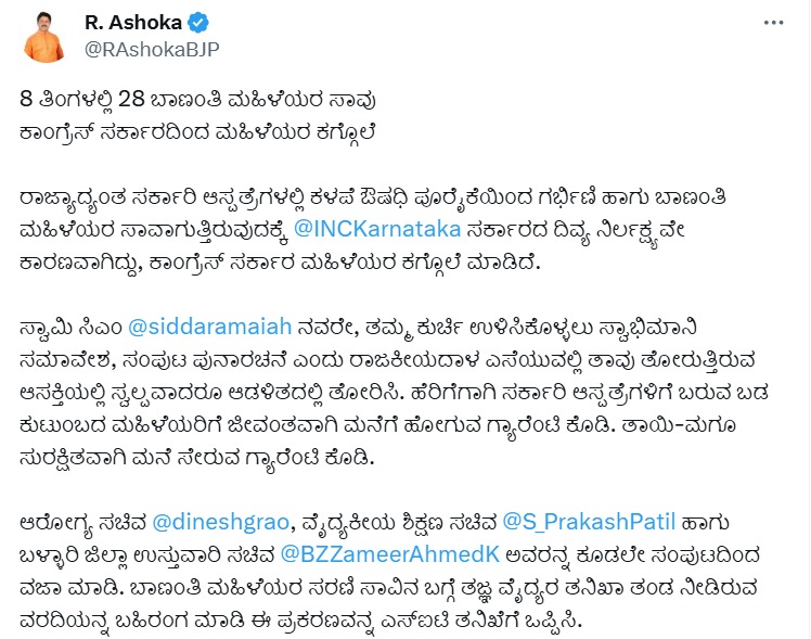<p><strong>ಬೆಂಗಳೂರು</strong>: ರಾಜ್ಯದಲ್ಲಿ ಕಳೆದ ಎಂಟು ತಿಂಗಳಲ್ಲಿ ಸಂಭವಿಸಿರುವ ಬಾಣಂತಿಯರ ಸಾವಿನ ಪ್ರಕರಣಗಳಿಗೆ ಸಂಬಂಧಿಸಿದಂತೆ ರಾಜ್ಯ ಸರ್ಕಾರದ ವಿರುದ್ಧ ವಾಗ್ದಾಳಿ ನಡೆಸಿರುವ ವಿಧಾನಸಭೆ ವಿರೋಧ ಪಕ್ಷದ ನಾಯಕ ಆರ್. ಅಶೋಕ, ಕಾಂಗ್ರೆಸ್ ಸರ್ಕಾರ ಮಹಿಳೆಯರ ಕಗ್ಗೊಲೆ ಮಾಡಿದೆ ಎಂದು ಆರೋಪಿಸಿದ್ದಾರೆ.</p><p>ಈ ಕುರಿತು ಸಾಮಾಜಿಕ ಜಾಲತಾಣ ‘ಎಕ್ಸ್’ನಲ್ಲಿ ಪೋಸ್ಟ್ ಮಾಡಿರುವ ಅವರು, ‘ರಾಜ್ಯದಾದ್ಯಂತ ಸರ್ಕಾರಿ ಆಸ್ಪತ್ರೆಗಳಲ್ಲಿ ಕಳಪೆ ಔಷಧಿ ಪೂರೈಕೆಯಿಂದ ಗರ್ಭಿಣಿ ಹಾಗೂ ಬಾಣಂತಿ ಮಹಿಳೆಯರು ಸಾವಿಗೀಡಾಗುತ್ತಿರುವುದಕ್ಕೆ ಕಾಂಗ್ರೆಸ್ ಸರ್ಕಾರದ ನಿರ್ಲಕ್ಷ್ಯವೇ ಕಾರಣ ಎಂದು ಆಕ್ರೋಶ ವ್ಯಕ್ತಪಡಿಸಿದ್ದಾರೆ.</p><p>ಮುಖ್ಯಮಂತ್ರಿ ಸಿದ್ದರಾಮಯ್ಯ ಅವರೇ, ‘ನಿಮ್ಮ ಕುರ್ಚಿ ಉಳಿಸಿಕೊಳ್ಳಲು ಸ್ವಾಭಿಮಾನಿ ಸಮಾವೇಶ, ಸಂಪುಟ ಪುನಾರಚನೆ ಎಂದು ರಾಜಕೀಯದಾಳ ಎಸೆಯುವಲ್ಲಿ ತಾವು ತೋರುತ್ತಿರುವ ಆಸಕ್ತಿಯಲ್ಲಿ ಸ್ವಲ್ಪವಾದರೂ ಆಡಳಿತದಲ್ಲಿ ತೋರಿಸಿ. ಹೆರಿಗೆಗಾಗಿ ಸರ್ಕಾರಿ ಆಸ್ಪತ್ರೆಗಳಿಗೆ ಬರುವ ಬಡ ಕುಟುಂಬದ ಮಹಿಳೆಯರಿಗೆ ಜೀವಂತವಾಗಿ ಮನೆಗೆ ಹೋಗುವ ಗ್ಯಾರಂಟಿ ಕೊಡಿ. ತಾಯಿ–ಮಗು ಇಬ್ಬರು ಸುರಕ್ಷಿತವಾಗಿ ಮನೆ ಸೇರುವ ಗ್ಯಾರಂಟಿ ಕೊಡಿ ಎಂದು ಅವರು ಹೇಳಿದ್ದಾರೆ.</p>.<p>ಆರೋಗ್ಯ ಸಚಿವ ದಿನೇಶ್ ಗುಂಡೂರಾವ್, ವೈದ್ಯಕೀಯ ಶಿಕ್ಷಣ ಸಚಿವ ಎಸ್. ಪ್ರಕಾಶ ಪಾಟೀಲ ಹಾಗೂ ಬಳ್ಳಾರಿ ಜಿಲ್ಲಾ ಉಸ್ತುವಾರಿ ಸಚಿವ ಜಮೀರ್ ಅಹ್ಮದ್ ಖಾನ್ ಅವರನ್ನು ಕೂಡಲೇ ಸಂಪುಟದಿಂದ ವಜಾ ಮಾಡಿ. ಬಾಣಂತಿ ಮಹಿಳೆಯರ ಸರಣಿ ಸಾವಿನ ಬಗ್ಗೆ ತಜ್ಞ ವೈದ್ಯರ ತನಿಖಾ ತಂಡ ನೀಡಿರುವ ವರದಿಯನ್ನು ಬಹಿರಂಗ ಮಾಡಿ. ಈ ಪ್ರಕರಣವನ್ನು ಎಸ್ಐಟಿ ತನಿಖೆಗೆ ಒಪ್ಪಿಸಿ ಎಂದು ಅಶೋಕ ಆಗ್ರಹಿಸಿದ್ದಾರೆ.</p>.<div><p><strong>ಪ್ರಜಾವಾಣಿ ಆ್ಯಪ್ ಇಲ್ಲಿದೆ: <a href="https://play.google.com/store/apps/details?id=com.tpml.pv">ಆಂಡ್ರಾಯ್ಡ್ </a>| <a href="https://apps.apple.com/in/app/prajavani-kannada-news-app/id1535764933">ಐಒಎಸ್</a> | <a href="https://whatsapp.com/channel/0029Va94OfB1dAw2Z4q5mK40">ವಾಟ್ಸ್ಆ್ಯಪ್</a>, <a href="https://www.twitter.com/prajavani">ಎಕ್ಸ್</a>, <a href="https://www.fb.com/prajavani.net">ಫೇಸ್ಬುಕ್</a> ಮತ್ತು <a href="https://www.instagram.com/prajavani">ಇನ್ಸ್ಟಾಗ್ರಾಂ</a>ನಲ್ಲಿ ಪ್ರಜಾವಾಣಿ ಫಾಲೋ ಮಾಡಿ.</strong></p></div>