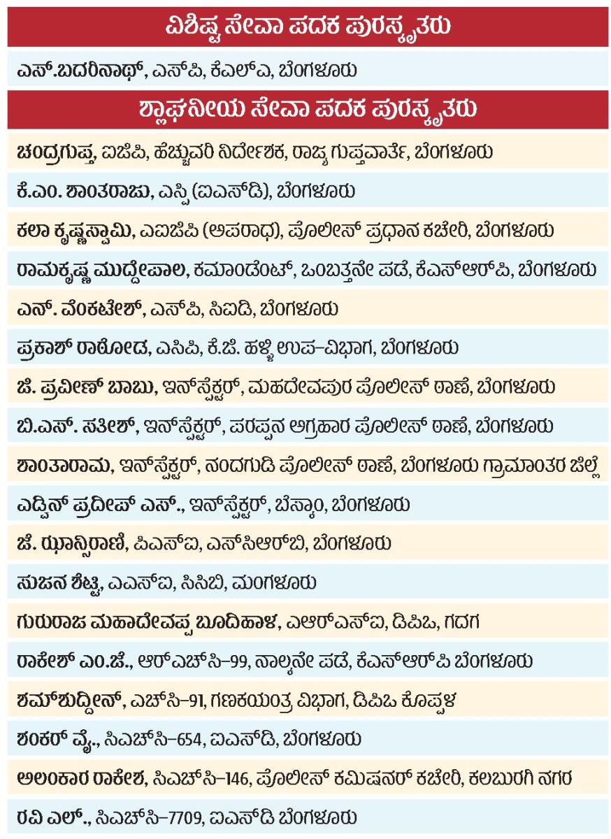 <p><strong>ಬೆಂಗಳೂರು:</strong> ಪೊಲೀಸ್ ಇಲಾಖೆಯಲ್ಲಿ ಅತ್ಯುತ್ತಮ ಸೇವೆ ಸಲ್ಲಿಸಿದ ರಾಜ್ಯದ 19 ಪೊಲೀಸ್ ಅಧಿಕಾರಿಗಳು ಹಾಗೂ ಸಿಬ್ಬಂದಿಗೆ 2025ನೇ ಸಾಲಿನ ರಾಷ್ಟ್ರಪತಿ ಪದಕ ಲಭಿಸಿದೆ.</p>.<p>ಸ್ವಾತಂತ್ರ್ಯೋತ್ಸವ ದಿನಾಚರಣೆ ಸಂದರ್ಭದಲ್ಲಿ ರಾಷ್ಟ್ರಪತಿಯವರ ವಿಶಿಷ್ಟ ಸೇವಾ ಪದಕ ಹಾಗೂ ಶ್ಲಾಘನೀಯ ಸೇವಾ ಪದಕ ಪುರಸ್ಕೃತ ಪೊಲೀಸ್ ಅಧಿಕಾರಿಗಳು ಹಾಗೂ ಸಿಬ್ಬಂದಿ ಹೆಸರು ಪ್ರಕಟಿಸಲಾಗಿದೆ. ಪದಕ ಲಭಿಸಿದ ಅಧಿಕಾರಿಗಳು ಹಾಗೂ ಸಿಬ್ಬಂದಿಯ ವಿವರ ಇಲ್ಲಿದೆ.</p>.<h2>ವಿಶಿಷ್ಟ ಸೇವಾ ಪದಕ ಪುರಸ್ಕೃತರು:</h2>.<ul><li><p><strong>ಎಸ್.ಬದರಿನಾಥ್, ಎಸ್ಪಿ, ಕೆಎಲ್ಎ, ಬೆಂಗಳೂರು</strong></p></li></ul>.<p>ಶ್ಲಾಘನೀಯ ಸೇವಾ ಪದಕ ಪುರಸ್ಕೃತರು:</p>.<ul><li><p>ಚಂದ್ರಗುಪ್ತ, ಐಜಿಪಿ, ಹೆಚ್ಚುವರಿ ನಿರ್ದೇಶಕ, ರಾಜ್ಯ ಗುಪ್ತವಾರ್ತೆ, ಬೆಂಗಳೂರು</p></li><li><p>ಕೆ.ಎಂ. ಶಾಂತರಾಜು, ಎಸ್ಪಿ (ಐಎಸ್ಡಿ), ಬೆಂಗಳೂರು</p></li><li><p>ಕಲಾ ಕೃಷ್ಣಸ್ವಾಮಿ, ಎಐಜಿಪಿ (ಅಪರಾಧ), ಪೊಲೀಸ್ ಪ್ರಧಾನ ಕಚೇರಿ, ಬೆಂಗಳೂರು</p></li><li><p>ರಾಮಕೃಷ್ಣ ಮುದ್ದೇಪಾಲ, ಕಮಾಂಡೆಂಟ್, ಒಂಬತ್ತನೇ ಪಡೆ, ಕೆಎಸ್ಆರ್ಪಿ, ಬೆಂಗಳೂರು</p></li><li><p>ಎನ್. ವೆಂಕಟೇಶ್, ಎಸ್ಪಿ, ಸಿಐಡಿ, ಬೆಂಗಳೂರು</p></li><li><p>ಪ್ರಕಾಶ್ ರಾಠೋಡ, ಎಸಿಪಿ, ಕೆ.ಜಿ. ಹಳ್ಳಿ ಉಪ–ವಿಭಾಗ, ಬೆಂಗಳೂರು </p></li><li><p>ಜಿ. ಪ್ರವೀಣ್ ಬಾಬು, ಇನ್ಸ್ಪೆಕ್ಟರ್, ಮಹದೇವಪುರ ಪೊಲೀಸ್ ಠಾಣೆ, ಬೆಂಗಳೂರು </p></li><li><p>ಬಿ.ಎಸ್. ಸತೀಶ್, ಇನ್ಸ್ಪೆಕ್ಟರ್, ಪರಪ್ಪನ ಅಗ್ರಹಾರ ಪೊಲೀಸ್ ಠಾಣೆ, ಬೆಂಗಳೂರು</p></li><li><p>ಶಾಂತಾರಾಮ, ಇನ್ಸ್ಪೆಕ್ಟರ್, ನಂದಗುಡಿ ಪೊಲೀಸ್ ಠಾಣೆ, ಬೆಂಗಳೂರು ಗ್ರಾಮಾಂತರ ಜಿಲ್ಲೆ</p></li><li><p>ಎಡ್ವಿನ್ ಪ್ರದೀಪ್ ಎಸ್., ಇನ್ಸ್ಪೆಕ್ಟರ್, ಬೆಸ್ಕಾಂ, ಬೆಂಗಳೂರು</p></li><li><p>ಜೆ. ಝಾನ್ಸಿರಾಣಿ, ಪಿಎಸ್ಐ, ಎಸ್ಸಿಆರ್ಬಿ, ಬೆಂಗಳೂರು</p></li><li><p>ಸುಜನ ಶೆಟ್ಟಿ, ಎಎಸ್ಐ, ಸಿಸಿಬಿ, ಮಂಗಳೂರು </p></li><li><p>ಗುರುರಾಜ ಮಹಾದೇವಪ್ಪ ಬೂದಿಹಾಳ, ಎಆರ್ಎಸ್ಐ, ಡಿಪಿಒ, ಗದಗ</p></li><li><p>ರಾಕೇಶ್ ಎಂ.ಜೆ., ಆರ್ಎಚ್ಸಿ–99, ನಾಲ್ಕನೇ ಪಡೆ, ಕೆಎಸ್ಆರ್ಪಿ ಬೆಂಗಳೂರು</p></li><li><p>ಶಮ್ಶುದ್ದೀನ್, ಎಚ್ಸಿ–91, ಗಣಕಯಂತ್ರ ವಿಭಾಗ, ಡಿಪಿಒ ಕೊಪ್ಪಳ</p></li><li><p>ಶಂಕರ್ ವೈ., ಸಿಎಚ್ಸಿ–654, ಐಎಸ್ಡಿ, ಬೆಂಗಳೂರು </p></li><li><p>ಅಲಂಕಾರ ರಾಕೇಶ, ಸಿಎಚ್ಸಿ–146, ಪೊಲೀಸ್ ಕಮಿಷನರ್ ಕಚೇರಿ, ಕಲಬುರಗಿ ನಗರ</p></li><li><p>ರವಿ ಎಲ್., ಸಿಎಚ್ಸಿ–7709, ಐಎಸ್ಡಿ ಬೆಂಗಳೂರು</p></li></ul>.<div><p><strong>ಪ್ರಜಾವಾಣಿ ಆ್ಯಪ್ ಇಲ್ಲಿದೆ: <a href="https://play.google.com/store/apps/details?id=com.tpml.pv">ಆಂಡ್ರಾಯ್ಡ್ </a>| <a href="https://apps.apple.com/in/app/prajavani-kannada-news-app/id1535764933">ಐಒಎಸ್</a> | <a href="https://whatsapp.com/channel/0029Va94OfB1dAw2Z4q5mK40">ವಾಟ್ಸ್ಆ್ಯಪ್</a>, <a href="https://www.twitter.com/prajavani">ಎಕ್ಸ್</a>, <a href="https://www.fb.com/prajavani.net">ಫೇಸ್ಬುಕ್</a> ಮತ್ತು <a href="https://www.instagram.com/prajavani">ಇನ್ಸ್ಟಾಗ್ರಾಂ</a>ನಲ್ಲಿ ಪ್ರಜಾವಾಣಿ ಫಾಲೋ ಮಾಡಿ.</strong></p></div>