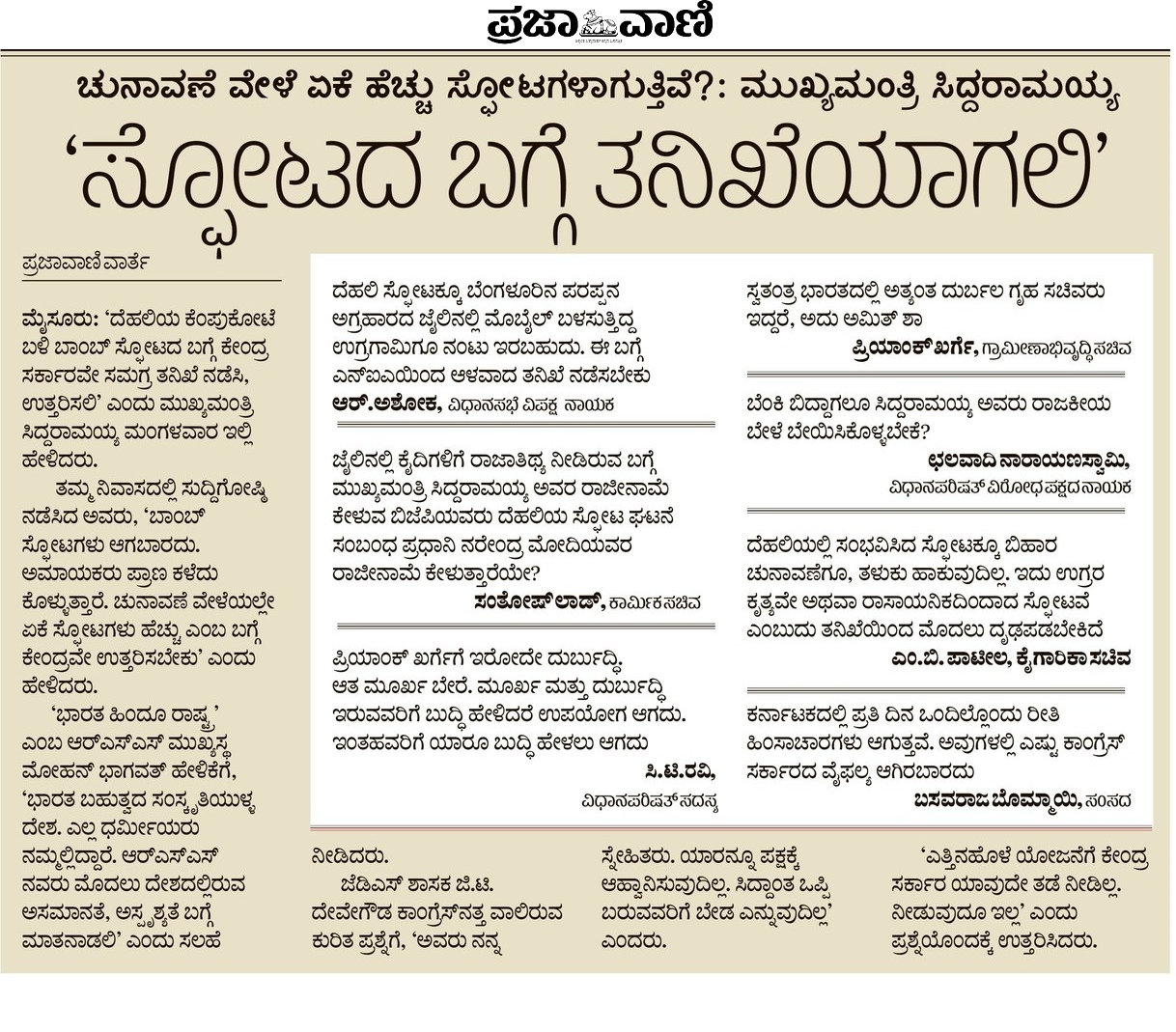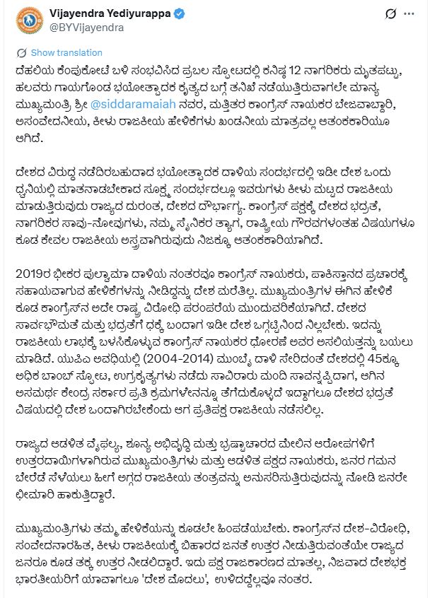 <p><strong>ಬೆಂಗಳೂರು</strong>: ದೆಹಲಿ ಕೆಂಪು ಕೋಟೆ ಮೆಟ್ರೊ ನಿಲ್ದಾಣದ ಬಳಿ ನಡೆದ ಸ್ಪೋಟಕ್ಕೆ ಸಂಬಂಧಿಸಿದಂತೆ ಮುಖ್ಯಮಂತ್ರಿ ಸಿದ್ದರಾಮಯ್ಯ ಅವರು ತಮ್ಮ ಹೇಳಿಕೆಯನ್ನು ಕೂಡಲೇ ಹಿಂಪಡೆಯಬೇಕು ಎಂದು ಬಿಜೆಪಿ ರಾಜ್ಯಾಧ್ಯಕ್ಷ ಬಿ.ವೈ.ವಿಜಯೇಂದ್ರ ಒತ್ತಾಯಿಸಿದ್ದಾರೆ.</p><p>ಸ್ಪೋಟಕ್ಕೆ ಸಂಬಂಧಿಸಿದಂತೆ ಮಂಗಳವಾರ ಸುದ್ದಿಗೋಷ್ಠಿಯಲ್ಲಿ ಮಾತನಾಡಿದ್ದ ಸಿದ್ದರಾಮಯ್ಯ ಅವರು, ಚುನಾವಣೆ ವೇಳೆಯಲ್ಲೇ ಏಕೆ ಸ್ಫೋಟಗಳು ಹೆಚ್ಚು ಎಂಬ ಬಗ್ಗೆ ಕೇಂದ್ರವೇ ಉತ್ತರಿಸಬೇಕು ಎಂದಿದ್ದರು.</p><p>ಈ ಹೇಳಿಕೆ ಕುರಿತು ಎಕ್ಸ್ನಲ್ಲಿ ಪ್ರತಿಕ್ರಿಯಿಸಿರುವ ವಿಜಯೇಂದ್ರ, ಸಿದ್ದರಾಮಯ್ಯ ವಿರುದ್ಧ ವಾಗ್ಧಾಳಿ ನಡೆಸಿದ್ದಾರೆ.</p><p>‘ದೆಹಲಿಯ ಕೆಂಪುಕೋಟೆ ಬಳಿ ಸಂಭವಿಸಿದ ಪ್ರಬಲ ಸ್ಫೋಟದಲ್ಲಿ ಕನಿಷ್ಠ 12 ನಾಗರಿಕರು ಮೃತಪಟ್ಟು, ಹಲವರು ಗಾಯಗೊಂಡ ಭಯೋತ್ಪಾದಕ ಕೃತ್ಯದ ಬಗ್ಗೆ ತನಿಖೆ ನಡೆಯುತ್ತಿರುವಾಗಲೇ ಮುಖ್ಯಮಂತ್ರಿ ಸಿದ್ದರಾಮಯ್ಯ ಸೇರಿದಂತೆ ಕಾಂಗ್ರೆಸ್ ನಾಯಕರ ಬೇಜವಾಬ್ದಾರಿ, ಅಸಂವೇದನೀಯ, ಕೀಳು ರಾಜಕೀಯ ಹೇಳಿಕೆಗಳು ಖಂಡನೀಯ ಮಾತ್ರವಲ್ಲ ಆತಂಕಕಾರಿಯೂ ಆಗಿದೆ’ ಎಂದು ಕಿಡಿಕಾರಿದ್ದಾರೆ.</p><p>‘ಕಾಂಗ್ರೆಸ್ ಪಕ್ಷಕ್ಕೆ ದೇಶದ ಭದ್ರತೆ, ನಾಗರಿಕರ ಸಾವು-ನೋವುಗಳು, ನಮ್ಮ ಸೈನಿಕರ ತ್ಯಾಗ, ರಾಷ್ಟ್ರೀಯ ಗೌರವಗಳಂತಹ ವಿಷಯಗಳೂ ಕೂಡ ಕೇವಲ ರಾಜಕೀಯ ಅಸ್ತ್ರವಾಗಿರುವುದು ನಿಜಕ್ಕೂ ಆತಂಕಕಾರಿಯಾಗಿದೆ’ ಎಂದಿದ್ದಾರೆ.</p>.<p>‘2019ರ ಭೀಕರ ಪುಲ್ವಾಮಾ ದಾಳಿಯ ನಂತರವೂ ಕಾಂಗ್ರೆಸ್ ನಾಯಕರು, ಪಾಕಿಸ್ತಾನದ ಪ್ರಚಾರಕ್ಕೆ ಸಹಾಯವಾಗುವ ಹೇಳಿಕೆಗಳನ್ನು ನೀಡಿದ್ದನ್ನು ದೇಶ ಮರೆತಿಲ್ಲ. ಮುಖ್ಯಮಂತ್ರಿಗಳ ಈಗಿನ ಹೇಳಿಕೆ ಕೂಡ ಕಾಂಗ್ರೆಸ್ನ ಅದೇ ರಾಷ್ಟ್ರ ವಿರೋಧಿ ಪರಂಪರೆಯ ಮುಂದುವರಿಕೆಯಾಗಿದೆ’ ಎಂದು ಆಕ್ರೋಶ ವ್ಯಕ್ತಪಡಿಸಿದ್ದಾರೆ.</p><p>‘ಯುಪಿಎ ಅವಧಿಯಲ್ಲಿ (2004-2014) ಮುಂಬೈ ದಾಳಿ ಸೇರಿದಂತೆ ದೇಶದಲ್ಲಿ 45ಕ್ಕೂ ಅಧಿಕ ಬಾಂಬ್ ಸ್ಫೋಟ, ಉಗ್ರಕೃತ್ಯಗಳು ನಡೆದು ಸಾವಿರಾರು ಮಂದಿ ಸಾವನ್ನಪ್ಪಿದಾಗ, ಆಗಿನ ಅಸಮರ್ಥ ಕೇಂದ್ರ ಸರ್ಕಾರ ಪ್ರತಿ ಕ್ರಮಗಳೇನನ್ನೂ ತೆಗೆದುಕೊಳ್ಳದೆ ಇದ್ದಾಗಲೂ ದೇಶದ ಭದ್ರತೆ ವಿಷಯದಲ್ಲಿ ದೇಶ ಒಂದಾಗಿರಬೇಕೆಂದು ಆಗ ಪ್ರತಿಪಕ್ಷ ರಾಜಕೀಯ ನಡೆಸಲಿಲ್ಲ’ ಎಂದು ಹೇಳಿದ್ದಾರೆ.</p><p>‘ರಾಜ್ಯದ ಆಡಳಿತ ವೈಫಲ್ಯ, ಶೂನ್ಯ ಅಭಿವೃದ್ಧಿ ಮತ್ತು ಭ್ರಷ್ಟಾಚಾರದ ಮೇಲಿನ ಆರೋಪಗಳಿಗೆ ಉತ್ತರದಾಯಿಗಳಾಗಿರುವ ಮುಖ್ಯಮಂತ್ರಿಗಳು ಮತ್ತು ಆಡಳಿತ ಪಕ್ಷದ ನಾಯಕರು, ಜನರ ಗಮನ ಬೇರೆಡೆ ಸೆಳೆಯಲು ಹೀಗೆ ಅಗ್ಗದ ರಾಜಕೀಯ ತಂತ್ರವನ್ನು ಅನುಸರಿಸುತ್ತಿರುವುದು ಸರಿಯಲ್ಲ’ ಎಂದಿದ್ದಾರೆ.</p><p>‘ಮುಖ್ಯಮಂತ್ರಿಗಳು ತಮ್ಮ ಹೇಳಿಕೆಯನ್ನು ಕೂಡಲೇ ಹಿಂಪಡೆಯಬೇಕು. ಕಾಂಗ್ರೆಸ್ನ ದೇಶ-ವಿರೋಧಿ, ಸಂವೇದನಾರಹಿತ, ಕೀಳು ರಾಜಕೀಯಕ್ಕೆ ಬಿಹಾರದ ಜನತೆ ಉತ್ತರ ನೀಡುತ್ತಿರುವಂತೆಯೇ ರಾಜ್ಯದ ಜನರೂ ಕೂಡ ತಕ್ಕ ಉತ್ತರ ನೀಡಲಿದ್ದಾರೆ’ ಎಂದು ಕಿಡಿಕಾರಿದ್ದಾರೆ.</p>.<div><p><strong>ಪ್ರಜಾವಾಣಿ ಆ್ಯಪ್ ಇಲ್ಲಿದೆ: <a href="https://play.google.com/store/apps/details?id=com.tpml.pv">ಆಂಡ್ರಾಯ್ಡ್ </a>| <a href="https://apps.apple.com/in/app/prajavani-kannada-news-app/id1535764933">ಐಒಎಸ್</a> | <a href="https://whatsapp.com/channel/0029Va94OfB1dAw2Z4q5mK40">ವಾಟ್ಸ್ಆ್ಯಪ್</a>, <a href="https://www.twitter.com/prajavani">ಎಕ್ಸ್</a>, <a href="https://www.fb.com/prajavani.net">ಫೇಸ್ಬುಕ್</a> ಮತ್ತು <a href="https://www.instagram.com/prajavani">ಇನ್ಸ್ಟಾಗ್ರಾಂ</a>ನಲ್ಲಿ ಪ್ರಜಾವಾಣಿ ಫಾಲೋ ಮಾಡಿ.</strong></p></div>