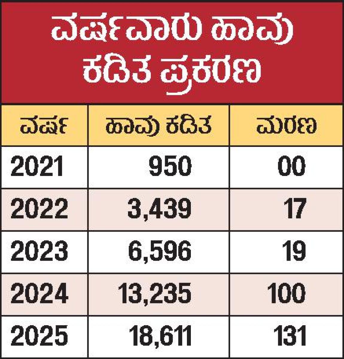 <p><strong>ಬೆಂಗಳೂರು</strong>: ರಾಜ್ಯದಲ್ಲಿ ಹಾವು ಕಡಿತ ಪ್ರಕರಣಗಳ ಸಂಖ್ಯೆ ಏರುಗತಿ ಪಡೆದಿದ್ದು, ಐದು ವರ್ಷಗಳಲ್ಲಿ 42 ಸಾವಿರಕ್ಕೂ ಅಧಿಕ ಮಂದಿ ಹಾವು ಕಡಿತಕ್ಕೆ ಒಳಗಾಗಿದ್ದಾರೆ.</p>.<p>ನಾಯಿ ಕಡಿತದ ಜತೆಗೆ ಹಾವು ಕಡಿತ ಪ್ರಕರಣಗಳೂ ವರ್ಷದಿಂದ ವರ್ಷಕ್ಕೆ ಹೆಚ್ಚಳವಾಗುತ್ತಿವೆ. ಆರೋಗ್ಯ ಇಲಾಖೆ ಪ್ರಕಾರ, ಈ ವರ್ಷ 18 ಸಾವಿರಕ್ಕೂ ಅಧಿಕ ಮಂದಿ ಹಾವು ಕಡಿತಕ್ಕೆ ಒಳಗಾಗಿದ್ದಾರೆ. ವರ್ಷವೊಂದರಲ್ಲಿ ವರದಿಯಾದ ಗರಿಷ್ಠ ಪ್ರಕರಣಗಳು ಇವಾಗಿವೆ. ವರ್ಷದಿಂದ ವರ್ಷಕ್ಕೆ ಪ್ರಕರಣಗಳ ಸಂಖ್ಯೆ ದುಪ್ಪಟ್ಟಾಗುತ್ತಿದೆ. ಇದೇ ವೇಳೆ ಕಡಿತದಿಂದ ಮೃತಪಡುವವರ ಸಂಖ್ಯೆಯೂ ಹೆಚ್ಚಳವಾಗುತ್ತಿದ್ದು, ಐದು ವರ್ಷಗಳಲ್ಲಿ 267 ಮಂದಿ ಸಾವಿಗೀಡಾಗಿದ್ದಾರೆ. </p>.<p>ರಾಜ್ಯದಲ್ಲಿ ಹಾವು ಕಡಿತವನ್ನು ‘ಘೋಷಿತ ಕಾಯಿಲೆ’ಯಡಿ ತರಲಾಗಿದೆ. ಇದರಿಂದಾಗಿ ಸರ್ಕಾರಿ ಆಸ್ಪತ್ರೆಗಳ ಜತೆಗೆ ಖಾಸಗಿ ಆಸ್ಪತ್ರೆಗಳೂ ಕಡ್ಡಾಯವಾಗಿ ಈ ಪ್ರಕರಣಗಳ ಮಾಹಿತಿಯನ್ನು ಇಲಾಖೆಗೆ ಒದಗಿಸಬೇಕಿದೆ. ಇದರಿಂದಾಗಿ ರಾಜ್ಯದ ವಿವಿಧೆಡೆ ವರದಿಯಾಗುತ್ತಿರುವ ಪ್ರಕರಣಗಳ ನಿಖರ ಮಾಹಿತಿ ಇಲಾಖೆಗೆ ಲಭ್ಯವಾಗುತ್ತಿದೆ. ಪರಿಣಾಮ, 2021ರಲ್ಲಿ ಸಾವಿರದ ಗಡಿಯ ಆಸುಪಾಸಿನಲ್ಲಿದ್ದ ಹಾವು ಕಡಿತ ಪ್ರಕರಣಗಳ ಸಂಖ್ಯೆ, ಈಗ ಗಣನೀಯ ಏರಿಕೆಯಾಗಿದೆ. </p>.<p>ಚಿಕಿತ್ಸೆಗೆ ವ್ಯವಸ್ಥೆ: 2030ರ ವೇಳೆಗೆ ಹಾವು ಕಡಿತ ಮರಣವನ್ನು ಅರ್ಧದಷ್ಟು ಇಳಿಸುವ ಗುರಿಯನ್ನು ಇಲಾಖೆ ಹಾಕಿಕೊಂಡಿದೆ. ಇದಕ್ಕೆ ಪೂರಕವಾಗಿ ಹಾವು ಕಡಿತಕ್ಕೆ ಒಳಗಾದವರಿಗೆ ಆಂಬುಲೆನ್ಸ್ ಸೇವೆ ಹಾಗೂ ಚಿಕಿತ್ಸೆಗೆ ಆದ್ಯತೆ ನೀಡಲಾಗಿದೆ.</p>.<p>‘ಆಯುಷ್ಮಾನ್ ಭಾರತ್–ಆರೋಗ್ಯ ಕರ್ನಾಟಕ’ ಯೋಜನೆಯಡಿ ಹಾವು ಕಡಿತ ಪ್ರಕರಣಗಳ ಚಿಕಿತ್ಸೆಯನ್ನು ಸೇರ್ಪಡೆ ಮಾಡಲಾಗಿದೆ. ಈ ಚಿಕಿತ್ಸೆಗೆ ದರ ನಿಗದಿಪಡಿಸಿರುವ ಇಲಾಖೆ, ಮುಂಗಡ ಹಣಕ್ಕೆ ಬೇಡಿಕೆ ನೀಡದೆ ಚಿಕಿತ್ಸೆ ಒದಗಿಸುವಂತೆ ಆದೇಶ ಹೊರಡಿಸಿದೆ. ಹಾವು ಕಡಿತಕ್ಕೊಳಗಾದ ಸಂತ್ರಸ್ತರಿಗೆ ನೀಡಿದ ಚಿಕಿತ್ಸೆಗಾಗಿ ಆಸ್ಪತ್ರೆಯ ಶುಲ್ಕವನ್ನು ಸುವರ್ಣ ಆರೋಗ್ಯ ಸುರಕ್ಷಾ ಟ್ರಸ್ಟ್ (ಸಾಸ್ಟ್) ಮೂಲಕ ಸರ್ಕಾರವೇ ನಿಗದಿತ ಆಸ್ಪತ್ರೆಗೆ ಮರುಪಾವತಿ ಮಾಡಲಿದೆ. </p>.<p>ಹಾವು ಕಡಿತ ಪ್ರಕರಣಗಳಲ್ಲಿ ದಿನವೊಂದಕ್ಕೆ ಸಾಮಾನ್ಯ ವಾರ್ಡ್ಗೆ ಸರ್ಕಾರಿ ಆಸ್ಪತ್ರೆಗೆ ₹1,350 ನಿಗದಿಪಡಿಸಿದರೆ, ಈ ಶುಲ್ಕ ಖಾಸಗಿ ಆಸ್ಪತ್ರೆಗೆ ₹ 2,300 ಇದೆ. ವೆಂಟಿಲೇಟರ್ ರಹಿತ ಐಸಿಯು ವಾರ್ಡ್ಗೆ ಕ್ರಮವಾಗಿ ₹2,700 ಮತ್ತು ₹8,800 ಗೊತ್ತುಪಡಿಸಲಾಗಿದೆ. ವೆಂಟಿಲೇಟರ್ ಸಹಿತ ಐಸಿಯು ವಾರ್ಡ್ಗೆ ₹3,375 ಹಾಗೂ ₹10,350 ನಿಗದಿಪಡಿಸಲಾಗಿದೆ. </p>.<p>‘ಹಾವು ಕಡಿತ ಪ್ರಕರಣಗಳಲ್ಲಿ ಮರಣ ತಡೆಗೆ ಎಲ್ಲೆಡೆ ಚಿಕಿತ್ಸೆ ಲಭ್ಯತೆಗೆ ವ್ಯವಸ್ಥೆ ಮಾಡಲಾಗಿದೆ. ಹಾವು ಕಡಿತಕ್ಕೆ ಒಳಗಾದವರು ಚಿಕಿತ್ಸೆ ಪಡೆಯುವುದು ವಿಳಂಬವಾದಲ್ಲಿ ಜೀವಕ್ಕೆ ತೊಂದರೆಯಾಗುತ್ತದೆ. ಘೋಷಿತ ರೋಗವೆಂದು ಗುರುತಿಸಿದ್ದರಿಂದ ಹಾವು ಕಡಿತದಿಂದ ಉಂಟಾಗುತ್ತಿದ್ದ ಪ್ರಾಣ ಹಾನಿ ತಡೆಯಲು ಹಲವು ಕ್ರಮಗಳನ್ನು ಕೈಗೊಳ್ಳಲಾಗಿದೆ. ಒಂದು ವೇಳೆ ಹಾವು ಕಡಿತದಿಂದ ವ್ಯಕ್ತಿ ಮರಣ ಹೊಂದಿದಲ್ಲಿ ‘ಸಾವಿನ ಲೆಕ್ಕಗಳ ವರದಿ’ (ಡೆತ್ ಆಡಿಟ್) ಮಾಡಿಸಲಾಗುತ್ತಿದೆ. ಇದರಿಂದಾಗಿ ಹಾವು ಕಡಿತದ ಬಗ್ಗೆ ಸ್ಪಷ್ಟ ಚಿತ್ರಣ ಸಿಗುತ್ತಿದೆ’ ಎಂದು ಇಲಾಖೆ ಅಧಿಕಾರಿಯೊಬ್ಬರು ತಿಳಿಸಿದರು. </p>.<p><strong>ಉಚಿತವಾಗಿ ‘ಆ್ಯಂಟಿ ಸ್ನೇಕ್ ವೆನಮ್’</strong></p><p>ರಾಜ್ಯದ ಎಲ್ಲ ಜಿಲ್ಲಾ ಆಸ್ಪತ್ರೆಗಳು ತಾಲ್ಲೂಕು ಆಸ್ಪತ್ರೆಗಳು ಸಮುದಾಯ ಆರೋ