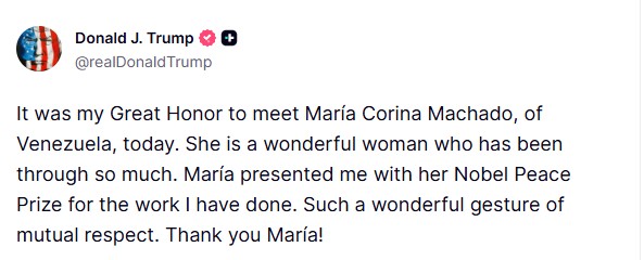 <p>ವೆನೆಜುವೆಲಾದ ವಿರೋಧ ಪಕ್ಷದ ನಾಯಕಿ ಮಾರಿಯಾ ಕೊರಿನಾ ಮಚಾದೊ ಅವರು ತಮಗೆ ದೊರೆತಿರುವ ನೊಬೆಲ್ ಶಾಂತಿ ಪ್ರಶಸ್ತಿಯನ್ನು ಅಮೆರಿಕ ಅಧ್ಯಕ್ಷ ಡೊನಾಲ್ಡ್ ಟ್ರಂಪ್ ಅವರಿಗೆ ನೀಡಿರುವುದಾಗಿ ತಿಳಿಸಿದ್ದಾರೆ. ಮಚಾದೊ ಅವರು ಶ್ವೇತಭವನದಲ್ಲಿ ಟ್ರಂಪ್ ಅವರನ್ನು ಭೇಟಿಯಾಗಿದ್ದರು.</p><p>ಈ ಕುರಿತು ಮಾಧ್ಯಮದವರಿಗೆ ಪ್ರತಿಕ್ರಿಯೆ ನೀಡಿದ ಮಚಾದೊ, ವೆನೆಜುವೆಲಾದಲ್ಲಿ ಪ್ರಜಾಪ್ರಭುತ್ವದ ಹಕ್ಕುಗಳು ಮತ್ತು ಶಾಂತಿಯುತ ಪರಿವರ್ತನೆಯನ್ನು ಉತ್ತೇಜಿಸಿದ ಕೆಲಸಕ್ಕಾಗಿ ತಮಗೆ 2025 ರಲ್ಲಿ ದೊರೆತ ನೊಬೆಲ್ ಶಾಂತಿ ಪ್ರಶಸ್ತಿಯನ್ನು ಶ್ವೇತಭವನದಲ್ಲಿ ಬಿಟ್ಟು ಬಂದಿರುವುದಾಗಿ ತಿಳಿಸಿದ್ದಾರೆ. ಆದರೆ, ಇದನ್ನು ಡೊನಾಲ್ಡ್ ಟ್ರಂಪ್ ಸ್ವೀಕರಿಸಿರುವ ಬಗ್ಗೆ ಅವರು ತಿಳಿಸಿಲ್ಲ. </p>. <p><strong>ಸಾಮಾಜಿಕ ಮಾಧ್ಯಮದಲ್ಲಿ ಮಾಹಿತಿ ಹಂಚಿಕೊಂಡ ಟ್ರಂಪ್</strong></p><p>ವೆನೆಜುವೆಲಾದ ವಿರೋಧ ಪಕ್ಷದ ನಾಯಕಿ ಮಾರಿಯಾ ಕೊರಿನಾ ಮಚಾದೊ ನೀಡಿರುವ ಪ್ರಶಸ್ತಿಯನ್ನು ಸ್ವೀಕರಿಸಿರುವುದಾಗಿ ಟ್ರಂಪ್ ತಮ್ಮ ಸಾಮಾಜಿಕ ಮಾಧ್ಯಮ ವೇದಿಕೆ ‘ಟ್ರುತ್’ನಲ್ಲಿ ಮಾಹಿತಿ ಹಂಚಿಕೊಂಡಿದ್ದಾರೆ. </p><p>‘ವೆನೆಜುವೆಲಾದ ಮರಿಯಾ ಕೊರಿನಾ ಮಚಾದೊ ಅವರನ್ನು ಭೇಟಿಯಾಗಲು ಅವಕಾಶ ಸಿಕ್ಕಿರುವುದು ನನ್ನ ಪಾಲಿಗೆ ದೊಡ್ಡ ಗೌರವವಾಗಿತ್ತು. ಮಚಾದೊ ಅನೇಕ ಕಷ್ಟಗಳನ್ನು ಎದುರಿಸಿದ್ದಾರೆ. ಮರಿಯಾ ಅವರು ತಾವು ಗೆದ್ದ ನೊಬೆಲ್ ಶಾಂತಿ ಪ್ರಶಸ್ತಿಯನ್ನು ನಾನು ಮಾಡಿದ ಕೆಸಲಗಳನ್ನು ಗುರುತಿಸಿ ನನಗೆ ಉಡುಗೊರೆಯಾಗಿ ನೀಡಿದ್ದಾರೆ. ಇಂತಹ ಅದ್ಭುತ ಸನ್ನಿವೇಶ ಸೃಷ್ಟಿಸಿದ್ದಕ್ಕಾಗಿ ನಿಮಗೆ ಧನ್ಯವಾದಗಳು. ನೀವು ಅದ್ಭುತ ಮಹಿಳೆ’ ಎಂದು ಬರೆದುಕೊಂಡಿದ್ದಾರೆ. </p>.<p>ಆದರೆ, ನೋಬೆಲ್ ಶಾಂತಿ ಪ್ರಶಸ್ತಿಯನ್ನು ವರ್ಗಾಯಿಸುವ ಅಥವಾ ಇತರರೊಂದಿಗೆ ಹಂಚಿಕೊಳ್ಳುವ ಯಾವುದೇ ಅವಕಾಶ ಇಲ್ಲ ಎಂದು ನಾರ್ವೇಜಿಯನ್ ನೊಬೆಲ್ ಸಂಸ್ಥೆ ಸ್ಪಷ್ಟಪಡಿಸಿದೆ.</p>.<div><p><strong>ಪ್ರಜಾವಾಣಿ ಆ್ಯಪ್ ಇಲ್ಲಿದೆ: <a href="https://play.google.com/store/apps/details?id=com.tpml.pv">ಆಂಡ್ರಾಯ್ಡ್ </a>| <a href="https://apps.apple.com/in/app/prajavani-kannada-news-app/id1535764933">ಐಒಎಸ್</a> | <a href="https://whatsapp.com/channel/0029Va94OfB1dAw2Z4q5mK40">ವಾಟ್ಸ್ಆ್ಯಪ್</a>, <a href="https://www.twitter.com/prajavani">ಎಕ್ಸ್</a>, <a href="https://www.fb.com/prajavani.net">ಫೇಸ್ಬುಕ್</a> ಮತ್ತು <a href="https://www.instagram.com/prajavani">ಇನ್ಸ್ಟಾಗ್ರಾಂ</a>ನಲ್ಲಿ ಪ್ರಜಾವಾಣಿ ಫಾಲೋ ಮಾಡಿ.</strong></p></div>