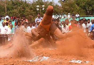 ಧಾರವಾಡದ ಕರ್ನಾಟಕ ಕಾಲೇಜು ಮೈದಾನದಲ್ಲಿ ನಡೆಯುತ್ತಿರುವ ಕರ್ನಾಟಕ ಕುಸ್ತಿ ಹಬ್ಬದಲ್ಲಿ ಸೆಣಸಾಡುತ್ತಿರುವ ಜಟ್ಟಿಗಳು: ಪ್ರಜಾವಾಣಿ ಚಿತ್ರಗಳು - ಬಿ.ಎಂ. ಕೇದಾರನಾಥ