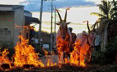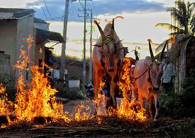 ಧಾರವಾಡ ಜಿಲ್ಲೆ ಕಲಘಟಗಿ ತಾಲ್ಲೂಕಿನ ಮಿಶ್ರಿಕೋಟಿ ಗ್ರಾಮದಲ್ಲಿ ದೀಪಾವಳಿ ಹಬ್ಬದ ಕೊನೆಯ ದಿನವಾದ ಸೋಮವಾರ ರಾಸುಗಳನ್ನು ಬೆಂಕಿಯಲ್ಲಿ ಹಾಯಿಸಲಾಯಿತು.ಚಿತ್ರಗಳು: ಈರಪ್ಪ ನಾಯ್ಕರ್