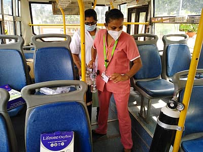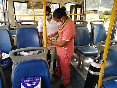 ಬಸವನಗುಡಿ ಇಂದ ಬಂದಿರುವ ಕೋರೋನಾ ಸೋಂಕಿತ ವೃದ್ಧೆಗೆ ಬಸ್‌ನಲ್ಲಿ ಆಮ್ಲಜನಕ ಪೂರೈಕೆ