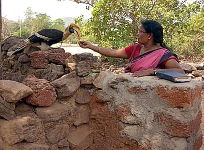 ಅಂಕೋಲಾ ತಾಲ್ಲೂಕಿನ ತಳಗದ್ದೆ ಗ್ರಾಮದಲ್ಲಿ ಮಂಗಟ್ಟೆ (ಹಾರ್ನ್ಬಿಲ್) ಹಕ್ಕಿಯೊಂದು ಮಹಿಳೆಯೊಬ್ಬರಿಂದ ಆಹಾರ ಸ್ವೀಕರಿಸಿದ ದೃಶ್ಯ. ಅತ್ಯಂತ ನಾಚಿಕೆ ಸ್ವಭಾವದ ಈ ಪಕ್ಷಿಗೆ ಮನುಷ್ಯರೆಂದರೆ ಅಷ್ಟಕ್ಕಷ್ಟೆ. ಆದರೆ, ಈ ಪಕ್ಷಿ ಸ್ಥಳೀಯರೊಂದಿಗೆ ಒಡನಾಟ ಬೆಳೆಸಿಕೊಳ್ಳುವ ಮೂಲಕ, ಅಚ್ಚರಿ ಮೂಡಿಸಿದೆ.-ಪ್ರಜಾವಾಣಿ ಚಿತ್ರ