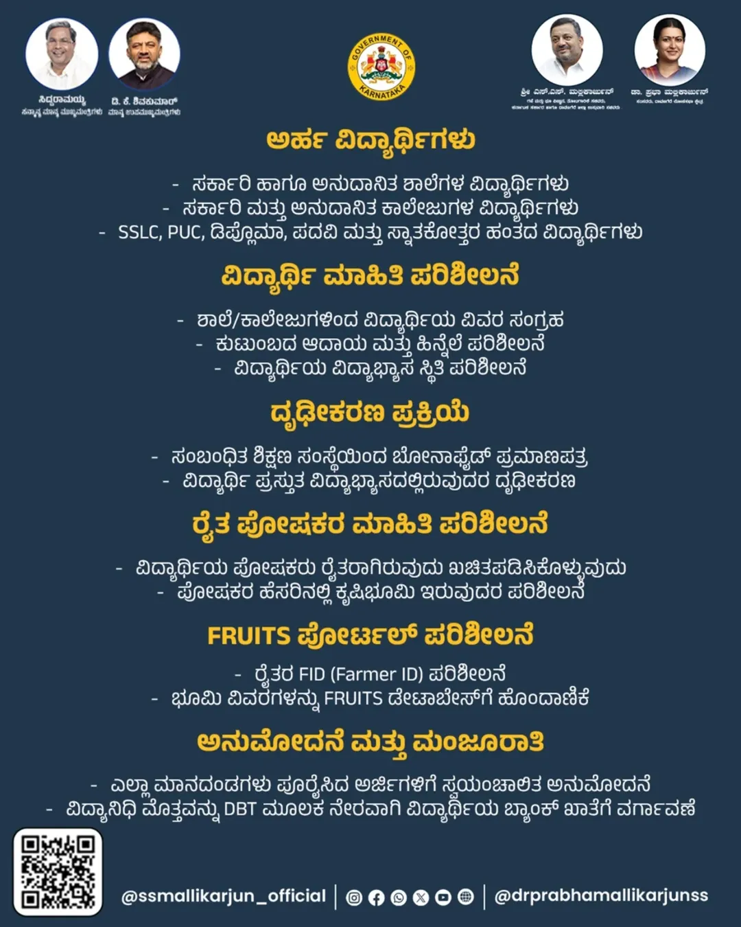 <p>ರಾಜ್ಯ ಸರ್ಕಾರ ರೈತ ಮಕ್ಕಳಿಗಾಗಿ ರೂಪಿಸಿರುವ ಮುಖ್ಯಮಂತ್ರಿ ರೈತ ವಿದ್ಯಾನಿಧಿ ಯೋಜನೆಗೆ ಅರ್ಜಿ ಆಹ್ವಾನಿಸಿದೆ. ಮುಖ್ಯಮಂತ್ರಿ ರೈತ ವಿದ್ಯಾನಿಧಿ ಯೋಜನೆಯಡಿ ರೈತರ ಮಕ್ಕಳಿಗೆ ಉನ್ನತ ಶಿಕ್ಷಣ ಮುಂದುವರಿಸಲು ವಿದ್ಯಾರ್ಥಿವೇತನ ಸೌಲಭ್ಯ ಕಲ್ಪಿಸಲಾಗಿದೆ. ಈ ಯೋಜನೆಯಡಿ ರಾಜ್ಯದ ಎಲ್ಲಾ ರೈತ ಮಕ್ಕಳು ಅರ್ಹತೆಯ ಆಧಾರದಲ್ಲಿ ಅರ್ಜಿ ಸಲ್ಲಿಸಬಹುದು.</p><p>ಈ ಯೋಜನೆಯ ಸೌಲಭ್ಯ ಪಡೆಯಲು ಅರ್ಜಿ ಸಲ್ಲಿಸುವುದು ಹೇಗೆ? ಇರಬೇಕಾದ ಅರ್ಹತೆಗಳೇನು? ಎಂಬ ಮಾಹಿತಿಯನ್ನು ತಿಳಿಯೋಣ.</p><p><strong>ಯಾರು ಅರ್ಜಿ ಸಲ್ಲಿಸಬಹುದು?</strong></p><p>ರಾಜ್ಯದಲ್ಲಿರುವ ಎಲ್ಲಾ ರೈತ ಮಕ್ಕಳು ಈ ಯೋಜನೆಯನ್ನು ಪಡೆಯಲು ಅರ್ಹರಾಗಿರುತ್ತಾರೆ.</p><ul><li><p>ಸರ್ಕಾರಿ ಹಾಗೂ ಅನುದಾನಿತ ಶಾಲೆಗಳ ವಿದ್ಯಾರ್ಥಿಗಳು</p></li><li><p>ಸರ್ಕಾರಿ ಮತ್ತು ಅನುದಾನಿತ ಕಾಲೇಜುಗಳ ವಿದ್ಯಾರ್ಥಿಗಳು</p></li><li><p>ಎಸ್ಎಸ್ಎಲ್ಸಿ, ಪಿಯುಸಿ, ಪದವಿ ಹಾಗೂ ಸ್ನಾತಕೋತ್ತರ ಪದವಿಯ ವಿದ್ಯಾರ್ಥಿಗಳು ಅರ್ಜಿ ಸಲ್ಲಿಸಬಹುದಾಗಿದೆ. </p></li></ul>.<p><strong>ಅಗತ್ಯ ದಾಖಲಾತಿಗಳೇನು?</strong></p><ul><li><p>ಶಾಲೆ ಅಥವಾ ಕಾಲೇಜುಗಳ ಪ್ರಮಾಣಪತ್ರ</p></li><li><p>ಕುಟುಂಬದ ಆದಾಯ ಪ್ರಮಾಣ ಪತ್ರ ಮತ್ತು ಹಿನ್ನೆಲೆ ಪರಿಶೀಲನೆ</p></li><li><p>ವಿದ್ಯಾರ್ಥಿಯ ಪೋಷಕರು ರೈತರಾಗಿರುವುದನ್ನು ಖಚಿತಪಡಿಸಿಕೊಳ್ಳುವುದು</p></li><li><p>ಪೋಷಕರ ಹೆಸರಿನಲ್ಲಿ ಕೃಷಿಭೂಮಿ ಇರುವುದರ ಪರಿಶೀಲನೆ</p></li><li><p> 'fruits' ಪೋರ್ಟಲ್ ಪರಿಶೀಲನೆ</p></li><li><p>ರೈತರ (farmer ID) ಪರಿಶೀಲನೆ</p></li><li><p>ಭೂಮಿ ವಿವರಗಳನ್ನು 'fruits' ಡೇಟಾಬೇಸ್ಗೆ ಹೊಂದಾಣಿಕೆ</p></li></ul><p><strong>ಅನುಮೋದನೆ ಹೇಗೆ? </strong></p><p>ಮೇಲಿನ ಎಲ್ಲಾ ಮಾನದಂಡಗಳನ್ನು ಪೂರೈಸಿದ ಬಳಿಕ ಅರ್ಜಿಯನ್ನು ಅನುಮೋದನೆಗೊಳಿಸಲಾಗುತ್ತದೆ. ಬಳಿಕ ವಿದ್ಯಾರ್ಥಿ ನಿಧಿಯ ಮೊತ್ತ ನೇರವಾಗಿ ವಿದ್ಯಾರ್ಥಿಯ ಬ್ಯಾಂಕ್ ಖಾತೆಗೆ ವರ್ಗಾವಣೆಯಾಗುತ್ತದೆ ಎಂದು ಇಲಾಖೆ ತಿಳಿಸಿದೆ. </p>.<p><a href="https://ssp.postmatric.karnataka.gov.in/" rel="nofollow">https://ssp.postmatric.karnataka.gov.in</a>ಇಲಾಖೆಯ ಅಧಿಕೃತ ಜಾಲತಾಣಕ್ಕೆ ಭೇಟಿ ನೀಡಿ. ಅಲ್ಲಿ ನಿಮ್ಮ ವಿದ್ಯಾರ್ಹತೆಗೆ ಅನುಗುಣವಾಗಿ ತರಗತಿಯನ್ನು ಆಯ್ಕೆ ಮಾಡಿರಿ. ಬಳಿಕ ಖಾತೆಯನ್ನು ರಚಿಸಿ. ಅಲ್ಲಿ ಕೇಳಲಾದ ವಿವರಗಳನ್ನು ಭರ್ತಿ ಮಾಡಿ ಅರ್ಜಿ ಸಲ್ಲಿಸಿ.</p>.<div><p><strong>ಪ್ರಜಾವಾಣಿ ಆ್ಯಪ್ ಇಲ್ಲಿದೆ: <a href="https://play.google.com/store/apps/details?id=com.tpml.pv">ಆಂಡ್ರಾಯ್ಡ್ </a>| <a href="https://apps.apple.com/in/app/prajavani-kannada-news-app/id1535764933">ಐಒಎಸ್</a> | <a href="https://whatsapp.com/channel/0029Va94OfB1dAw2Z4q5mK40">ವಾಟ್ಸ್ಆ್ಯಪ್</a>, <a href="https://www.twitter.com/prajavani">ಎಕ್ಸ್</a>, <a href="https://www.fb.com/prajavani.net">ಫೇಸ್ಬುಕ್</a> ಮತ್ತು <a href="https://www.instagram.com/prajavani">ಇನ್ಸ್ಟಾಗ್ರಾಂ</a>ನಲ್ಲಿ ಪ್ರಜಾವಾಣಿ ಫಾಲೋ ಮಾಡಿ.</strong></p></div>