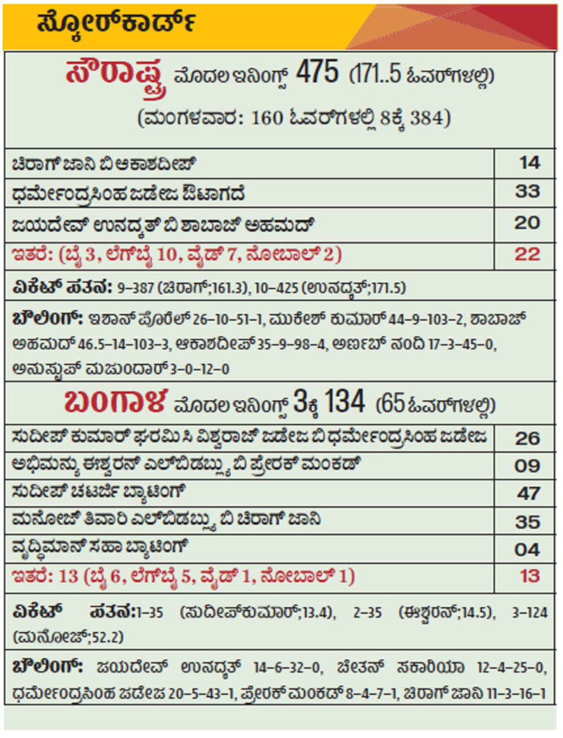 <figcaption>""</figcaption>.<p><strong>ರಾಜ್ಕೋಟ್:</strong> ಸೌರಾಷ್ಟ್ರ ಕ್ರಿಕೆಟ್ ಸಂಸ್ಥೆಯ ಕ್ರೀಡಾಂಗಣದಲ್ಲಿ ಆತಿಥೇಯ ತಂಡ ಮತ್ತು ಬಂಗಾಳ ಇಬ್ಬರಿಗೂ ಪಂದ್ಯ ಗೆಲ್ಲುವತ್ತ ಹೆಚ್ಚು ಒಲವಿಲ್ಲ. ಆದರೆ ಮೊದಲ ಇನಿಂಗ್ಸ್ ಮುನ್ನಡೆ ಸಿಕ್ಕರೆ ಸಾಕೆಂಬ ಹೋರಾಟ ಉಭಯ ತಂಡಗಳದ್ದು.</p>.<p>ಇಲ್ಲಿ ನಡೆಯುತ್ತಿರುವ ರಣಜಿ ಟ್ರೋಫಿ ಫೈನಲ್ನ ಮೂರನೇ ದಿನವಾದ ಬುಧವಾರ ನಡೆದ ಆಟ ನೋಡಿದವರಿಗೆ ಹೀಗೆ ಅನಿಸುವುದರಲ್ಲಿ ಅನುಮಾನವೇ ಇಲ್ಲ. ಮೊದಲ ದಿನದಿಂದಲೇ ಕೆಳಮಟ್ಟದಲ್ಲಿ ಪುಟಿದೆದ್ದು ಬರುತ್ತಿರುವ ಚೆಂಡನ್ನು ಆಡುವುದು ಬ್ಯಾಟ್ಸ್ಮನ್ಗಳಿಗೆ ಸವಾಲಿನ ಪರಿಸ್ಥಿತಿ ತಂದೊಡ್ಡಿದೆ.</p>.<p>ದಿನದಿಂದ ದಿನಕ್ಕೆ ಸತ್ವ ಕಳೆದುಕೊಳ್ಳುತ್ತಿರುವ ಪಿಚ್ನಲ್ಲಿ ರನ್ ಗಳಿಕೆ ದುಸ್ತರವಾಗುತ್ತಿದೆ. ಸೌರಾಷ್ಟ್ರವು ಮೊದಲ ಇನಿಂಗ್ಸ್ನಲ್ಲಿ 425 ರನ್ ಗಳಿಸಿದೆ. ಬಂಗಾಳ ತಂಡವು ಮುನ್ನಡೆಗಾಗಿ ಈಗ ದೊಡ್ಡ ಹೋರಾಟ ನಡೆಸಬೇಕಾದ ಪರಿಸ್ಥಿತಿಯಲ್ಲಿದೆ.</p>.<p>ಸುದೀಪ್ ಚಟರ್ಜಿ (ಬ್ಯಾಟಿಂಗ್ 47; 145ಎಸೆತ, 5ಬೌಂಡರಿ) ಮತ್ತು ಅನುಭವಿ ಮನೋಜ್ ತಿವಾರಿ (35; 116ಎ, 2ಬೌಂ) ಅವರ ತಾಳ್ಮೆಯ ಬ್ಯಾಟಿಂಗ್ ಫಲವಾಗಿ ದಿನದಾಟದ ಅಂತ್ಯಕ್ಕೆ 65 ಓವರ್ಗಳಲ್ಲಿ 3 ವಿಕೆಟ್ಗಳಿಗೆ 134 ರನ್ ಗಳಿಸಿದೆ. ಇನಿಂಗ್ಸ್ ಮುನ್ನಡೆ ಪಡೆಯಬೇಕಾದರೆ ಇನ್ನೂ 292 ರನ್ ಗಳಿಸಬೇಕಿದೆ. ಕ್ವಾರ್ಟರ್ಫೈನಲ್ ಮತ್ತು ಸೆಮಿಫೈನಲ್ನಲ್ಲಿ ಶತಕ ಬಾರಿಸಿದ್ದ ಅನುಸ್ಟುಪ್ ಮಜುಂದಾರ್ (ಬ್ಯಾಟಿಂಗ್ 4; 43ಎ, 1ಬೌಂ) ಸುದೀಪ್ ಜೊತೆಗೆ ಕ್ರೀಸ್ನಲ್ಲಿದ್ದಾರೆ.</p>.<p><strong>407 ಎಸೆತಗಳು, 175 ರನ್:</strong> ಮೂರನೇ ದಿನದಾಟವು ಬ್ಯಾಟ್ಸ್ಮನ್ಗಳ ತಾಳ್ಮೆಯನ್ನು ಕಠಿಣ ಪರೀಕ್ಷೆಗೆ ಒಡ್ಡಿತ್ತು. ಆದ್ದರಿಂದ ಇಡೀ ದಿನ ಆಮೆಗತಿಯ ಆಟ ನಡೆಯಿತು. ಇಡೀ ದಿನ ದಾಖಲಾಗಿದ್ದು ಕೇವಲ 175 ರನ್ಗಳು ಮಾತ್ರ. ಆದರೆ, ಬೌಲರ್ಗಳು ಪ್ರಯೋಗಿಸಿದ್ದು 407 ಎಸೆತಗಳನ್ನು.</p>.<p>ಮಂಗಳವಾರ ದಿನದಾಟದ ಕೊನೆಗೆ ಆತಿಥೇಯ ತಂಡ 160 ಓವರ್ಗಳಲ್ಲಿ 8 ವಿಕೆಟ್ಗಳಿಗೆ 384 ರನ್ ಗಳಿಸಿತ್ತು. ಕ್ರೀಸ್ನಲ್ಲಿದ್ದ ಚಿರಾಗ್ ಜಾನಿ (14 ರನ್), ಧರ್ಮೇಂದ್ರಸಿಂಹ ಜಡೇಜ (ಔಟಾಗದೆ 33; 52ಎ, 5ಬೌಂ) ಮತ್ತು ನಾಯಕ ಜಯದೇವ್ ಉನದ್ಕತ್ (20; 35ಎ) ಅವರ ಕಾಣಿಕೆಯ ಫಲವಾಗಿ ತಂಡವು 400ರ ಗಡಿ ದಾಟಿತು. ತಂಡವು ಮೂರನೇ ದಿನ ಬೆಳಿಗ್ಗೆ 11.5 ಓವರ್ಗಳಲ್ಲಿ 41 ರನ್ ಗಳಿಸಿತು.</p>.<p>ಇನಿಂಗ್ಸ್ ಆರಂಭಿಸಿದ ಬಂಗಾಳ ತಂಡಕ್ಕೆ 14ನೇ ಓವರ್ನಲ್ಲಿ ಧರ್ಮೇಂದ್ರಸಿಂಹ ಜಡೇಜ ಪೆಟ್ಟು ಕೊಟ್ಟರು.ಸುದೀಪ್ ಕುಮಾರ್ (26 ರನ್) ವಿಕೆಟ್ ಪಡೆದು ಸಂಭ್ರಮಿಸಿದರು. ನಾಯಕ ಅಭಿಮನ್ಯು ಈಶ್ವರನ್ ಆಟಕ್ಕೆ ಪ್ರೇರಕ್ ಮಂಕಡ್<br />ಅಡ್ಡಿಯಾದರು. ಆದರೆ ಸುದೀಪ್ ಚಟರ್ಜಿ ಮತ್ತು ಮನೋಜ್ ಅವರು ಮೂರನೇ ವಿಕೆಟ್ ಜೊತೆಯಾಟದಲ್ಲಿ 38.3 ಓವರ್ಗಳನ್ನು ಆಡಿ 89 ರನ್ ಸೇರಿಸಿದರು. ಈ ಅವಧಿಯಲ್ಲಿ ಬೌಲರ್ಗಳ ಎಲ್ಬಿಡಬ್ಲ್ಯು ಮನವಿಗಳು ಕ್ರೀಡಾಂಗಣದಲ್ಲಿ ಪ್ರತಿಧ್ವನಿಸಿದವು.</p>.<p>53ನೇ ಓವರ್ನಲ್ಲಿ ಕಡೆಗೂ ತಿವಾರಿ ಅವರನ್ನು ಎಲ್ಬಿ ಬಲೆಗೆ ಬೀಳಿಸುವಲ್ಲಿ ಚಿರಾಗ್ ಯಶಸ್ವಿಯಾದರು. ಕ್ರೀಸ್ಗೆ ಬಂದ ವೃದ್ಧಿಮಾನ್ ಸಹಾ (ಬ್ಯಾಟಿಂಗ್ 4; 43ಎ) ಕೂಡ ತಾಳ್ಮೆಯ ಆಟಕ್ಕೆ ಹೊಂದಿಕೊಂಡರು.</p>.<p><strong>ಪೂಜಾರಗೆ ಬೆನ್ನುನೋವು</strong><br /><strong>ರಾಜ್ಕೋಟ್:</strong> ರಣಜಿ ಟ್ರೋಫಿ ಕ್ರಿಕೆಟ್ ಟೂರ್ನಿಯ ಫೈನಲ್ನ ಮೊದಲ ದಿನ ಜ್ವರದಿಂದ ಬಳಲಿದ್ದ ಸೌರಾಷ್ಟ್ರದ ಚೇತೇಶ್ವರ್ ಪೂಜಾರ ಅವರನ್ನು ಈಗ ಬೆನ್ನುನೋವು ಕಾಡುತ್ತಿದೆ. ಅದರಿಂದಾಗಿ ಪಂದ್ಯದಲ್ಲಿ ಉಳಿದಿರುವ ಇನ್ನೆರಡು ದಿನಗಳಲ್ಲಿಯೂ ಅವರು ಕಣಕ್ಕಿಳಿಯುವುದು ಅನುಮಾನವಾಗಿದೆ.</p>.<p>