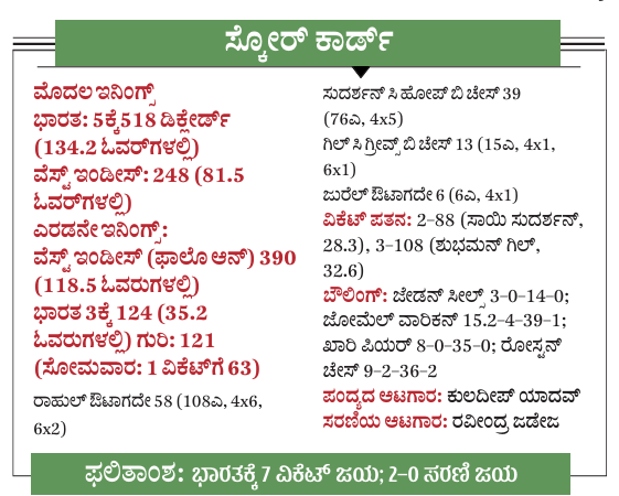 <p><strong>ನವದೆಹಲಿ</strong>: ವೆಸ್ಟ್ ಇಂಡೀಸ್ ತಂಡದ ಹೋರಾಟದ ಪರಿಣಾಮ ಅಂತಿಮ ದಿನದವರೆಗೆ ಬೆಳೆದ ಎರಡನೇ ಕ್ರಿಕೆಟ್ ಟೆಸ್ಟ್ ಪಂದ್ಯವನ್ನು ಭಾರತ ಮಂಗಳವಾರ ಏಳು ವಿಕೆಟ್ಗಳಿಂದ ಸುಲಭವಾಗಿಯೇ ಗೆದ್ದುಕೊಂಡಿತು. ಸರಣಿಯನ್ನು ನಿರೀಕ್ಷೆಯಂತೆ 2–0 ಯಿಂದ ಕ್ಲೀನ್ಸ್ವೀಪ್ ಮಾಡಿತು. ಮುಂದಿನ ತಿಂಗಳ ಕಠಿಣ ದಕ್ಷಿಣ ಆಫ್ರಿಕಾ ಸರಣಿಗೆ ಸಜ್ಜಾಯಿತು.</p>.<p>ಅರುಣ್ ಜೇಟ್ಲಿ ಕ್ರೀಡಾಂಗಣದಲ್ಲಿ ಗೆಲುವಿಗೆ 121 ರನ್ಗಳ ಗುರಿ ಎದುರಿಸಿದ್ದ ಭಾರತ 1 ವಿಕೆಟ್ಗೆ 63 ರನ್ ಗಳಿಸಿ ದಿನದಾಟ ಮುಂದುವರಿಸಿತು. ಗೆಲ್ಲಲು ಎಷ್ಟು ಹೊತ್ತು ಹಿಡಿಯಬಹುದೆಂಬ ಆಸಕ್ತಿಯಷ್ಟೇ ಉಳಿದಿತ್ತು. ಸರಿಯಾಗಿ ಒಂದು ಗಂಟೆಯಲ್ಲಿ ಈ ಔಪಚಾರವನ್ನು ಪೂರೈಸಿತು. ಇನಿಂಗ್ಸ್ಗೆ ಲಂಗರು ಹಾಕಿದ ಕೆ.ಎಲ್.ರಾಹುಲ್ (ಅಜೇಯ 58, 108ಎ, 4x6, 6x2) ಅವರು ಜೊಮೆಲ್ ವಾರಿಕನ್ ಬೌಲಿಂಗ್ನಲ್ಲಿ ಮಿಡ್ಆನ್ಗೆ ಬೌಂಡರಿ ಬಾರಿಸಿ ಗೆಲುವಿನ ರನ್ ಗಳಿಸಿದರು.</p>.<p>ಇದು ನಾಯಕನಾಗಿ ಗಿಲ್ ಅವರಿಗೆ ತವರಿನಲ್ಲಿ ಮೊದಲ ಸರಣಿ ಗೆಲುವು. ವೆಸ್ಟ್ ಇಂಡೀಸ್ ವಿರುದ್ಧ ಇದು ಭಾರತಕ್ಕೆ ಸತತ ಹತ್ತನೇ ಸರಣಿ ಜಯ. ಒಂದು ಕಾಲದಲ್ಲಿ ಜಗತ್ತಿನ ಪ್ರಬಲ ಶಕ್ತಿಯಾಗಿದ್ದ ವೆಸ್ಟ್ ಇಂಡೀಸ್ ತಂಡ 2002ರ ಮೇ ನಂತರ ಭಾರತ ವಿರುದ್ಧ ಒಂದೂ ಟೆಸ್ಟ್ ಗೆದ್ದಿಲ್ಲ. ಇಂಗ್ಲೆಂಡ್ ಸರಣಿಯಲ್ಲಿ ವಿಫಲರಾಗಿದ್ದ ಸಾಯಿ ಸುದರ್ಶನ್ ಅವರಿಗೆ ಇಲ್ಲಿ ಒಳ್ಳೆಯ ಅವಕಾಶ ದೊರೆಯಿತು. ಕುಲದೀಪ್ ಯಾದವ್ ಅವರಿಗೆ ಆ ಪ್ರವಾಸದಲ್ಲಿ ಒಂದೂ ಪಂದ್ಯ ಆಡುವ ಅವಕಾಶ ದೊರೆತಿರಲಿಲ್ಲ. ಇಲ್ಲಿ ದೊರೆತ ವೇದಿಕೆಯನ್ನು ಸಮರ್ಥವಾಗಿ ಬಳಸಿಕೊಂಡ ಕುಲದೀಪ್ ತಾವೆಷ್ಟು ಅಮೂಲ್ಯ ಆಟಗಾರ ಎಂಬುದನ್ನು ಸಾಬೀತುಪಡಿಸಿದರು.</p>.<p>ಇದಕ್ಕೆ ಮೊದಲು ಏಷ್ಯಾ ಕಪ್ ಟಿ20 ಟೂರ್ನಿಯಲ್ಲೂ ಕುಲದೀಪ್ ಅವರು ಪರಿಣಾಮಕಾರಿ ಎನಿಸಿದ್ದರು. ವಿಶ್ವದ ಶ್ರೇಷ್ಠ ಸ್ಪಿನ್ನರ್ ತಾವೆಂಬುದನ್ನು ಕಲೆಗಾರಿಕೆ ಮೂಲಕ ತೋರಿಸಿಕೊಟ್ಟರು. ಮೊದಲ ಇನಿಂಗ್ಸ್ನಲ್ಲಿ 82 ರನ್ನಿಗೆ 5 ವಿಕೆಟ್ ಪಡೆದಿದ್ದರು. ಎರಡನೇ ಸರದಿಯಲ್ಲಿ ಮತ್ತೆ ಮೂರು ವಿಕೆಟ್ ಪಡೆದು ‘ಪಂದ್ಯದ ಆಟಗಾರ’ನಾದರು. ಕೋಟ್ಲದಂಥ ನಿರ್ಜೀವ ಪಿಚ್ನಲ್ಲೂ ಚಮತ್ಕಾರ ಮೆರೆದರು.</p>.<p>ಈ ಸರಣಿಯ ಮೊದಲ ಟೆಸ್ಟ್ನಲ್ಲಿ ಸಾಯಿ ಸುದರ್ಶನ್ ಮತ್ತೆ ವಿಫಲರಾಗಿದ್ದರು. ಅವರ ಮೇಲೆ ಒತ್ತಡವಿತ್ತು. ಆದರೆ 23 ವರ್ಷದ ಎಡಗೈ ಆಟಗಾರ ಮೊದಲ ಇನಿಂಗ್ಸ್ನಲ್ಲಿ 87 ರನ್ ಬಾರಿಸುವ ಮೂಲಕ ಟೀಕಾಕಾರರ ಬಾಯಿಮುಚ್ಚಿಸಿದರು. ಅವರಿಗೆ ಈ ಇನಿಂಗ್ಸ್ ಅಗತ್ಯವಿದ್ದ ಆತ್ಮವಿಶ್ವಾಸ ತುಂಬಿತು.</p>.<p>ಈ ಸರಣಿಯಲ್ಲಿ ರಾಹುಲ್, ಜೈಸ್ವಾಲ್ ಮತ್ತು ಗಿಲ್ ಶತಕಗಳನ್ನು ಬಾರಿಸಿ ಇಂಗ್ಲೆಂಡ್ ವಿರುದ್ಧದ ಸರಣಿಯ ಯಶಸ್ಸನ್ನು ಇಲ್ಲೂ ಮುಂದುವರಿಸಿದರು. ರಾಹುಲ್ ಅವರು ನಾಲ್ಕನೇ ದಿನ ಕೊಟ್ಟ ಸುಳಿವು ಕ್ಯಾಂಪ್ಬೆಲ್ ವಿಕೆಟ್ ಪಡೆಯುವಲ್ಲಿ ಜಡೇಜಗೆ ನೆರವಾಯಿತು. ಹಿರಿಯ ಆಟಗಾರನಾಗಿ ಅವರು ನೆಟ್ಸ್ನಲ್ಲೂ ಯುವ ಆಟಗಾರರಿಗೆ ಸಲಹೆಗಳನ್ನು ನೀಡುತ್ತ ಬಂದಿದ್ದಾರೆ.</p>.<p>36 ವರ್ಷ ವಯಸ್ಸಿನ ಜಡೇಜ ತಮ್ಮ ಆಲ್ರೌಂಡ್ ಆಟಕ್ಕಾಗಿ ಸರಣಿಯ ಆಟಗಾರನಾದರು. ಪಂತ್ ಗಾಯಾಳಾದ ನಂತರ ಅವರು ಉಪನಾಯಕರಾಗಿದ್ದರು. ನಿಸ್ಸಂದೇಹವಾಗಿಯೂ ತಂಡದ ಪಾಲಿಗೆ ಅತಿ ಮೌಲ್ಯಯುತ ಆಟಗಾರ ಎನಿಸಿದರು. ಈ ಸರಣಿಯ ಸದುಪಯೋಗ ಪಡೆದ ಮತ್ತೊಬ್ಬರೆಂದರೆ ವಿಕೆಟ್ ಕೀಪರ್ ಧ್ರುವ್ ಜುರೆಲ್. ಗಾಯಾಳಾಗಿದ್ದ ಪಂತ್ ಅವರ ಬದಲು ಅವಕಾಶ ಪಡೆದ ಉತ್ತರ ಪ್ರದೇಶದ ಈ ಆಟಗಾರ ಮೊದಲ ಟೆಸ್ಟ್ನಲ್ಲಿ ಶತಕ ಬಾರಿಸಿದ್ದರು. ಇಲ್ಲಿ ಬಿರುಸಿನ 44 ರನ್ ಹೊಡೆದರ