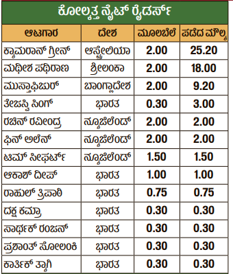 <p><strong>ಅಬುಧಾಬಿ:</strong> ಇಂಡಿಯನ್ ಪ್ರೀಮಿಯರ್ ಲೀಗ್ 19ನೇ ಆವೃತ್ತಿಗಾಗಿ ಅಬುಧಾಬಿಯಲ್ಲಿ ಡಿ.16ರಂದು ನಡೆದ ಮಿನಿ ಹರಾಜಿನಲ್ಲಿ 3 ಬಾರಿಯ ಚಾಂಪಿಯನ್ ಕೋಲ್ಕತ್ತ ನೈಟ್ ರೈಡರ್ಸ್ (ಕೆಕೆಆರ್) ತಂಡವು 13 ಆಟಗಾರರನ್ನು ಖರೀದಿಸಿದೆ. </p><p>ಅತಿ ಹೆಚ್ಚು ಮೊತ್ತದೊಂದಿಗೆ ಶಾರುಖ್ ಖಾನ್ ಮಾಲೀಕತ್ವದ ಕೆಕೆಆರ್ ತಂಡವು ಮಿನಿ ಹರಾಜಿನಲ್ಲಿ ಭಾಗವಹಿಸಿತ್ತು. ₹63.85 ಕೋಟಿ ಮೊತ್ತದೊಂದಿಗೆ ಕಣಕ್ಕಿಳಿದಿತ್ತು. </p><p>ಆ್ಯಂಡ್ರೆ ರಸೆಲ್ ಅವರನ್ನು ತಂಡದಿಂದ ಕೈಬಿಟ್ಟಿದ್ದ ಕೆಕೆಆರ್, ಮಿನಿ ಹರಾಜಿನಲ್ಲಿ ಅವರ ಜಾಗಕ್ಕೆ ಆಸೀಸ್ ಆಲ್ರೌಂಡರ್ ಕ್ಯಾಮರೂನ್ ಗ್ರೀನ್ ಅವರನ್ನು ಅತ್ಯಧಿಕ ಮೊತ್ತಕ್ಕೆ (₹25.2 ಕೋಟಿ) ಖರೀದಿಸಿತು. </p><p>ಮಿನಿ ಹರಾಜಿನಲ್ಲಿ ದೇಶಿ ಹಾಗೂ ವಿದೇಶಿ ಆಟಗಾರರು ಸೇರಿದಂತೆ ಒಟ್ಟು 13 ಆಟಗಾರರನ್ನು ಕೆಕೆಆರ್ ಫ್ರಾಂಚೈಸಿಯು ತನ್ನ ತಂಡಕ್ಕೆ ಸೇರಿಸಿಕೊಂಡಿತು. </p>.<h3>ಮಿನಿ ಹರಾಜಿನಲ್ಲಿ ಖರೀದಿಸಿದ ಆಟಗಾರರು </h3>.<p><strong>ಕೋಲ್ಕತ್ತ ನೈಟ್ ರೈಡರ್ಸ್ ಸಂಪೂರ್ಣ ತಂಡ:</strong> ಅಜಿಂಕ್ಯಾ ರಹಾನೆ, ರಘುವಂಶಿ, ಮನೀಶ್ ಪಾಂಡೆ, ರಿಂಕು ಸಿಂಗ್, ರೋಮನ್ ಪೋವೆಲ್, ಅಂಕುಲ್ ರಾಯ್, ರಮಣ್ ದೀಪ್ ಸಿಂಗ್, ಸುನೀಲ್ ನರೈನ್, ಹರ್ಷಿತ್ ರಾಣಾ, ಉಮ್ರಾನ್ ಮಲೀಕ್, ವೈಭವ್ ಆರೋರಾ, ವರುಣ್ ಚಕ್ರವರ್ತಿ, ಕ್ಯಾಮರೂನ್ ಗ್ರೀನ್, ಫಿನ್ ಅಲೆನ್, ಮಥೀಶ ಪಥಿರಾಣ, ತೇಜಸ್ವಿ ಸಿಂಗ್, ಕಾರ್ತಿಕ್ ತ್ಯಾಗಿ, ಪ್ರಶಾಂತ್ ಸೋಲಂಕಿ, ರಾಹುಲ್ ತ್ರಿಪಾಠಿ, ಟಿಮ್ ಸೀಫರ್ಟ್, ಮುಸ್ತಾಫಿಜರ್ ರೆಹಮಾನ್, ರಚಿನ್ ರವೀಂದ್ರ , ಆಕಾಶ್ ದೀಪ್ , ದಕ್ಷ ಕಮ್ರಾ , ಸಾರ್ಥಕ್ ರಂಜನ್ </p>.IPL Auction: ಹರಾಜಿನಲ್ಲಿ ಖರೀದಿಯಾಗದೇ ಉಳಿದ ಸ್ಟಾರ್ ಆಟಗಾರರ ಪಟ್ಟಿ ಇಲ್ಲಿದೆ.IPL Auction: ಅನ್ಕ್ಯಾಪ್ಡ್ ಭಾರತೀಯ ಆಟಗಾರರಿಗೆ ತೆರೆದ ಅದೃಷ್ಟದ ಬಾಗಿಲು.<div><p><strong>ಪ್ರಜಾವಾಣಿ ಆ್ಯಪ್ ಇಲ್ಲಿದೆ: <a href="https://play.google.com/store/apps/details?id=com.tpml.pv">ಆಂಡ್ರಾಯ್ಡ್ </a>| <a href="https://apps.apple.com/in/app/prajavani-kannada-news-app/id1535764933">ಐಒಎಸ್</a> | <a href="https://whatsapp.com/channel/0029Va94OfB1dAw2Z4q5mK40">ವಾಟ್ಸ್ಆ್ಯಪ್</a>, <a href="https://www.twitter.com/prajavani">ಎಕ್ಸ್</a>, <a href="https://www.fb.com/prajavani.net">ಫೇಸ್ಬುಕ್</a> ಮತ್ತು <a href="https://www.instagram.com/prajavani">ಇನ್ಸ್ಟಾಗ್ರಾಂ</a>ನಲ್ಲಿ ಪ್ರಜಾವಾಣಿ ಫಾಲೋ ಮಾಡಿ.</strong></p></div>