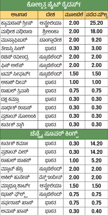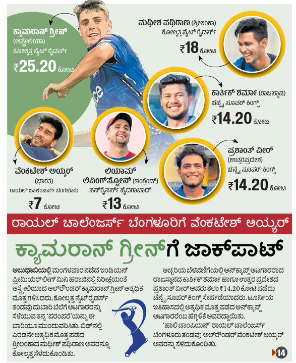 <p><strong>ಅಬುಧಾಬಿ:</strong> ಕೋಲ್ಕತ್ತ ನೈಟ್ ರೈಡರ್ಸ್ ತಂಡವು ಪ್ರತಿವರ್ಷದಂತೆ ಈ ಬಾರಿಯೂ ದೊಡ್ಡ ಮೊತ್ತವನ್ನು ನೀಡಿ ಆಟಗಾರರನ್ನು ಖರೀದಿಸುವ ‘ಸಂಪ್ರದಾಯ’ ಮುಂದುವರಿಸಿತು. ಈ ಸಲ ಆಸ್ಟ್ರೇಲಿಯಾ ಆಲ್ರೌಂಡರ್ ಕ್ಯಾಮರಾನ್ ಗ್ರೀನ್ ಅವರನ್ನು ತನ್ನ ತೆಕ್ಕೆಗೆಳೆದುಕೊಂಡಿತು. </p><p>ಮಂಗಳವಾರ ನಡೆದ ಐಪಿಎಲ್ ಆಟಗಾರರ ಮಿನಿ ಹರಾಜು ಪ್ರಕ್ರಿಯೆ ಯಲ್ಲಿ ಮೊದಲೇ ನಿರೀಕ್ಷಿಸಿದಂತೆ ಗ್ರೀನ್ ಅವರು ಅತ್ಯಧಿಕ ಮೊತ್ತ ಪಡೆದರು. ಅವರಿಗೆ ಕೋಲ್ಕತ್ತ ತಂಡವು ₹25.20 ಕೋಟಿ ನೀಡಿ ಖರೀದಿಸಿತು. ಶ್ರೀಲಂಕಾದ ವೇಗಿ ಮಥೀಶ ಪಥಿರಾಣ ಅವರನ್ನೂ ಕೆಕೆಆರ್ ತಂಡವು ₹ 18 ಕೋಟಿಗೆ ತನ್ನ ಬಳಗಕ್ಕೆ ಸೇರಿಸಿಕೊಂಡಿತು. </p><p>ಇನ್ನೊಂದೆಡೆ ಚೆನ್ನೈ ಸೂಪರ್ ಕಿಂಗ್ಸ್ ತಂಡವು ಯಥಾಪ್ರಕಾರ ಅಚ್ಚರಿಯ ಆಯ್ಕೆ ಮಾಡಿಕೊಂಡಿತು. ಪ್ರತಿ ಸಲವೂ ಅನುಭವಿ ಆಟಗಾರರನ್ನು ಆಯ್ಕೆ ಮಾಡುತ್ತಿದ್ದ ತಂಡವು ಈ ಬಾರಿ ಉದಯೋನ್ಮುಖ ಪ್ರತಿಭೆಗಳಿಗೆ ಮಣೆ ಹಾಕಿತು. ಉತ್ತರಪ್ರದೇಶದ 20 ವರ್ಷದ ಎಡಗೈ ಸ್ಪಿನ್ನರ್ ಪ್ರಶಾಂತ್ ವೀರ್ ಮತ್ತು 19 ವರ್ಷದ ವಿಕೆಟ್ಕೀಪರ್ –ಬ್ಯಾಟರ್, ರಾಜಸ್ಥಾನದ ಕಾರ್ತಿಕ್ ಶರ್ಮಾ ಅವರನ್ನು ಚೆನ್ನೈ ಖರೀದಿಸಿತು. ಟೂರ್ನಿಯ ಇತಿಹಾಸದಲ್ಲಿ ಅತಿ ದೊಡ್ಡ ಮೌಲ್ಯ ಪಡೆದ ‘ಅನ್ಕ್ಯಾಪ್ಡ್’ ಆಟಗಾರರೆಂಬ ಹೆಗ್ಗಳಿಕೆ ಇವರದ್ದಾಯಿತು. ಅವರ ಮೂಲಬೆಲೆಯು ₹ 30 ಲಕ್ಷ ನಿಗದಿ ಯಾಗಿತ್ತು. ಜಮ್ಮು–ಕಾಶ್ಮೀರದ ವೇಗಿ ಅಕೀಬ್ ನಬಿ ದಾರ್ ಅವರು ಡೆಲ್ಲಿ ಕ್ಯಾಪಿಟಲ್ಸ್ (₹ 8.40 ಕೋಟಿ) ತಂಡಕ್ಕೆ ಸೇರ್ಪಡೆಯಾದರು. ಅವರ ಮೂಲಬೆಲೆ ₹ 30 ಲಕ್ಷವಾಗಿತ್ತು. </p><p>ಗ್ರೀನ್ ಅವರು ಆಸ್ಟ್ರೇಲಿಯದವರೇ ಆದ ಮಿಚೆಲ್ ಸ್ಟಾರ್ಕ್ (₹ 24.75 ಕೋಟಿ) ಅವರ ದಾಖಲೆಯನ್ನು ಮೀರಿನಿಂತರು. ಕೋಲ್ಕತ್ತ ಮತ್ತು ಚೆನ್ನೈ ಸೂಪರ್ ಕಿಂಗ್ಸ್ ತಂಡಗಳ ನಡುವೆ ಗ್ರೀನ್ ಅವರನ್ನು ಖರೀದಿಸಲು ತೀವ್ರ ಪೈಪೋಟಿ ನಡೆಯಿತು. ಕೊನೆಗೂ ಕೋಲ್ಕತ್ತ ಮೇಲುಗೈ ಸಾಧಿಸಿತು. ಐಪಿಎಲ್ ಗರಿಷ್ಠ ವೇತನ ನಿಯಮದ ಪ್ರಕಾರ ಗ್ರೀನ್ ಅವರಿಗೆ ಪ್ರಸಕ್ತ ಋತುವಿಗೆ ₹ 18 ಕೋಟಿ ಮಾತ್ರ ಸಂದಾಯವಾಗಲಿದೆ.</p>. <p>ಉಳಿದ ಹಣವು ಬಿಸಿಸಿಐ ಆಟಗಾರರ ಅಭಿವೃದ್ಧಿ ಕಾರ್ಯಕ್ರಮ ನಿಧಿಗೆ ಸೇರಲಿದೆ. ಗ್ರೀನ್ ಅವರು ಈ ಹಿಂದೆ ಮುಂಬೈ ಇಂಡಿಯನ್ಸ್ ಮತ್ತು ಆರ್ಸಿಬಿ ತಂಡಗಳಲ್ಲಿಯೂ ಆಡಿದ್ದರು. ಐಪಿಎಲ್ನಲ್ಲಿ ಅವರು 29 ಪಂದ್ಯಗಳಿಂದ 707 ರನ್ ಗಳಿಸಿದ್ದು, 16 ವಿಕೆಟ್ ಕೂಡ ಪಡೆದಿದ್ದಾರೆ. </p><p>ಕೋಲ್ಕತ್ತ ತಂಡವು ತನ್ನ ನಿಕಟಪೂರ್ವ ಆಟಗಾರ ವೆಂಕಟೇಶ್ ಅಯ್ಯರ್ ಅವರ ಖರೀದಿಗಾಗಿ ರಾಯಲ್ ಚಾಲೆಂಜರ್ಸ್ ಬೆಂಗಳೂರು ತಂಡದೊಂದಿಗೆ ಪೈಪೋಟಿ ನಡೆಸಿತು. ಬೆಂಗಳೂರು ತಂಡವು ₹7 ಕೋಟಿಗೆ ಅಯ್ಯರ್ ಅವರನ್ನು ಖರೀದಿಸುವಲ್ಲಿ ಯಶಸ್ವಿ ಯಾಯಿತು. ನಂತರ ಡೆಲ್ಲಿ ಕ್ಯಾಪಿಟಲ್ಸ್ ಮತ್ತು ಲಖನೌ ಸೂಪರ್ ಜೈಂಟ್ಸ್ ತಂಡಗಳ ಸ್ಪರ್ಧೆಯನ್ನು ಮೀರಿ ನಿಂತ ಕೋಲ್ಕತ್ತ,<br>ವೇಗಿ ಮಥೀಶ ಪಥಿರಾಣ ಅವರನ್ನು ಖರೀದಿಸಿತು.</p><p>ದಕ್ಷಿಣ ಆಫ್ರಿಕಾದ ಬ್ಯಾಟರ್ ಡೇವಿಡ್ ಮಿಲ್ಲರ್ (₹ 2 ಕೋಟಿ) ಮತ್ತು ಕ್ವಿಂಟನ್ ಡಿ ಕಾಕ್ (₹ 1 ಕೋಟಿ) ಅವರು ಕ್ರಮವಾಗಿ ಡೆಲ್ಲಿ ಕ್ಯಾಪಿಟಲ್ಸ್ ಮತ್ತು ಮುಂಬೈ ಇಂಡಿಯನ್ಸ್ಗೆ ಸೇರಿದರು.</p><p>ಬಿಡ್ ನಲ್ಲಿ 246 ಭಾರತೀಯ ಮತ್ತು 113 ವಿದೇಶಿ ಆಟಗಾರರಿದ್ದರು. 10 ಫ್ರ್ಯಾಂಚೈಸಿಗಳು ಒಟ್ಟು 77 ಸ್ಥಾನಗಳಿಗಾಗಿ ಆಟಗಾರರನ್ನು ಖರೀದಿಸಿದವು. ಅದರಲ್ಲಿ 31 ವಿದೇಶಿ ಆಟಗಾರರಿಗೆ ಮೀಸಲಾಗಿದ್ದವು. </p>.<p><strong>ಪೂಂಜ, ದುಬೆಗೆ ಅವಕಾಶ</strong></p><p>ಕರ್ನಾಟಕದ ಯಶರಾಜ್ ಪೂಂಜ, ಪ್ರವೀಣ ದುಬೆ ಅವರು ಐಪಿಎಲ್ ಮಿನಿ ಹರಾ