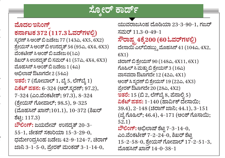 <p><strong>ರಾಜ್ಕೋಟ್:</strong> ಸ್ಪಿನ್ ಬೌಲರ್ಗಳ ಆಪ್ತಮಿತ್ರನಂತೆ ಇರುವ ಇಲ್ಲಿಯ ಪಿಚ್ನಲ್ಲಿ ಕರ್ನಾಟಕದ ಲೆಗ್ ಸ್ಪಿನ್ನರ್ ಶ್ರೇಯಸ್ ಗೋಪಾಲ್ ತಮ್ಮ ಕೈಚಳಕದ ರುಚಿಯನ್ನು ಸೌರಾಷ್ಟ್ರಕ್ಕೆ ತೋರಿಸಿದ್ದಾರೆ. ಇದಕ್ಕೂ ಮುನ್ನ ಬ್ಯಾಟಿಂಗ್ನಲ್ಲಿಯೂ ಮಿಂಚಿದ್ದ ಅವರು ಅರ್ಧಶತಕ ದಾಖಲಿಸಿದರು. </p><p>ನಿರಂಜನ್ ಶಾ ಕ್ರೀಡಾಂಗಣದಲ್ಲಿ ನಡೆಯುತ್ತಿರುವ ರಣಜಿ ಟ್ರೋಫಿ ಕ್ರಿಕೆಟ್ ಟೂರ್ನಿಯ ಎಲೀಟ್ ಬಿ ಗುಂಪಿನ ಪಂದ್ಯದ ಎರಡನೇ ದಿನವಾದ ಗುರುವಾರ ಸ್ಪಿನ್ನರ್ ಗಳದ್ದೇ ಆಟ. ಮೊದಲ ಇನಿಂಗ್ಸ್ನಲ್ಲಿ ಕರ್ನಾಟಕವನ್ನು 372 ರನ್ಗಳಿಗೆನಿಯಂತ್ರಿಸುವಲ್ಲಿ ಆತಿಥೇಯ ತಂಡದ ಸ್ಪಿನ್ನರ್ ಧರ್ಮೇಂದ್ರಸಿಂಹ ಜಡೇಜ (124ಕ್ಕೆ7) ಸಫಲರಾದರು. ಇದಕ್ಕೆ ಪ್ರತಿಕ್ರಿಯೆಯಾಗಿ ಬ್ಯಾಟಿಂಗ್ ಮಾಡಿದ ಸೌರಾಷ್ಟ್ರಕ್ಕೆ ಅಮೋಘ ಆರಂಭ ದೊರೆಯಿತು. ಹಾರ್ವಿಕ್ ದೇಸಾಯಿ (41; 104ಎ) ಮತ್ತು ಚಿರಾಗ್ ಜಾನಿ (90; 148ಎ) ಮೊದಲ ವಿಕೆಟ್ ಜೊತೆಯಾಟದಲ್ಲಿ 135 ರನ್ ಸೇರಿಸಿದರು. ಕರ್ನಾಟಕದ ಯುವ ಸ್ಪಿನ್ನರ್ ಮೊಹಸಿನ್ ಖಾನ್ ಬೀಸಿದ ಎಲ್ಬಿಡಬ್ಲ್ಯು ಬಲೆಗೆ ದೇಸಾಯಿ ಬಿದ್ದರು. </p><p>ಇನ್ನೊಂದೆಡೆ ಶತಕದತ್ತ ಸಾಗಿದ್ದ ಚಿರಾಗ್ (90; 148ಎ) ಅವರ ವಿಕೆಟ್ ಕಬಳಿಸುವಲ್ಲಿ ಶ್ರೇಯಸ್ ಯಶಸ್ವಿಯಾದರು. ಕೆಲವೇ ನಿಮಿಷಗಳ ನಂತರ ಜೈ ಗೋಹಿಲ್ (3 ರನ್) ಅವರ ಕ್ಯಾಚ್ ಅನ್ನು ತಮ್ಮದೇ ಬೌಲಿಂಗ್ನಲ್ಲಿ ಪಡೆದ ಶ್ರೇಯಸ್ ಮಿಂಚಿದರು. ಅಂಶ್ ಗೋಸಾಯಿ (19; 22ಎ) ಅವರಿಗೂ ಶ್ರೇಯಸ್ ಪೆವಿಲಿಯನ್ ಹಾದಿ ತೋರಿದರು. </p><p>ಅರ್ಪಿತ್ ವಸವದಾ (ಬ್ಯಾಟಿಂಗ್ 12) ಮತ್ತು ಪ್ರೇರಕ್ ಮಂಕಡ್ (ಬ್ಯಾಟಿಂಗ್ 20) ಅವರು ವಿಕೆಟ್ ಪತನಕ್ಕೆ ತಡೆಯೊಡ್ಡಿದರು. ಇದರಿಂದಾಗಿ ದಿನದಾಟದ ಮುಕ್ತಾಯಕ್ಕೆ ಸೌರಾಷ್ಟ್ರ ತಂಡವು 60 ಓವರ್ಗಳಲ್ಲಿ 4 ವಿಕೆಟ್ಗಳಿಗೆ 200 ರನ್ ಗಳಿಸಿತು. ಮೊದಲ ಇನಿಂಗ್ಸ್ ಮೊತ್ತ ಚುಕ್ತಾ ಮಾಡಲು ಆತಿಥೇಯ ಬಳಗಕ್ಕೆ 172 ರನ್ಗಳು ಬೇಕು. </p><p><strong>ಶ್ರೇಯಸ್ ಅರ್ಧಶತಕ: ಬೌಲಿಂಗ್ನಲ್ಲಿ ಮಿಂಚುವ ಮುನ್ನ ಶ್ರೇಯಸ್ (56;<br>95ಎ, 4X4, 6X3) ಬ್ಯಾಟಿಂಗ್ ನಲ್ಲಿಯೂ ಮಿಂಚಿದರು. ಅರ್ಧಶತಕ ಗಳಿಸಿ ತಂಡದ ಮೊತ್ತವು ಹೆಚ್ಚುವಂತೆ ನೋಡಿಕೊಂಡರು. ಅಲ್ಲದೇ ಅವರು ಆರ್. ಸ್ಮರಣ್ (77; 143ಎ) ಅವರೊಂದಿಗೆ ಆರನೇ ವಿಕೆಟ್ ಜತೆಯಾಟದಲ್ಲಿ 110 ರನ್ ಸೇರಿಸಿದರು. </strong></p><p>ಮೊದಲ ದಿನದಾಟದಲ್ಲಿ ಕರ್ನಾಟಕ ತಂಡವು 90 ಓವರ್ಗಳಲ್ಲಿ 5 ವಿಕೆಟ್ಗಳಿಗೆ 295 ರನ್ ಗಳಿಸಿತ್ತು. 66 ರನ್ ಗಳಿಸಿದ್ದ ಸ್ಮರಣ್ ಹಾಗೂ 38 ರನ್ ಹೊಡೆದಿದ್ದ ಶ್ರೇಯಸ್ ಕ್ರೀಸ್ನಲ್ಲಿದ್ದರು. ಎರಡನೇ ದಿನದಾಟದ ಬೆಳಿಗ್ಗೆ ತಾಳ್ಮೆ ಮತ್ತು ಏಕಾಗ್ರತೆಯಿಂದ ಆಡಿದ ಇಬ್ಬರೂ ಬ್ಯಾಟರ್ಗಳು ಬೌಲರ್ಗಳಿಗೆ ಸುಲಭದ ತುತ್ತಾಗಲಿಲ್ಲ. ದಿನದ ಎಂಟನೇ ಓವರ್ನಲ್ಲಿ ಸ್ಮರಣ್ ಅವರ ವಿಕೆಟ್ ಗಳಿಸುವಲ್ಲಿ ಜಡೇಜ ಯಶಸ್ವಿಯಾದರು. </p><p>ಶ್ರೇಯಸ್ ತಮ್ಮ ಅರ್ಧಶತಕ ಪೂರ್ಣ ಗೊಳಿಸಿಕೊಂಡರು. ತುಸು ವೇಗವಾಗಿ ರನ್ ಗಳಿಸಲು ಆರಂಭಿಸಿದ್ದ ಅವರಿಗೆ ಉನದ್ಕತ್ ಕಡಿವಾಣ ಹಾಕಿದರು. </p><p><strong>ಗಮನ ಸೆಳೆದ ಶಿಖರ್: ಪದಾರ್ಪಣೆ ಪಂದ್ಯ ಆಡುತ್ತಿರುವ ಶಿಖರ್ ಶೆಟ್ಟಿ ಗಮನ ಸೆಳೆಯುವ ಆಟವಾಡಿದರು. 3 ಸಿಕ್ಸರ್ ಮತ್ತು 4 ಬೌಂಡರಿಗಳಿದ್ದ 41 ರನ್ಗಳನ್ನು 57 ಎಸೆತಗಳಲ್ಲಿ ಗಳಿಸಿದರು.</strong></p><p><strong>ಸಂಕ್ಷಿಪ್ತ ಸ್ಕೋರು: ಮೊದಲ ಇನಿಂಗ್ಸ್: ಕರ್ನಾಟಕ: 117.3 ಓವರ್ಗಳಲ್ಲಿ 372(ಆರ್.ಸ್ಮರಣ್ 77, ಶ್ರೇಯಸ್ ಗೋಪಾಲ್ 56, ಎಂ.ವೆಂಕಟೇಶ್ 0, ಶಿಖರ್ ಶೆಟ್ಟಿ 41, ಮೊಹಸಿನ್ ಖಾನ್ 1, ಅಭಿಲಾಷ್ ಔಟಾಗದೇ 2, ಜಯದೇವ್ ಉನದ್ಕತ್ 55ಕ್ಕೆ1, ಧರ್ಮೇಂದ್ರಸಿಂಹ ಜಡೇಜ 124ಕ್ಕೆ7, ಗಜರ್ ಸಮರ್ 49ಕ್ಕೆ1) ಸೌರಾಷ್ಟ್ರ: