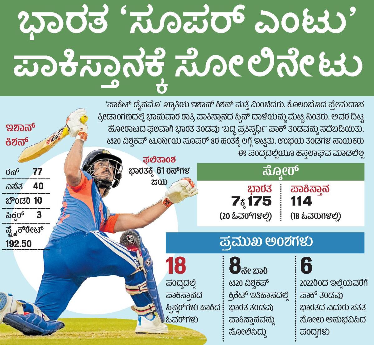 <p><strong>ಕೊಲೊಂಬೊ</strong>: ಸೂರ್ಯಕುಮಾರ್ ಯಾದವ್ ನಾಯಕತ್ವದ ಭಾರತ ತಂಡವು ತನ್ನ ‘ಬದ್ಧ ಎದುರಾಳಿ’ ಪಾಕಿಸ್ತಾನ ತಂಡದ ಎದುರು ನಿರೀಕ್ಷೆಗಿಂತಲೂ ಸುಲಭವಾಗಿ ಜಯಿಸಿತು. ಅದರೊಂದಿಗೆ ಐಸಿಸಿ ಟಿ20 ವಿಶ್ವಕಪ್ ಟೂರ್ನಿಯ ಸೂಪರ್ 8ರ ಹಂತಕ್ಕೆ ಲಗ್ಗೆಯಿಟ್ಟಿತು.</p><p>ಪ್ರೇಮದಾಸ ಕ್ರೀಡಾಂಗಣದಲ್ಲಿ ಟಾಸ್ ಗೆದ್ದ ಪಾಕಿಸ್ತಾನ ತಂಡದ ನಾಯಕ ಸಲ್ಮಾನ್ ಅಲಿ ಆಘಾ ಫೀಲ್ಡಿಂಗ್ ಆಯ್ಕೆ ಮಾಡಿಕೊಂಡರು. ಇಶಾನ್ ಕಿಶನ್ (77; 40ಎ, 4X10, 6X3) ಅವರ ದಿಟ್ಟ ಬ್ಯಾಟಿಂಗ್ನಿಂದಾಗಿ<br>ಭಾರತ ತಂಡವು 20 ಓವರ್ಗಳಲ್ಲಿ 7 ವಿಕೆಟ್ಗಳಿಗೆ 175 ರನ್ಗಳ ಸ್ಪರ್ಧಾತ್ಮಕ ಮೊತ್ತವನ್ನು ಪೇರಿಸಿತು. ಪಾಕಿಸ್ತಾನ ತಂಡದ ಆರು ಸ್ಪಿನ್ನರ್ಗಳು ಒಟ್ಟು 18 ಓವರ್ ಬೌಲಿಂಗ್ ಮಾಡಿದರು. </p><p>ಆದರೆ ಅದೇ ಪಿಚ್ನಲ್ಲಿ ಭಾರತದ ವೇಗದ ಬೌಲರ್ಗಳೂ ತಮ್ಮ ಸಾಮರ್ಥ್ಯ ಮೆರೆದರು. ಹಾರ್ದಿಕ್ ಪಾಂಡ್ಯ (16ಕ್ಕೆ2) ಮತ್ತು ಜಸ್ಪ್ರೀತ್ ಬೂಮ್ರಾ (17ಕ್ಕೆ2) ಪಾಕ್ ತಂಡಕ್ಕೆ ಪವರ್ ಪ್ಲೇ ಹಂತದಲ್ಲಿಯೇ ಬಲವಾದ ಪೆಟ್ಟುಕೊಟ್ಟರು. ಇನ್ನುಳಿದ ಕಾರ್ಯವನ್ನು ಸ್ಪಿನ್ನರ್ಗಳು ಅಚ್ಚುಕಟ್ಟಾಗಿ ನೆರವೇರಿಸಿದರು. ಅದರಿಂದಾಗಿ ಪಾಕ್ ತಂಡವು 18 ಓವರ್ಗಳಲ್ಲಿ 114 ರನ್ ಗಳಿಸಿ ಎಲ್ಲ ವಿಕೆಟ್ ಕಳೆದುಕೊಂಡಿತು. ಭಾರತ ತಂಡವು 61 ರನ್ಗಳಿಂದ ಜಯಭೇರಿ ಬಾರಿಸಿತು. ಸೂರ್ಯ ಮಾಡಿದ ಬೌಲರ್ಗಳ ನಿಯೋಜನೆಯ ತಂತ್ರಗಾರಿಕೆಯು ಫಲ ನೀಡಿತು.</p><p>ಪಾಕ್ ತಂಡದ ವಿಕೆಟ್ಕೀಪರ್–ಬ್ಯಾಟರ್ ಉಸ್ಮಾನ್ ಖಾನ್ (44; 34ಎ) ಹಾಗೂ ಕೊನೆಯಲ್ಲಿ ಶಹೀನ್ ಶಾ ಅಫ್ರಿದಿ (ಔಟಾಗದೇ 23) ಬಿಟ್ಟರೆ ಉಳಿದವರು ಆತ್ಮವಿಶ್ವಾಸದ<br>ಆಟವಾಡಲಿಲ್ಲ. ಇನಿಂಗ್ಸ್ನ ಮೊದಲ ಓವರ್ ಬೌಲಿಂಗ್ ಮಾಡಿದ ಹಾರ್ದಿಕ್ ಪಾಂಡ್ಯ ಅವರು ಸಾಹೀಬ್ಝಾದಾ ಫರ್ಹಾನ್ ವಿಕೆಟ್ ಗಳಿಸಿದರು. ಆ ಓವರ್ ಮೇಡನ್ ಕೂಡ ಮಾಡಿದರು. </p><p>ನಂತರದ ಓವರ್ನಲ್ಲಿ ಜಸ್ಪ್ರೀತ್ ಬೂಮ್ರಾ ಹಾಕಿದ ಮೊದಲ ಎಸೆತವನ್ನು ಸಯೀಮ್ ಅಯೂಬ್ ಸಿಕ್ಸರ್ ಎತ್ತಿದರು. ನಂತರದ ಎಸೆತದಲ್ಲಿ ಬೂಮ್ರಾ ಹಾಕಿದ ನಿಖರ ಎಸೆತಕ್ಕೆ ಎಲ್ಬಿಡಬ್ಲ್ಯು ಬಲೆಗೆ ಬಿದ್ದರು. ನಾಯಕ ಸಲ್ಮಾನ್ ಆಘಾ ಕೂಡ ಬೂಮ್ರಾ ಬೌಲಿಂಗ್ನಲ್ಲಿ ಹಾರ್ದಿಕ್ಗೆ ಕ್ಯಾಚ್ ಕೊಟ್ಟರು. ಅಕ್ಷರ್ ಪಟೇಲ್ ತಮ್ಮ ಸ್ಪೆಲ್ನ ಮೊದಲ ಎಸೆತದಲ್ಲಿಯೇ ಬಾಬರ್ ಆಜಂ ಸ್ಟಂಪ್ ಉರುಳಿಸಿದರು. ಟೂರ್ನಿಯಲ್ಲಿ ಇದೇ ಮೊದಲ ಅವಕಾಶ ಪಡೆದ ಕುಲದೀಪ್ ಯಾದವ್ ಕೂಡ ಕೈಚಳಕ ಮೆರೆದರು. ವರುಣ್ ಕೂಡ ಸಾಮರ್ಥ್ಯ ತೋರಿದರು.</p><p><strong>ಇಶಾನ್ ವೈಭವ: </strong>ಸ್ಪಿನ್ನರ್ಗಳಿಗೆ ನೆರವು ನೀಡುವಂತಿದ್ದ ಪಿಚ್ನಲ್ಲಿ ಮೊದಲ ಓವರ್ ಹಾಕಲು ತಾವೇ ಕಣಕ್ಕಿಳಿದ ಆಘಾ ಯಶಸ್ವಿಯೂ ಆದರು. ಹೊಟ್ಟೆನೋವಿನಿಂದ ಚೇತರಿಸಿಕೊಂಡು ಬಂದಿದ್ದ ಅಭಿಷೇಕ್ ಶರ್ಮಾ ಅವರ ವಿಕೆಟ್ ಕಬಳಿಸಿದರು. ಶರ್ಮಾ ತಾವೆದುರಿಸಿದ ನಾಲ್ಕನೇ ಎಸೆತದಲ್ಲಿ ಸೊನ್ನೆಯೊಂದಿಗೆ ಮರಳಿದರು. </p><p>ಆದರೆ ಇಶಾನ್ ಕಿಶನ್ ಮಾತ್ರ ಎದೆಗುಂದಲಿಲ್ಲ. ವೇಗಿ ಶಹೀನ್ ಆಫ್ರಿದಿ ಅವರಿಗೆ ಸಿಕ್ಸರ್ ಮೂಲಕ ಸ್ವಾಗತಿಸಿದರು. ಅವರ ಒಂದೇ ಓವರ್ನಲ್ಲಿ 15 ರನ್ ಸೂರೆ ಮಾಡಿದರು. </p><p>ಸ್ಪಿನ್ ಬೌಲರ್ಗಳನ್ನೂ ದಂಡಿಸಿದರು. ‘ಪಾಝ್ ಬೌಲರ್’ ಉಸ್ಮಾನ್ ತಾರೀಖ್ ಸೇರಿದಂತೆ ಎಲ್ಲರಿಗೂ ಬಿಸಿ ಮುಟ್ಟಿಸಿದರು. ಇನ್ನೊಂದು ಬದಿಯಲ್ಲಿ ತಿಲಕ್ ವರ್ಮಾ (25; 24ಎ) ಗಟ್ಟಿಯಾಗಿ ಬೇರೂರಲು ಸ್ವಲ್ಪ ಕಷ್ಟಪಟ್ಟರು. ಅವರು ಸಯೀಮ್ ಅಯೂಬ್ಗೆ ಎಲ್ಬಿಡಬ್ಲ್ಯು ಆದರು. </p><p>ಕ್ರೀಡಾಂಗಣದ 85 ಮೀಟರ್ ಬೌಂಡರಿ ಗೆರೆಯನ್ನು ದಾಟಿಸುವಲ್ಲಿ ಇಶಾನ್ ಯಶಸ್ವಿಯಾದರು. ಸೂರ್ಯ ಕೂಡ ಸಿಕ್ಸರ್ ಹೊಡೆಯುವ ಗೋಜಿಗೆ ಹೋಗದೇ ಬೌಂಡ