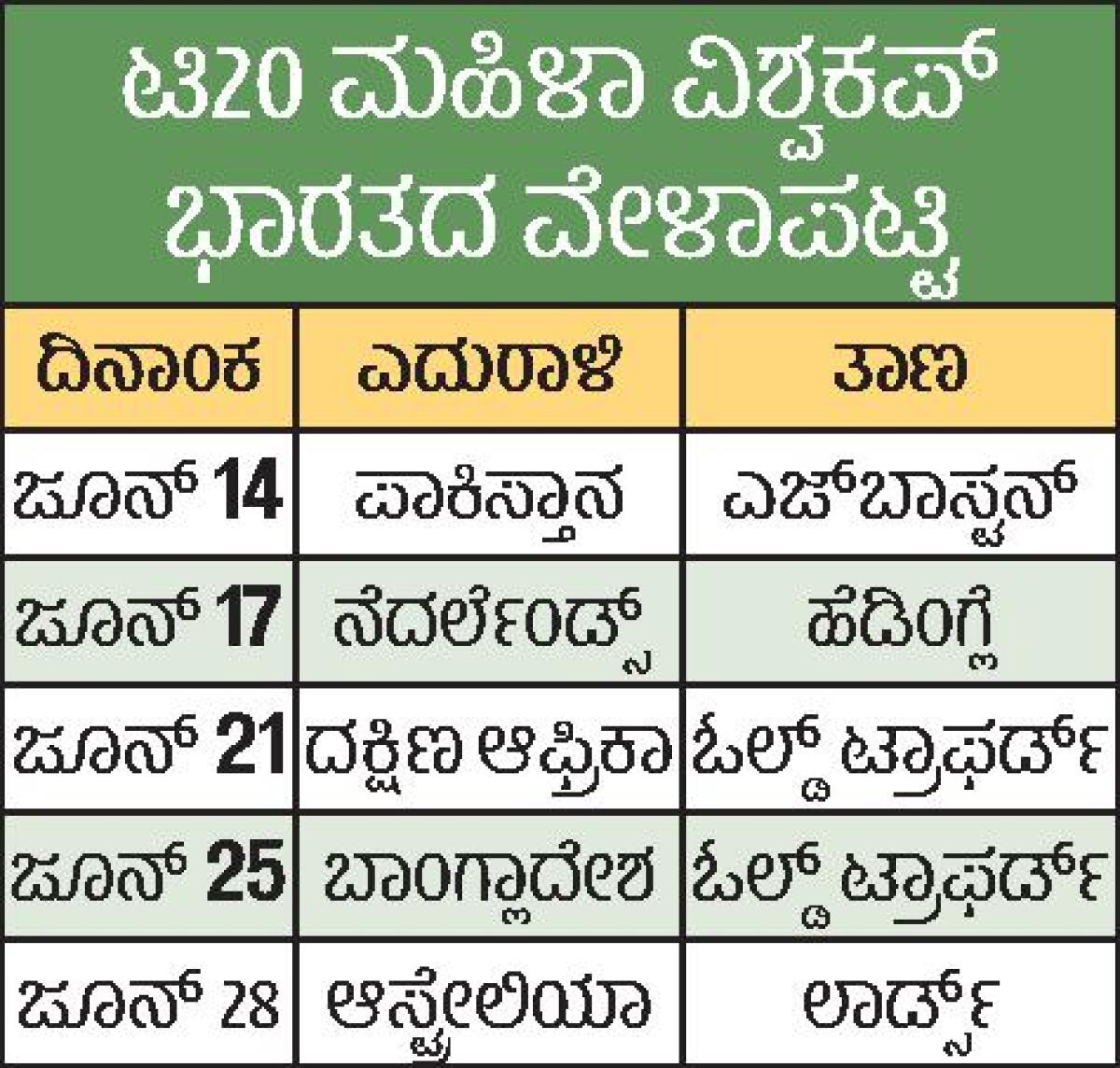 <p><strong>ನವದೆಹಲಿ</strong>: ಇಂಗ್ಲೆಂಡ್ ಮತ್ತು ವೇಲ್ಸ್ ಆತಿಥ್ಯದಲ್ಲಿ ಮುಂದಿನ ಜೂನ್ 12ರಿಂದ ಪ್ರಾರಂಭವಾಗುವ ಐಸಿಸಿ ಮಹಿಳಾ ಟಿ20 ವಿಶ್ವಕಪ್ನ 10ನೇ ಆವೃತ್ತಿಯಲ್ಲಿ ಒಟ್ಟು 12 ತಂಡಗಳು ಪ್ರಶಸ್ತಿಗಾಗಿ ಪೈಪೋಟಿ ನಡೆಸಲಿವೆ. ಭಾರತ ತಂಡವು ಪಾಕಿಸ್ತಾನ ವಿರುದ್ಧ ಅಭಿಯಾನ ಆರಂಭಿಸಲಿದೆ.</p>.<p>ಟೂರ್ನಿಯ ಸಂಪೂರ್ಣ ವೇಳಾಪಟ್ಟಿಯನ್ನು ಮಂಗಳವಾರ ಅಂತರರಾಷ್ಟ್ರೀಯ ಕ್ರಿಕೆಟ್ ಮಂಡಳಿ (ಐಸಿಸಿ) ಪ್ರಕಟಿಸಿದೆ. ಜೂನ್ 12ರಂದು ನಡೆಯುವ ಉದ್ಘಾಟನಾ ಪಂದ್ಯದಲ್ಲಿ ಆತಿಥೇಯ ಇಂಗ್ಲೆಂಡ್ ತಂಡವು ಶ್ರೀಲಂಕಾ ವಿರುದ್ಧ ಸೆಣಸಲಿದೆ. ಜುಲೈ 5ರಂದು ಲಾರ್ಡ್ಸ್ನಲ್ಲಿ ಫೈನಲ್ ಪಂದ್ಯ ನಡೆಯಲಿದೆ ಎಂದು ಐಸಿಸಿ ಸಿಇಒ ಸಂಜೋಗ್ ಗುಪ್ತಾ ಪ್ರಕಟಣೆಯಲ್ಲಿ ತಿಳಿಸಿದ್ದಾರೆ.</p>.<p>ಟೂರ್ನಿಯಲ್ಲಿ ಇದೇ ಮೊದಲ ಬಾರಿ 12 ತಂಡಗಳು ಸ್ಪರ್ಧಿಸಲಿದೆ. ಈ ಹಿಂದಿನ ಆವೃತ್ತಿಯಲ್ಲಿ (2024) 10 ತಂಡಗಳು ಸ್ಪರ್ಧಿಸಿದ್ದು, ನ್ಯೂಜಿಲೆಂಡ್ ತಂಡ ಚಾಂಪಿಯನ್ ಆಗಿತ್ತು. ಈ ಬಾರಿ ಜೂನ್ 28ರವರೆಗೆ ಗುಂಪು ಹಂತದ ಪಂದ್ಯಗಳು, 30ರಂದು ಮತ್ತು ಜುಲೈ 2ರಂದು ಸೆಮಿಫೈನಲ್ ಪಂದ್ಯಗಳು ನಿಗದಿಯಾಗಿವೆ. </p>.<p>ನೇಪಾಳದಲ್ಲಿ ಕಳೆದ ತಿಂಗಳು ನಡೆದ ಅರ್ಹತಾ ಸುತ್ತಿನಲ್ಲಿ ಬಾಂಗ್ಲಾದೇಶ, ಐರ್ಲೆಂಡ್, ಸ್ಕಾಟ್ಲೆಂಡ್ ಮತ್ತು ನೆದರ್ಲೆಂಡ್ಸ್ ವಿಶ್ವಕಪ್ ಟೂರ್ನಿಗೆ ಟಿಕೆಟ್ ಕಾಯ್ದಿರಿಸಿದ ಅಂತಿಮ ನಾಲ್ಕು ತಂಡಗಳಾಗಿವೆ.</p>.<p>ಜೂನ್ 14ರಂದು ಭಾರತ ಮತ್ತು ಪಾಕ್ ತಂಡಗಳು ಎಜ್ಬಾಸ್ಟನ್ನಲ್ಲಿ ಮುಖಾಮುಖಿಯಾಗಲಿವೆ. ಭಾರತವು ಗುಂಪು ಹಂತದಲ್ಲಿ ಒಟ್ಟು ನಾಲ್ಕು ಪಂದ್ಯಗಳನ್ನು ಆಡಲಿದೆ. </p>.<p>ಎ ಗುಂಪಿನಲ್ಲಿ ಭಾರತ, ಆಸ್ಟ್ರೇಲಿಯಾ, ಪಾಕಿಸ್ತಾನ, ದಕ್ಷಿಣ ಆಫ್ರಿಕಾ, ಬಾಂಗ್ಲಾದೇಶ ಮತ್ತು ನೆದರ್ಲೆಂಡ್ಸ್ ತಂಡಗಳು ಸ್ಥಾನ ಪಡೆದಿವೆ. ಬಿ ಗುಂಪಿನಲ್ಲಿ ಇಂಗ್ಲೆಂಡ್, ನ್ಯೂಜಿಲೆಂಡ್, ಶ್ರೀಲಂಕಾ, ವೆಸ್ಟ್ ಇಂಡೀಸ್, ಐರ್ಲೆಂಡ್ ಮತ್ತು ಸ್ಕಾಟ್ಲೆಂಡ್ ತಂಡಗಳಿವೆ. </p>.<p>ಡಚ್ ತಂಡವು ಐಸಿಸಿ ಮಹಿಳಾ ಟಿ20 ವಿಶ್ವಕಪ್ನಲ್ಲಿ ತಮ್ಮ ಚೊಚ್ಚಲ ಅವಕಾಶ ಪಡೆದಿದೆ. ಆ ತಂಡವು ಬಾಂಗ್ಲಾದೇಶದ ವಿರುದ್ಧ ತನ್ನ ಅಭಿಯಾನವನ್ನು ಆರಂಭಿಸಲಿದೆ.</p>.<div><p><strong>ಪ್ರಜಾವಾಣಿ ಆ್ಯಪ್ ಇಲ್ಲಿದೆ: <a href="https://play.google.com/store/apps/details?id=com.tpml.pv">ಆಂಡ್ರಾಯ್ಡ್ </a>| <a href="https://apps.apple.com/in/app/prajavani-kannada-news-app/id1535764933">ಐಒಎಸ್</a> | <a href="https://whatsapp.com/channel/0029Va94OfB1dAw2Z4q5mK40">ವಾಟ್ಸ್ಆ್ಯಪ್</a>, <a href="https://www.twitter.com/prajavani">ಎಕ್ಸ್</a>, <a href="https://www.fb.com/prajavani.net">ಫೇಸ್ಬುಕ್</a> ಮತ್ತು <a href="https://www.instagram.com/prajavani">ಇನ್ಸ್ಟಾಗ್ರಾಂ</a>ನಲ್ಲಿ ಪ್ರಜಾವಾಣಿ ಫಾಲೋ ಮಾಡಿ.</strong></p></div>