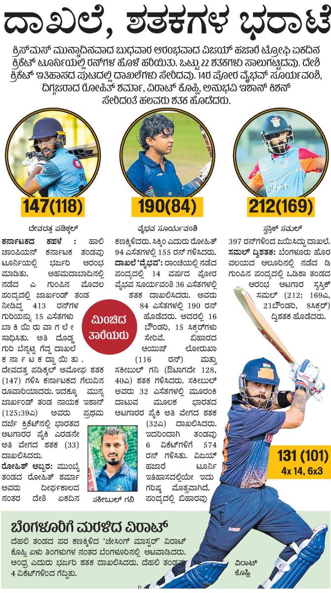 <p><strong>ಅಹಮದಾಬಾದ್</strong>: ದೇವದತ್ತ ಪಡಿಕ್ಕಲ್ ಅವರ 147 ರನ್ಗಳ ಅಮೋಘ ಶತಕದ ಆಟದ ಎದುರು ಜಾರ್ಖಂಡ್ ತಂಡದ ಇಶಾನ್ ಕಿಶನ್ ಅವರ ಮಿಂಚಿನ ಶತಕದ ಆಟ (39 ಎಸೆತಗಳಲ್ಲಿ 125) ಮಸುಕಾಯಿತು. ಸೇರಿಗೆ ಸವ್ವಾಸೇರು ಎನ್ನುವಂತೆ ಜಾರ್ಖಂಡ್ ತಂಡದ ಭಾರಿ ಮೊತ್ತವನ್ನು ಬೆನ್ನಟ್ಟುವಲ್ಲಿ ಯಶಸ್ವಿಯಾದ ಹಾಲಿ ಚಾಂಪಿಯನ್ ಕರ್ನಾಟಕ ತಂಡ, ವಿಜಯ್ ಹಜಾರೆ ಟ್ರೋಫಿ ಏಕದಿನ ಟೂರ್ನಿಯಲ್ಲಿ ಬುಧವಾರ 5 ವಿಕೆಟ್ಗಳಿಂದ ಗೆದ್ದು ಭರ್ಜರಿ ಆರಂಭ ಮಾಡಿತು.</p><p>ಇದು ವಿಜಯ್ ಹಜಾರೆ ಟ್ರೋಫಿಯಲ್ಲಿ ‘ದಾಖಲೆ ಚೇಸ್’ ಎನಿಸಿತು. ಸರ್ದಾರ್ ಪಟೇಲ್ ‘ಬಿ’ ಕ್ರೀಡಾಂಗಣದಲ್ಲಿ ರನ್ಹೊಳೆ ಕಂಡ ಎಲೀಟ್ ‘ಎ’ ಗುಂಪಿನ ಈ ಪಂದ್ಯದಲ್ಲಿ ಬ್ಯಾಟ್ ಮಾಡಲು<br>ಕಳುಹಿಸಲ್ಪಟ್ಟ ಜಾರ್ಖಂಡ್ 9 ವಿಕೆಟ್ಗೆ 412 ರನ್ಗಳ ಭಾರಿ ಮೊತ್ತ ಕಲೆಹಾಕಿತು. ಆದರೆ ಕರ್ನಾಟಕ ಇನ್ನೂ 15 ಎಸೆತಗಳು ಬಾಕಿಯಿರುವಂತೆ 5 ವಿಕೆಟ್ಗೆ 413 ರನ್ ಹೊಡೆದು ಗೆಲುವು ಆಚರಿಸಿತು. ಆರಂಭ ಆಟಗಾರ ಪಡಿಕ್ಕಲ್ ಅವರಿಗೆ ಇತರ ಬ್ಯಾಟರ್ಗಳು ಬೆಂಬಲ ನೀಡಿದರು.</p><p>ನಾಲ್ಕು ದಿನಗಳ ಹಿಂದಷ್ಟೇ ಟಿ20 ವಿಶ್ವಕಪ್ ಆಡುವ ಭಾರತ ತಂಡಕ್ಕೆ ಆಯ್ಕೆಯಾದ ಸಂಭ್ರಮದಲ್ಲಿರುವ ವಿಕೆಟ್ಕೀಪರ್ ಇಶಾನ್ ಕಿಶನ್ ಏಳು ಬೌಂಡರಿ, 14 ಸಿಕ್ಸರ್ಗಳನ್ನು ಸಿಡಿಸಿದರು.</p><p>ಆರಂಭ ಆಟಗಾರ ಶಿಖರ್ ಮೋಹನ್ (44), ವಿರಾಟ್ ಸಿಂಗ್ (88, 68ಎ, 4x8, 6x4) ಮತ್ತು ಕುಮಾರ್ ಕುಶಾಗ್ರ (63, 47ಎ, 4x3, 6x5) ಅವರು ಜಾರ್ಖಂಡ್ ತಂಡಕ್ಕೆ ಉತ್ತಮ ಆರಂಭ ಒದಗಿಸಿದರು. ಹೀಗಾಗಿ ಆ ತಂಡ 38 ಓವರುಗಳಲ್ಲಿ 4 ವಿಕೆಟ್ಗೆ 239 ರನ್ ಗಳಿಸಿ ಉತ್ತಮ ಸ್ಥಿತಿಗೆ ತಲುಪಿತು. ವಿರಾಟ್ ಸಿಂಗ್ ಮತ್ತು ಕುಶಾಗ್ರ ನಾಲ್ಕನೇ ವಿಕೆಟ್ಗೆ 129 ರನ್ ಸೇರಿಸಿದರು. ಇದರಿಂದ ಇಶಾನ್ ಕಿಶನ್ ಅವರಿಗೆ ಪರಾಕ್ರಮ ಮೆರೆಯಲು ಸಾಧ್ಯವಾಯಿತು. ಅವರು ಕಟ್, ಪುಲ್, ಡ್ರೈವ್ಗಳ ಮೂಲಕ ಚೆಂಡನ್ನು ಕ್ರೀಡಾಂಗಣದ ಮೂಲೆಮೂಲೆಗೆ ಅಟ್ಟಿದರು. ಇದರಿಂದ ತಂಡ ಸುಲಭವಾಗಿ 400ರ ಗಡಿ ದಾಟಿತು. ಕರ್ನಾಟಕದ ಪರ ವೇಗಿ ಅಭಿಲಾಷ್ ಶೆಟ್ಟಿ 72 ರನ್ನಿಗೆ 4 ವಿಕೆಟ್ ಪಡೆದರು.</p><p>ಈ ದೊಡ್ಡ ಮೊತ್ತದೆದುರು ಕರ್ನಾಟಕ ಧೃತಿಗೆಡಲಿಲ್ಲ. ನಾಯಕ ಮಯಂಕ್ ಅಗರವಾಲ್ (54, 34ಎ, 4x10) ಮತ್ತು ದೇವದತ್ತ ಪಡಿಕ್ಕಲ್ ಅವರು ಕೇವಲ 11.5 ಓವರುಗಳಲ್ಲಿ 114 ರನ್ ಸೇರಿಸಿ, ಕರ್ನಾಟಕ ತಂಡಕ್ಕೆ ಅಗತ್ಯವಾಗಿದ್ದ ಅಮೋಘ ಆರಂಭ ಒದಗಿಸಿದರು.</p><p>ನಂತರ ಮಧ್ಯಮ ಕ್ರಮಾಂಕದ ಆಟಗಾರರಾದ ಕರುಣ್ ನಾಯರ್ (29), ಆರ್.ಸ್ಮರಣ್ (25), ಕೃಷ್ಣನ್ ಶ್ರೀಜಿತ್ (38) ಅವರೂ ಉಪಯುಕ್ತ ಕೊಡುಗೆ ನೀಡಿದರು. 118 ಎಸೆತಗಳ ಇನಿಂಗ್ಸ್ನಲ್ಲಿ ಹತ್ತು ಬೌಂಡರಿ, ಏಳು ಸಿಕ್ಸರ್ಗಳನ್ನು ಬಾರಿಸಿದ ದೇವದತ್ತ 41ನೇ ಓವರಿನಲ್ಲಿ ನಿರ್ಗಮಿಸಿದರು. ಆಗ ತಂಡದ<br>ಮೊತ್ತ 5 ವಿಕೆಟ್ಗೆ 325.</p><p>ಈ ಹಂತದಲ್ಲಿ ಅಭಿನವ್ ಮನೋಹರ್ (ಔಟಾಗದೇ 56, 32ಎ) ಮತ್ತು ಧ್ರುವ್ ಪ್ರಭಾಕರ್ (ಔಟಾಗದೇ 40, 22 ಎಸೆತ) ಅವರು ಮುರಿಯದ ಆರನೇ ವಿಕೆಟ್ಗೆ ಕೇವಲ 41 ಎಸೆತಗಳಲ್ಲಿ 88 ರನ್ಗಳ ಬಿರುಸಿನ ಜೊತೆಯಾಟ ಆಡಿದರು. ತಂಡ ಇನ್ನೂ 2.3 ಓವರುಗಳು ಇರುವಾಗಲೇ ಗುರಿತಲುಪಿತು.</p>.<p><strong>14 ವರ್ಷ ಹಳೆಯ ದಾಖಲೆ ಪತನ</strong></p><p>ಕರ್ನಾಟಕ 413 ರನ್ಗಳ ಗುರಿಯನ್ನು ಯಶಸ್ವಿಯಾಗಿ ದಾಟಿದ್ದು ವಿಜಯ್ ಹಜಾರೆ ಟ್ರೋಫಿಯಲ್ಲಿ ದಾಖಲೆ ಎನಿಸಿತು. ಈ ಹಿಂದೆ 2011–12ರಲ್ಲಿ ಬೆಂಗಳೂರಿನ ಆರ್ಎಸ್ಐ ಮೈದಾನದಲ್ಲಿ ಗೋವಾ ವಿರುದ್ಧ ಆಂಧ್ರ ತಂಡವು 384 ರನ್ ಬೆನ್ನಟ್ಟಿ ಜಯಗಳಿಸಿದ್ದು ಈವರೆಗಿನ ದಾಖಲೆಯಾಗಿತ್ತು.</p>.<div><p><strong>ಪ್ರಜಾವಾಣಿ ಆ್ಯಪ್ ಇಲ್ಲಿದೆ: <a href="https://play.google.com/store/apps/details?id=com.tpml.pv">ಆಂಡ್ರಾಯ್ಡ್ </a>| <a href="https://apps.apple.com/in/app/prajavani-kannada-news-app/id15357649