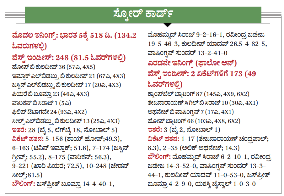 <p><strong>ನವದೆಹಲಿ</strong>: ಸತತ ಎರಡನೇ ದಿನವೂ ನಾಯಕ ಶುಭಮನ್ ಗಿಲ್ ಮತ್ತು ತಂಡದ ಮ್ಯಾನೇಜ್ಮೆಂಟ್ ದಿಟ್ಟ ನಿರ್ಧಾರ ಕೈಗೊಂಡಿತು. ಈ ಹಿಂದೆ ಹಲವು ನಾಯಕರು ಇಂತಹ ತೀರ್ಮಾನ ಕೈಗೊಳ್ಳಲು ಹಿಂಜರಿದಿದ್ದರು. ಬಿಸಿಲ ಬೇಗೆ ಹೆಚ್ಚಾಗಿದ್ದ ಎರಡು ದಿನಗಳಲ್ಲಿ ಬೌಲರ್ಗಳು 81.5 ಓವರ್ಗಳನ್ನು ಬೌಲಿಂಗ್ ಮಾಡಿದ್ದರೂ ಭಾರತವು ವೆಸ್ಟ್ ಇಂಡೀಸ್ ಮೇಲೆ ಫಾಲೋ ಆನ್ ಹೇರಿತು. ಆದಷ್ಟು ಬೇಗನೆ ವಿಂಡೀಸ್ ತಂಡದ ಹೆಡೆಮುರಿ ಕಟ್ಟಿಬಿಡುವ ಉತ್ಸಾಹಆತಿಥೇಯರಲ್ಲಿತ್ತು.</p><p>ಶನಿವಾರ ಭಾರತ ತಂಡವು 5 ವಿಕೆಟ್ಗಳಿಗೆ 518 ರನ್ ಗಳಿಸಿ ಡಿಕ್ಲೇರ್ ಮಾಡಿಕೊಂಡಿತ್ತು. ಕುಲದೀಪ್ ಯಾದವ್ (82ಕ್ಕೆ5) ಅವರ ಕೈಚಳಕದ ಮುಂದೆ ಪ್ರವಾಸಿ ಬಳಗವು 248 ರನ್ ಗಳಿಸಿತು. 270 ರನ್ಗಳ ಹಿನ್ನಡೆ ಅನುಭವಿಸಿತು. ಉಭಯ ತಂಡಗಳು ಮುಖಾಮುಖಿಯಾದ ಕಳೆದ ಐದು ಟೆಸ್ಟ್ ಪಂದ್ಯಗಳೂ ಮೂರು ದಿನಗಳ ಒಳಗೇ ಮುಗಿದುಹೋಗಿದ್ದವು. ಆದ್ದರಿಂದ ಇಲ್ಲಿಯೂ ಅಂತಹದೇ ನಿರೀಕ್ಷೆ ಮೂಡಿತ್ತು. </p><p>ಆದರೆ ಪ್ರವಾಸಿ ಬ್ಯಾಟರ್ಗಳು ಈ ಹಂತದಿಂದ ಹೋರಾಟ ಆರಂಭಿಸಿದ್ದು ವಿಶೇಷ. ಅರುಣ್ ಜೇಟ್ಲಿ ಕ್ರೀಡಾಂಗಣದ ಸಪಾಟಾಗಿರುವ ಪಿಚ್ನಲ್ಲಿ ಚೆಂಡು ನಿಧಾನಗತಿಯಲ್ಲಿ ಚಲಿಸುತ್ತಿತ್ತು. ವಿಪರೀತ ಧಗೆಯೂ ಇತ್ತು. ಆದರೆ ಜಾನ್ ಕ್ಯಾಂಪ್ಬೆಲ್ (ಬ್ಯಾಟಿಂಗ್ 87; 145ಎ) ಮತ್ತು ಶಾಯ್ ಹೋಪ್ (ಅಜೇಯ 66; 103ಎ) ಅವರು ಮುರಿಯದ ಮೂರನೇ ವಿಕೆಟ್ ಜತೆಯಾಟದಲ್ಲಿ 138 ರನ್ ಸೇರಿಸಿದರು. ಅದರಿಂದಾಗಿ ದಿನದಾಟದ ಮುಕ್ತಾಯಕ್ಕೆ ವಿಂಡೀಸ್ ಬಳಗವು 2 ವಿಕೆಟ್ಗಳಿಗೆ 173 ರನ್ ಗಳಿಸಿತು. ಸರಣಿಯ ಕೊನೆ ಮತ್ತು ಎರಡನೇ ಟೆಸ್ಟ್ ಪಂದ್ಯವು ನಾಲ್ಕನೇ ದಿನಕ್ಕೆ ಸಾಗಿತು.</p><p>ಊಟದ ವಿರಾಮದ 50 ನಿಮಿಷಗಳ ನಂತರ ವೆಸ್ಟ್ ಇಂಡೀಸ್ ತಂಡದ ಎರಡನೇ ಇನಿಂಗ್ಸ್ ಆರಂಭವಾಯಿತು. ಒಂಬತ್ತನೇ ಓವರ್ನಲ್ಲಿ ಮೊಹಮ್ಮದ್ ಸಿರಾಜ್ ಎಸೆತವನ್ನು ಹುಕ್ ಮಾಡಿದ ತೇಜನಾರಾಯಣ್ ಚಂದ್ರಪಾಲ್ ಅವರಿಗೆ ಅದೃಷ್ಟ ಕೈಕೊಟ್ಟಿತು. ಮಿಡ್ವಿಕೆಟ್<br>ನಲ್ಲಿದ್ದ ಗಿಲ್ ಆಕರ್ಷಕ ರೀತಿಯಲ್ಲಿ ಕ್ಯಾಚ್ ಪಡೆದರು. ಕೆಲವು ನಿಮಿಷಗಳ ನಂತರ ವಾಷಿಂಗ್ಟನ್ ಸುಂದರ್ ಎಸೆತವನ್ನು ಅಂದಾಜಿಸುವಲ್ಲಿ ಎಡವಿದ ಅಲಿಕ್ ಅಥನೇಜ್ ಅವರ ವಿಕೆಟ್ ಉರುಳಿತು. ಇದರಿಂದಾಗಿ ಚಹಾ ವಿರಾಮದ ವೇಳೆಗೆ ವಿಂಡೀಸ್ 35 ರನ್ಗಳಿಗೆ 2 ವಿಕೆಟ್ ಕಳೆದುಕೊಂಡಿತ್ತು. </p><p>ಅಷ್ಟೊತ್ತಿಗೆ ಕ್ಯಾಂಪ್ಬೆಲ್ ಅವರಿಗೆ ರಕ್ಷಣಾತ್ಮಕ ಆಟದಿಂದ ಹೆಚ್ಚು ಪ್ರಯೋಜನೆ ಇಲ್ಲ ಎಂಬ ಅರಿವು ಮೂಡಿತ್ತು. ಚಹಾ ನಂತರ ಬೀಸಾಟವಾಡುವ ನಿರ್ಧಾರದೊಂದಿಗೆ ಕಣಕ್ಕೆ ಮರಳಿದರು. ಟಿ20 ಮಾದರಿಯ ಬ್ಯಾಟಿಂಗ್ ಆರಂಭಿಸಿದ ಅವರು ಭಾರತದ ಸ್ಪಿನ್ನರ್ಗಳಾದ ರವೀಂದ್ರ ಜಡೇಜ, ವಾಷಿಂಗ್ಟನ್ ಮತ್ತು ಕುಲದೀಪ್ ಅವರ ಎಸೆತಗಳನ್ನು ದಂಡಿಸಿದರು. ಫ್ರಂಟ್ಫುಟ್, ಸ್ವೀಪ್ ಹೊಡೆತಗಳನ್ನು ಭರಪೂರ ಪ್ರಯೋಗಿಸಿದರು. ಬ್ಯಾಕ್ಫುಟ್ ಕಟ್ ಮತ್ತು ಸ್ಲ್ಯಾಪ್ಗಳಿಗೂ ಕೊರತೆಯಿರಲಿಲ್ಲ. </p><p>ಕ್ಯಾಂಪ್ಬೆಲ್ ಅವರನ್ನು ನೋಡಿ ಪ್ರೇರಣೆಗೊಂಡಂತೆ ಕಂಡ ಹೋಪ್ ಕೂಡ ಬ್ಯಾಟ್ ಬೀಸಿದರು. ಯಾವುದೇ ಅವಕಾಶವನ್ನೂ ಅವರು ಬಿಡಲಿಲ್ಲ. ಈ ಹಂತದಲ್ಲಿ ವಿಂಡೀಸ್ ತಂಡವು ಪ್ರತಿ ಓವರ್ಗೆ ಸರಾಸರಿ ಆರು ರನ್ ಗಳಿಸಿತು. ಪಿಚ್ನಲ್ಲಿ ಸ್ಪಿನ್ನರ್ಗಳಿಗೆಯಾವುದೇ ನೆರವು ಸಿಗಲಿಲ್ಲ. ಇದರಿಂದಾಗಿ ನಾಯಕ ಗಿಲ್ ಅವರು ಅನಿವಾರ್ಯವಾಗಿ ಫೀಲ್ಡರ್ಗಳನ್ನು ವೃತ್ತದಿಂದ ಹೊರಗೆ ನಿಯೋಜಿಸಿದರು. ಆಗ ಬ್ಯಾಟರ್ಗಳು ದೊಡ್ಡ ಹೊಡೆತಗಳ ನ್ನಾಡುವುದನ್ನು ಬಿಟ್ಟು ಒಂದು ಮತ್ತು ಎರಡು ರನ್ ಪಡೆಯತೊಡಗಿದರು. ಈ ಪ್ರಯತ್ನಗಳಲ್ಲಿ ಕೆ