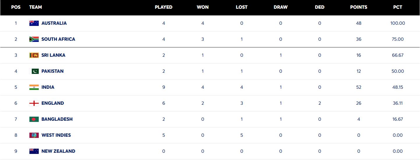 <p><strong>ನವದೆಹಲಿ</strong>: ದಕ್ಷಿಣ ಆಫ್ರಿಕಾ ವಿರುದ್ಧ ತವರಿನಲ್ಲಿ ನಡೆದ 2 ಪಂದ್ಯಗಳ ಸರಣಿಯಲ್ಲಿ ವೈಟ್ವಾಷ್ ಮುಖಭಂಗ ಅನುಭವಿಸಿರುವ ಭಾರತ ತಂಡ, ವಿಶ್ವ ಟೆಸ್ಟ್ ಚಾಂಪಿಯನ್ಷಿಪ್ (ಡಬ್ಲ್ಯುಟಿಸಿ) ಪಾಯಿಂಟ್ ಪಟ್ಟಿಯಲ್ಲಿ 5ನೇ ಸ್ಥಾನಕ್ಕೆ ಕುಸಿದಿದೆ.</p><p>ಕೋಲ್ಕತ್ತದಲ್ಲಿ ನಡೆದ ಮೊದಲ ಟೆಸ್ಟ್ ಅನ್ನು 30 ರನ್ ಅಂತರದಿಂದ ಸೋತಿದ್ದ ಭಾರತ, 2ನೇ ಪಂದ್ಯವನ್ನು 408 ರನ್ಗಳಿಂದ ಕಳೆದುಕೊಂಡಿದೆ. ಇದು, ದೀರ್ಘ ಮಾದರಿಯ ಕ್ರಿಕೆಟ್ನಲ್ಲಿ, ಭಾರತ ತಂಡಕ್ಕೆ ರನ್ ಅಂತರದಲ್ಲಿ ಎದುರಾದ ಅತಿದೊಡ್ಡ ಸೋಲಾಗಿದೆ.</p><p>ಇದೇ ವರ್ಷಾರಂಭದಲ್ಲಿ ಇಂಗ್ಲೆಂಡ್ನಲ್ಲಿ ನಡೆದಿದ್ದ ಐದು ಪಂದ್ಯಗಳ ಸರಣಿಯಲ್ಲಿ 2–2 ಅಂತರದ ಡ್ರಾ ಸಾಧಿಸಿದ್ದ ಭಾರತ, ಸದ್ಯ ಪಾಯಿಂಟ್ ಪಟ್ಟಿಯಲ್ಲಿ ಪಾಕಿಸ್ತಾನಕ್ಕಿಂತಲೂ ಕೆಳಗಿನ ಸ್ಥಾನಕ್ಕೆ ಜಾರಿದೆ.</p><p>ಪ್ರಸ್ತುತ ಡಬ್ಲ್ಯುಟಿಸಿ ಆವೃತ್ತಿಯಲ್ಲಿ (2025-2027) ಇದುವರೆಗೆ ಒಟ್ಟು 9 ಪಂದ್ಯಗಳನ್ನು ಆಡಿರುವ ಭಾರತ, ತಲಾ ನಾಲ್ಕರಲ್ಲಿ ಜಯ ಹಾಗೂ ಸೋಲು ಕಂಡಿದೆ. ಒಂದು ಪಂದ್ಯ ಡ್ರಾನಲ್ಲಿ ಅಂತ್ಯವಾಗಿದ್ದು, ಶುಭಮನ್ ಗಿಲ್ ಪಡೆಯ ಜಯದ ಸರಾಸರಿ, ಶೇ 48.15ಕ್ಕೆ ಕುಸಿದಿದೆ.</p><p>ಆಡಿರುವ ನಾಲ್ಕೂ ಪಂದ್ಯಗಳಲ್ಲಿ ಗೆದ್ದಿರುವ ಆಸ್ಟ್ರೇಲಿಯಾ, ಶೇ 100ರಷ್ಟು ಜಯದ ಸರಾಸರಿಯೊಂದಿಗೆ ಮೊದಲ ಸ್ಥಾನದಲ್ಲಿದೆ. ಆಡಿರುವ ನಾಲ್ಕರ ಪೈಕಿ ಮೂರರಲ್ಲಿ ಗೆದ್ದು, ಒಂದನ್ನು ಸೋತಿರುವ ದಕ್ಷಿಣ ಆಫ್ರಿಕಾ ಶೇ 75ರ ಸರಾಸರಿಯೊಂದಿಗೆ ಎರಡನೇ ಸ್ಥಾನದಲ್ಲಿದೆ.</p><p>ನಂತರದ ಸ್ಥಾನಗಳಲ್ಲಿ ಶ್ರೀಲಂಕಾ (ಶೇ 66.67) ಮತ್ತು ಪಾಕಿಸ್ತಾನ (ಶೇ 50) ಇವೆ. ಶ್ರೀಲಂಕಾ ತಂಡ ಎರಡು ಪಂದ್ಯಗಳನ್ನು ಆಡಿದ್ದು, ಒಂದರಲ್ಲಿ ಜಯ ಸಾಧಿಸಿ, ಮತ್ತೊಂದನ್ನು ಡ್ರಾ ಮಾಡಿಕೊಂಡಿದೆ. ಪಾಕ್ ಪಡೆ, ಆಡಿರುವ ಎರಡು ಪಂದ್ಯಗಳ ಪೈಕಿ ತಲಾ ಒಂದೊಂದು ಜಯ ಹಾಗೂ ಸೋಲು ಅನುಭವಿಸಿದೆ.</p><p>ಮೊದಲ ಆವೃತ್ತಿಯಲ್ಲಿ (2019-2021) ಚಾಂಪಿಯನ್ ಪಟ್ಟಕ್ಕೇರಿದ್ದ ನ್ಯೂಜಿಲೆಂಡ್, ಸದ್ಯದ ಆವೃತ್ತಿಯಲ್ಲಿ ಇನ್ನೂ ಒಂದೂ ಸರಣಿಯಲ್ಲಿ ಆಡಿಲ್ಲ.</p><p>ಪಾಯಿಂಟ್ ಪಟ್ಟಿಯಲ್ಲಿ ಮೊದಲೆರಡು ಸ್ಥಾನ ಪಡೆಯುವ ತಂಡಗಳು, 2027ರಲ್ಲಿ ನಡೆಯುವ ಫೈನಲ್ಗೆ ಅರ್ಹತೆ ಗಿಟ್ಟಿಸಲಿವೆ.</p>.IND vs SA| ಭಾರತಕ್ಕೆ ಹೀನಾಯ ಸೋಲು: 2–0 ಅಂತರದಲ್ಲಿ ಸರಣಿ ಗೆದ್ದ ದ.ಆಫ್ರಿಕಾ.WPL 2026 | ಬ್ರ್ಯಾಂಡ್ ಮೌಲ್ಯ ಕುಸಿದರೂ ಜನಪ್ರಿಯತೆ ಹೆಚ್ಚಿಸಿಕೊಂಡ ಲೀಗ್: ವರದಿ.ಭಾರತ ವಿರುದ್ಧದ ಸರಣಿಯಲ್ಲಿ ‘ಆತನೇ’ ನಮ್ಮ ಅತ್ಯುತ್ತಮ ಆಟಗಾರ: ತೆಂಬಾ ಬವುಮಾ.IND vs SA | ದ.ಆಫ್ರಿಕಾ ವಿರುದ್ಧ ಹೀನಾಯ ಸೋಲು: ಕೋಚ್ ಗಂಭೀರ್ ಹೇಳಿದ್ದಿಷ್ಟು.<div><p><strong>ಪ್ರಜಾವಾಣಿ ಆ್ಯಪ್ ಇಲ್ಲಿದೆ: <a href="https://play.google.com/store/apps/details?id=com.tpml.pv">ಆಂಡ್ರಾಯ್ಡ್ </a>| <a href="https://apps.apple.com/in/app/prajavani-kannada-news-app/id1535764933">ಐಒಎಸ್</a> | <a href="https://whatsapp.com/channel/0029Va94OfB1dAw2Z4q5mK40">ವಾಟ್ಸ್ಆ್ಯಪ್</a>, <a href="https://www.twitter.com/prajavani">ಎಕ್ಸ್</a>, <a href="https://www.fb.com/prajavani.net">ಫೇಸ್ಬುಕ್</a> ಮತ್ತು <a href="https://www.instagram.com/prajavani">ಇನ್ಸ್ಟಾಗ್ರಾಂ</a>ನಲ್ಲಿ ಪ್ರಜಾವಾಣಿ ಫಾಲೋ ಮಾಡಿ.</strong></p></div>
