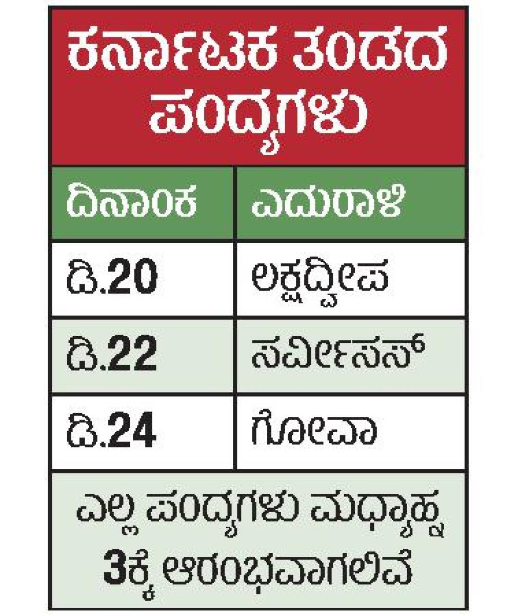 <p><strong>ಬೆಂಗಳೂರು:</strong> ಬೆಂಗಳೂರು ಯುನೈಟೆಡ್ ಫುಟ್ಬಾಲ್ ಕ್ಲಬ್ ತಂಡದ ನಿಖಿಲ್ ರಾಜ್ ಮುರುಗೇಶ್ ಅವರು ‘ಸಂತೋಷ್ ಟ್ರೋಫಿ’ಗಾಗಿ ನಡೆಯಲಿರುವ 79ನೇ ಸೀನಿಯರ್ ಪುರುಷರ ರಾಷ್ಟ್ರೀಯ ಫುಟ್ಬಾಲ್ ಚಾಂಪಿಯನ್ಷಿಪ್ನಲ್ಲಿ ರಾಜ್ಯ ತಂಡವನ್ನು ಮುನ್ನಡೆಸಲಿದ್ದಾರೆ. ಟೂರ್ನಿಯು ಬೆಂಗಳೂರು ಫುಟ್ಬಾಲ್ ಕ್ರೀಡಾಂಗಣದಲ್ಲಿ ಡಿಸೆಂಬರ್ 20ರಿಂದ (ಶನಿವಾರ) 24ರ ವರೆಗೆ ನಡೆಯಲಿದೆ.</p>.<p>ಕರ್ನಾಟಕ ರಾಜ್ಯ ಫುಟ್ಬಾಲ್ ಅಸೋಸಿಯೇಶನ್ ಗುರುವಾರ ಪ್ರಕಟಿಸಿರುವ ರಾಜ್ಯ ತಂಡ ಹೀಗಿದೆ: </p>.<p>ಸುಜಯ್ ಎಸ್., ಸುಬ್ರಹ್ಮಣ್ಯಂ, ಕಿರಣ್ ಶರವಣನ್, ರಾಜಿಲ್ ಸಜಿ, ಅಜಿತ್ ಅರಸು, ಅರ್ಜುನ್ ಗೌಡ, ಅಬಿ ಎಸ್., ಅರವಿಂದ್ ಬಾಬು ಜಿ., ಅರುಣ್ ಕುಮಾರ್ ಡಿ., ಕಾರ್ತಿಕ್ ಗೋವಿಂದಸ್ವಾಮಿ, ವಿಶಾಲ್ ಆರ್., ಮಂಗ್ಲೆಂಥಂಗ್ ಸಿಂಗಸಿತ್, ಧನುಷ್ ಆರ್., ಶ್ರೇಯಸ್ ಕೆ., ಗಾಡ್ವಿನ್ ಜಾಸನ್, ಸಿ.ರೋಹನ್ ಸಿಂಗ್, ಕ್ರಿಸ್ಪಿನ್ ಸಿ. ಕ್ಲೀಟಸ್, ನಿಖಿಲ್ ರಾಜ್ ಮುರುಗೇಶ್ (ನಾಯಕ), ಮ್ಯಾಕರ್ಟನ್ ಲೂಯಿಸ್ ಹಾಗೂ ನಿಕ್ಸನ್.</p>.<p>ಮುಖ್ಯ ಕೋಚ್: ರವಿಬಾಬು ರಾಜು, ಸಹಾಯಕ ಕೋಚ್: ಸಿ.ಚಂದ್ರಶೇಖರ್ ರಾವ್, ಮ್ಯಾನೇಜರ್: ಬಿ.ಭಟ್ಟಾಚಾರ್ಜೀ.</p>.<p><strong>ಕರ್ನಾಟಕ ತಂಡದ ಪಂದ್ಯಗಳು</strong></p>.<p>ದಿನಾಂಕ;ಎದುರಾಳಿ</p>.<p>ಡಿ.20;ಲಕ್ಷದ್ವೀಪ</p>.<p>ಡಿ.22;ಸರ್ವೀಸಸ್</p>.<p>ಡಿ.24;ಗೋವಾ</p>.<p>ಎಲ್ಲ ಪಂದ್ಯಗಳು ಮಧ್ಯಾಹ್ನ 3ಕ್ಕೆ ಆರಂಭವಾಗಲಿವೆ.</p>.<div><p><strong>ಪ್ರಜಾವಾಣಿ ಆ್ಯಪ್ ಇಲ್ಲಿದೆ: <a href="https://play.google.com/store/apps/details?id=com.tpml.pv">ಆಂಡ್ರಾಯ್ಡ್ </a>| <a href="https://apps.apple.com/in/app/prajavani-kannada-news-app/id1535764933">ಐಒಎಸ್</a> | <a href="https://whatsapp.com/channel/0029Va94OfB1dAw2Z4q5mK40">ವಾಟ್ಸ್ಆ್ಯಪ್</a>, <a href="https://www.twitter.com/prajavani">ಎಕ್ಸ್</a>, <a href="https://www.fb.com/prajavani.net">ಫೇಸ್ಬುಕ್</a> ಮತ್ತು <a href="https://www.instagram.com/prajavani">ಇನ್ಸ್ಟಾಗ್ರಾಂ</a>ನಲ್ಲಿ ಪ್ರಜಾವಾಣಿ ಫಾಲೋ ಮಾಡಿ.</strong></p></div>