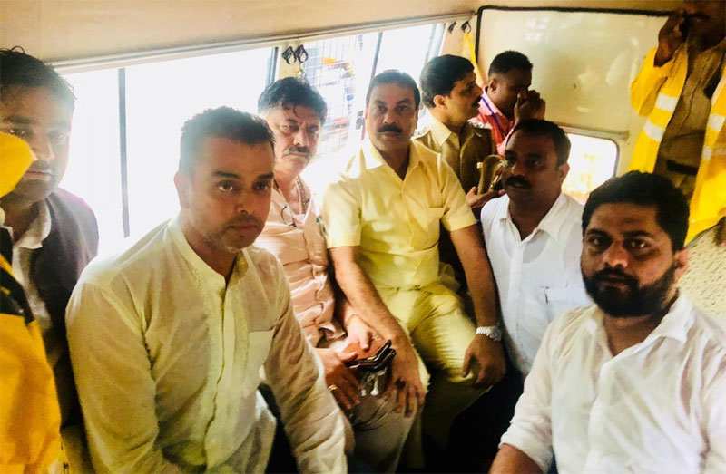 Mumbai: #Karnataka Minister DK Shivakumar, Milind Deora & other Congress leaders who were detained, have been kept at Kalina University rest house. They were sitting outside Renaissance - Mumbai Convention Centre Hotel when they were detained by police. pic.twitter.com/K2EgyB3O6f
