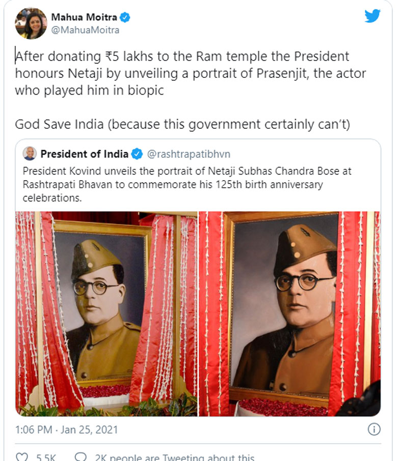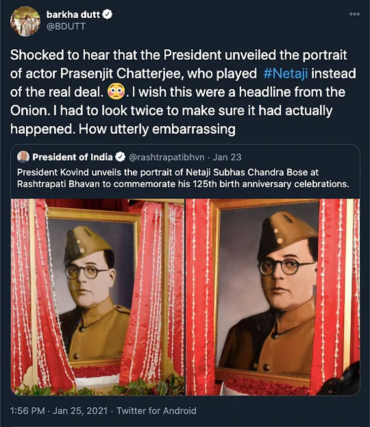 This is unbelievably hilarious. The Portrait that President of India Unveiled, it is is of Actor Prosenjit who played role of Netaji (Look at Eyes). That’s like unveiling Portrait of Ajay Devgan as Bhagat Singh https://t.co/voRxerFmoU